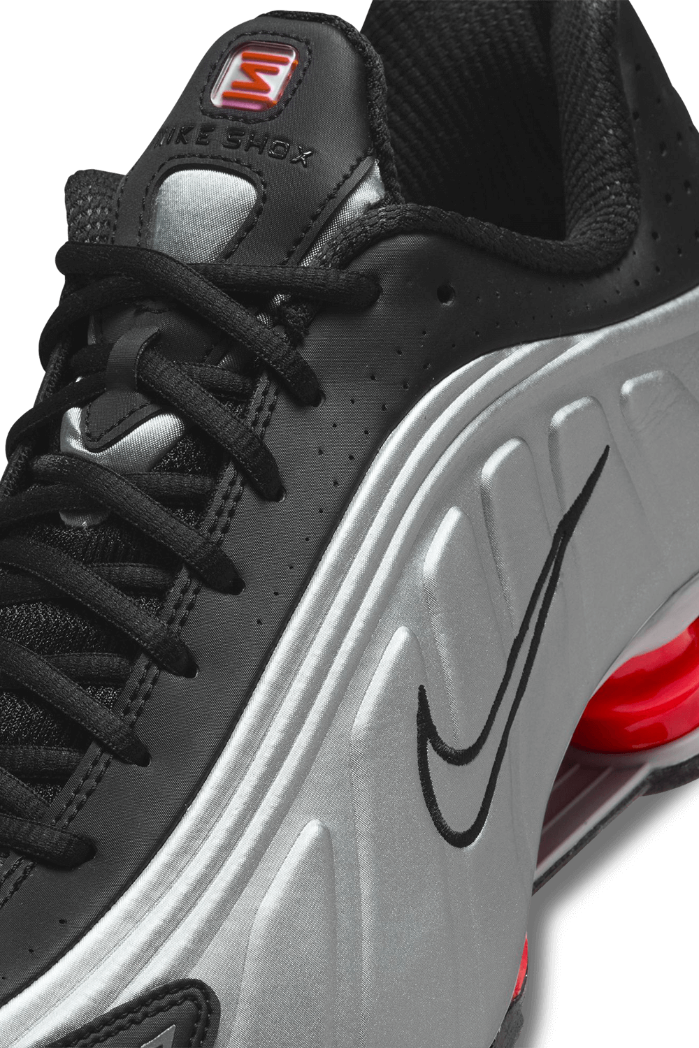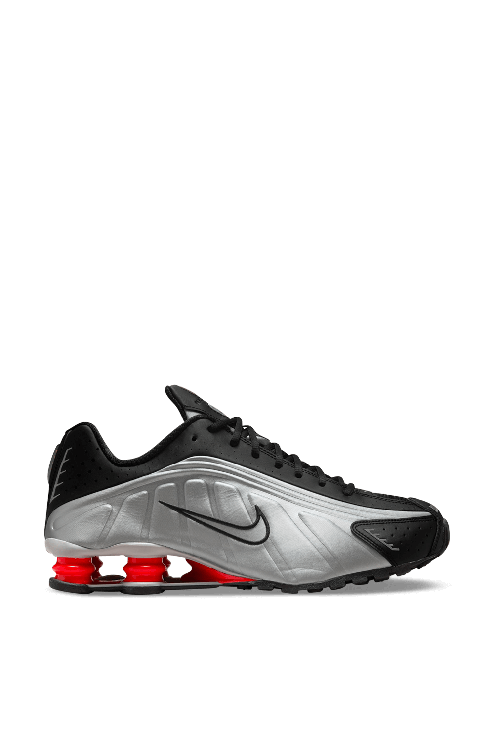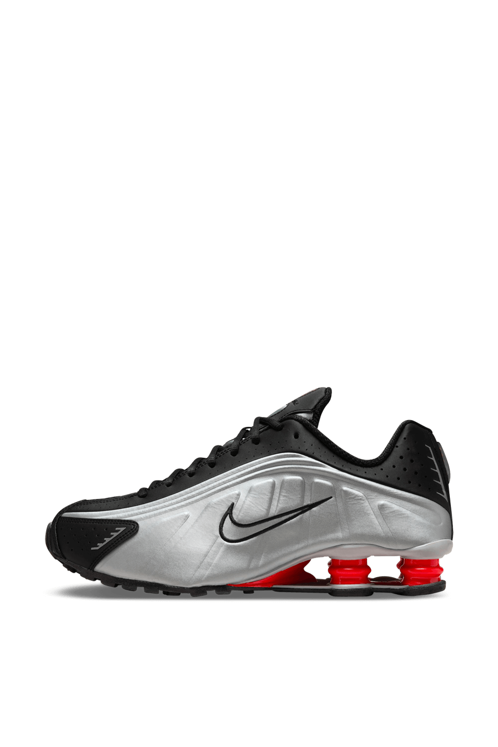 נעלי סניקרס Nike Shox R4, עשויות עור טבעוני בעיצוב לייזר בצבעי כסף, שחור ואדום. ארבעה מבני קפיצים ממוקמים באזור העקב מעניקים לנעל מבנה גמיש אך יציב.
