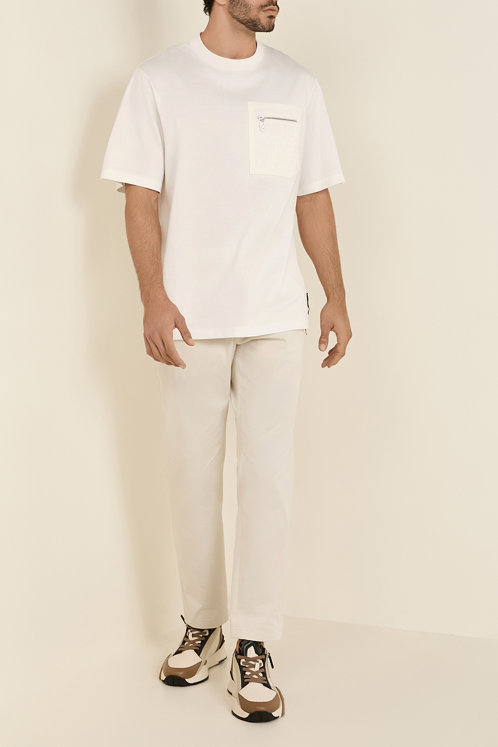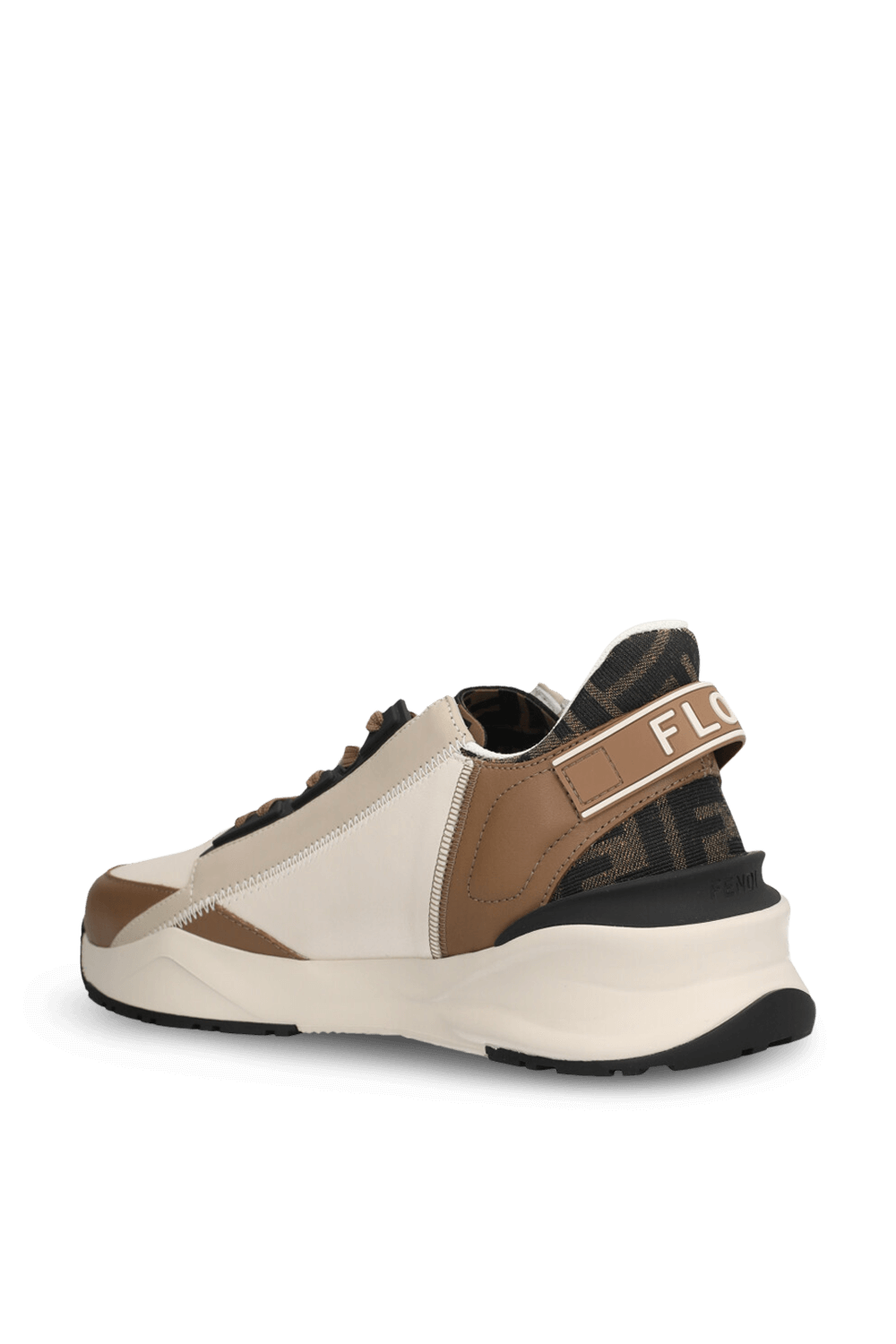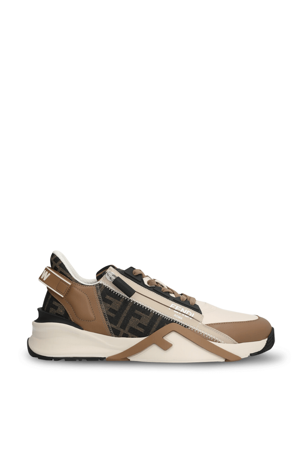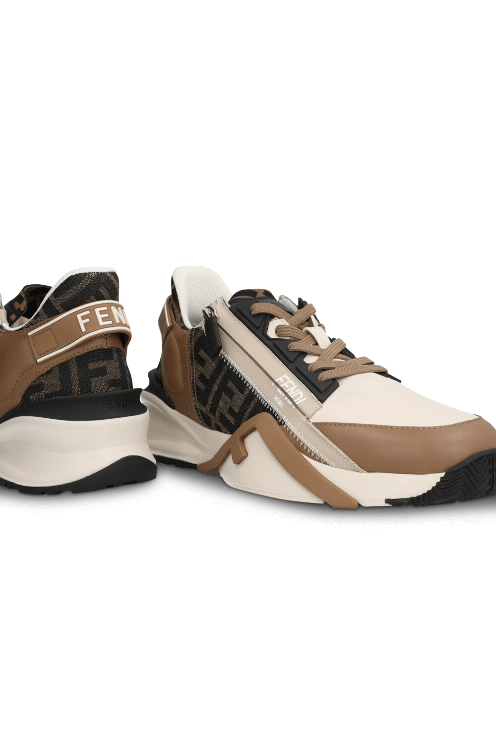 נעלי סניקרס מבית Fendi, תוצרת איטליה, עשויות תערובת עור ואריגת ג'קארד בצבעי חום ובז' בשילוב רקמת מונוגרמה בצדדים עם רוכסנים.