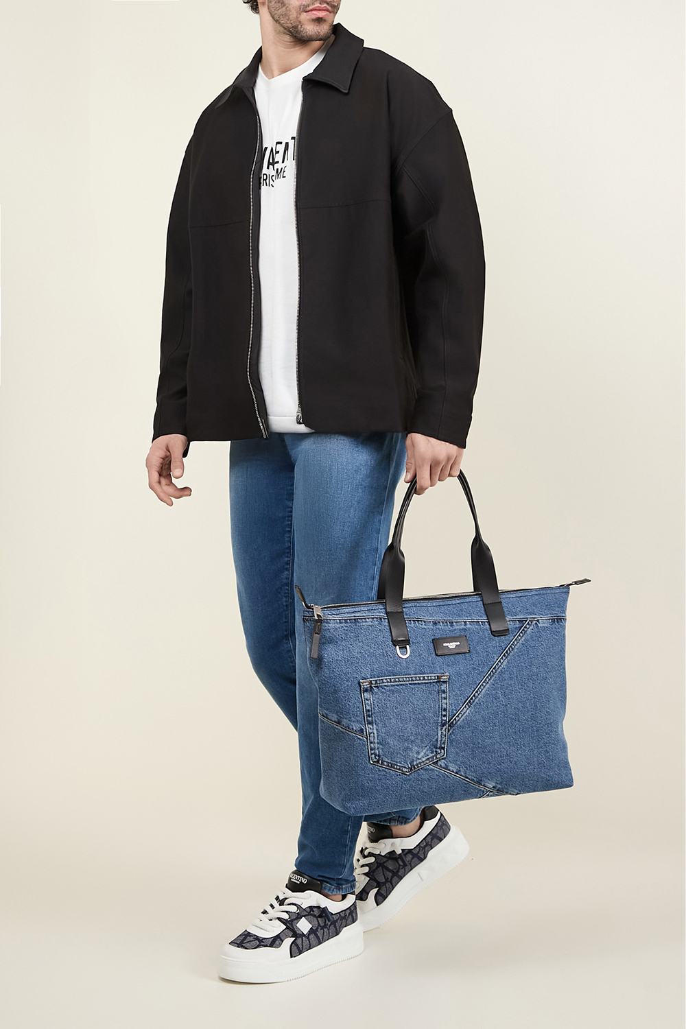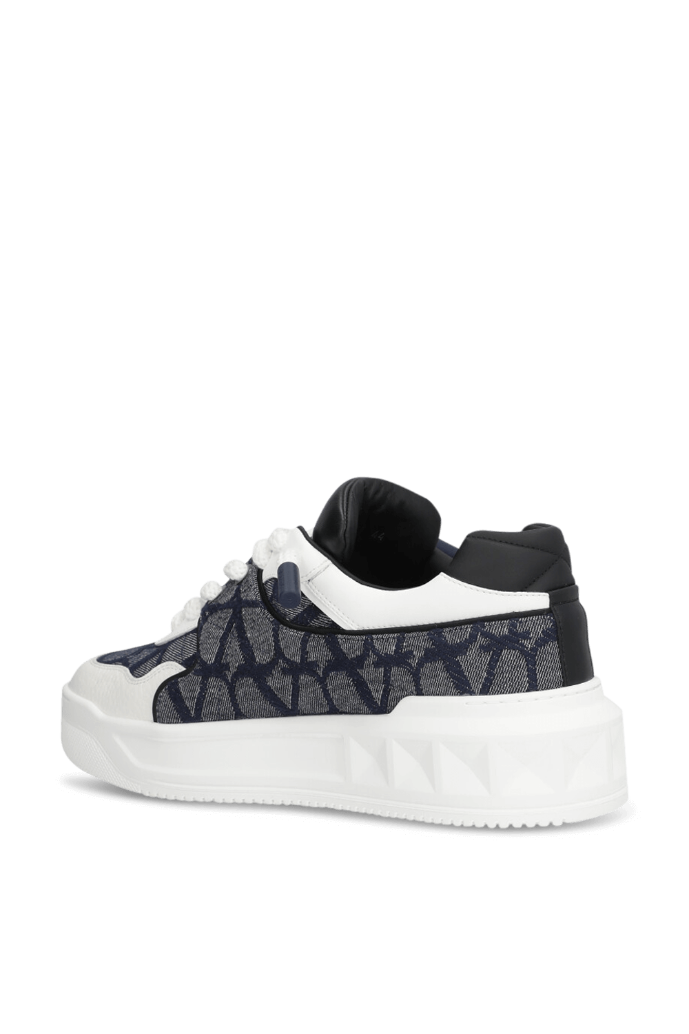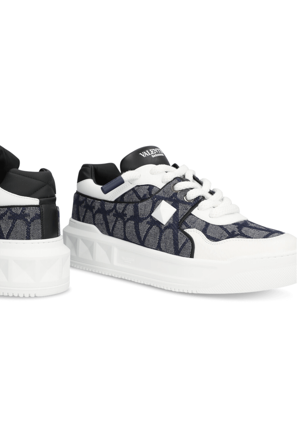 נעלי סניקרס דגם ONE STUD XL מבית Valentino. הן עשויות עור לבן בשילוב בד ז'קרד בצבעי כחול כהה ולבן בדוגמת VLOGO. הדיטיילים מעוצבים להפליא - השרוכים והסוליה בעיצוב צ'אנקי, עם וריאציות של הניטים האייקונים על הסוליה ועל הנעל.