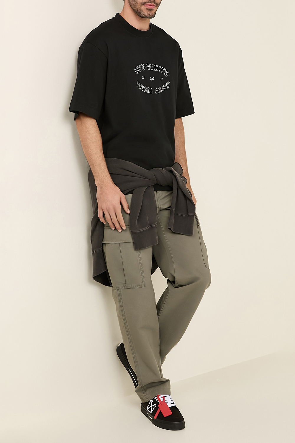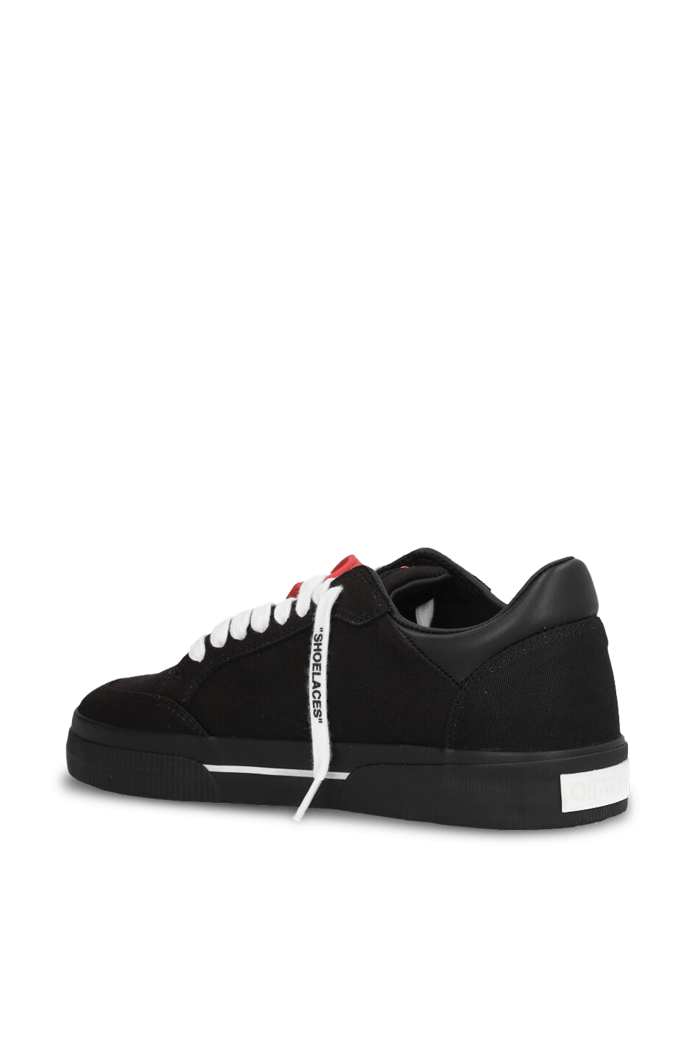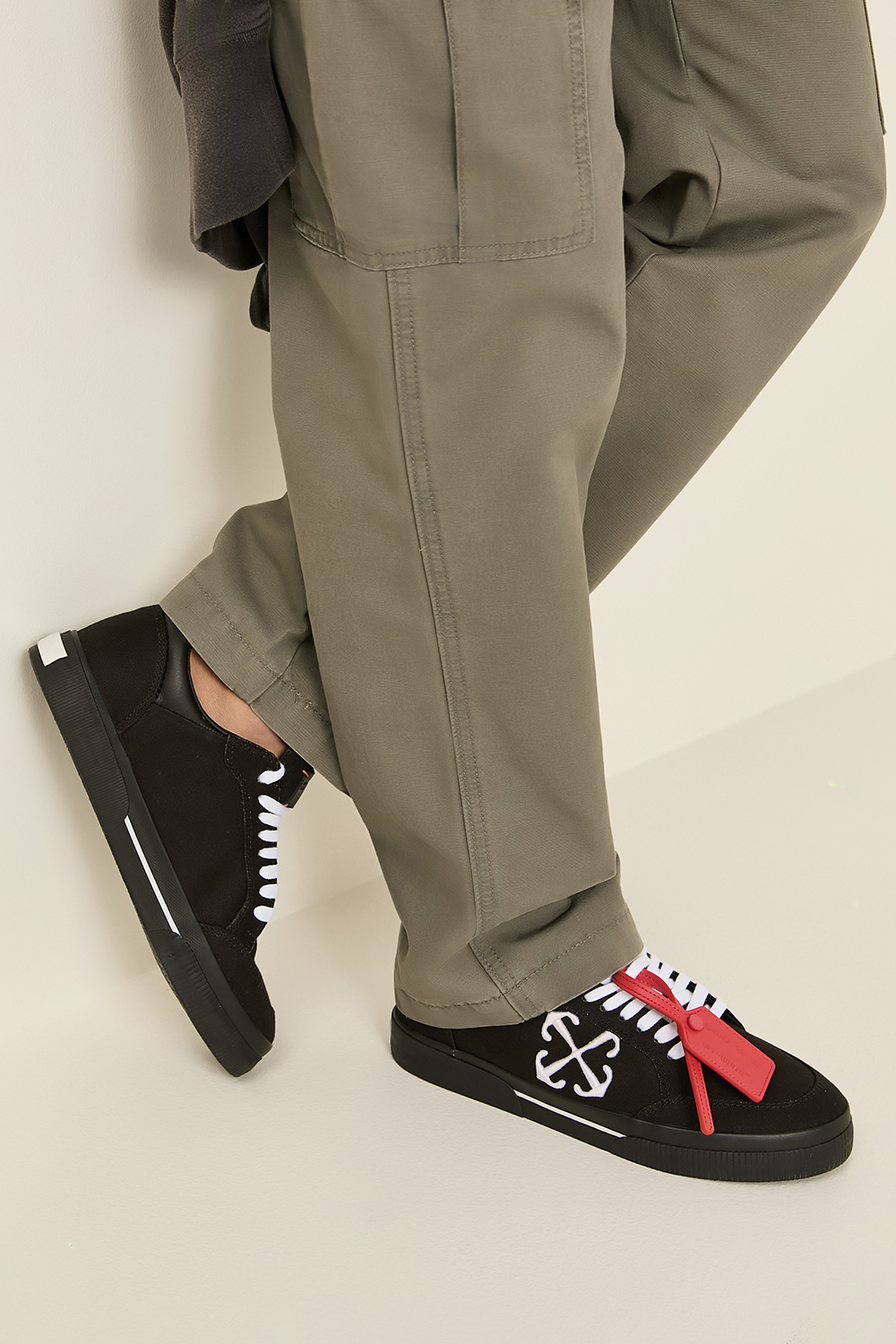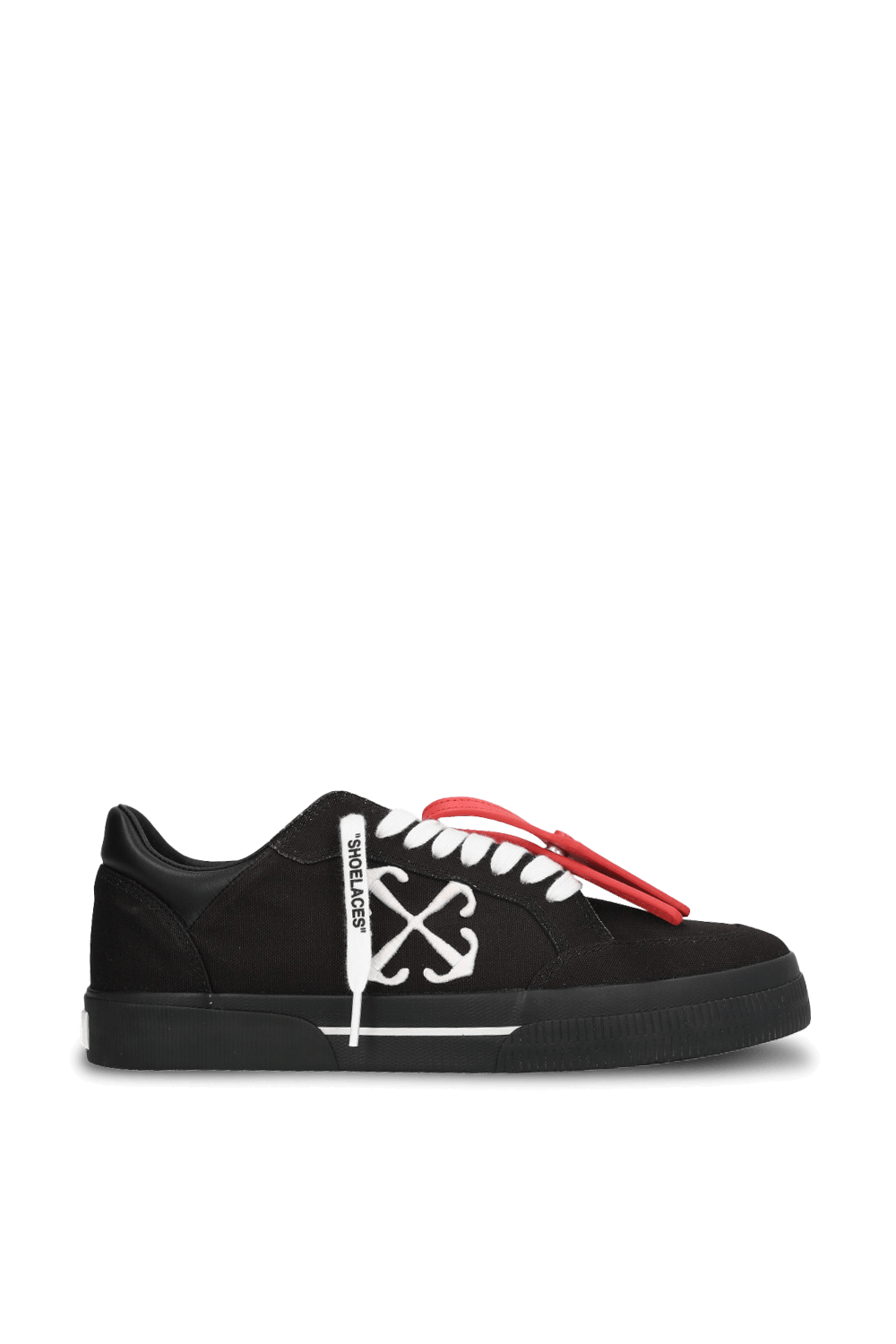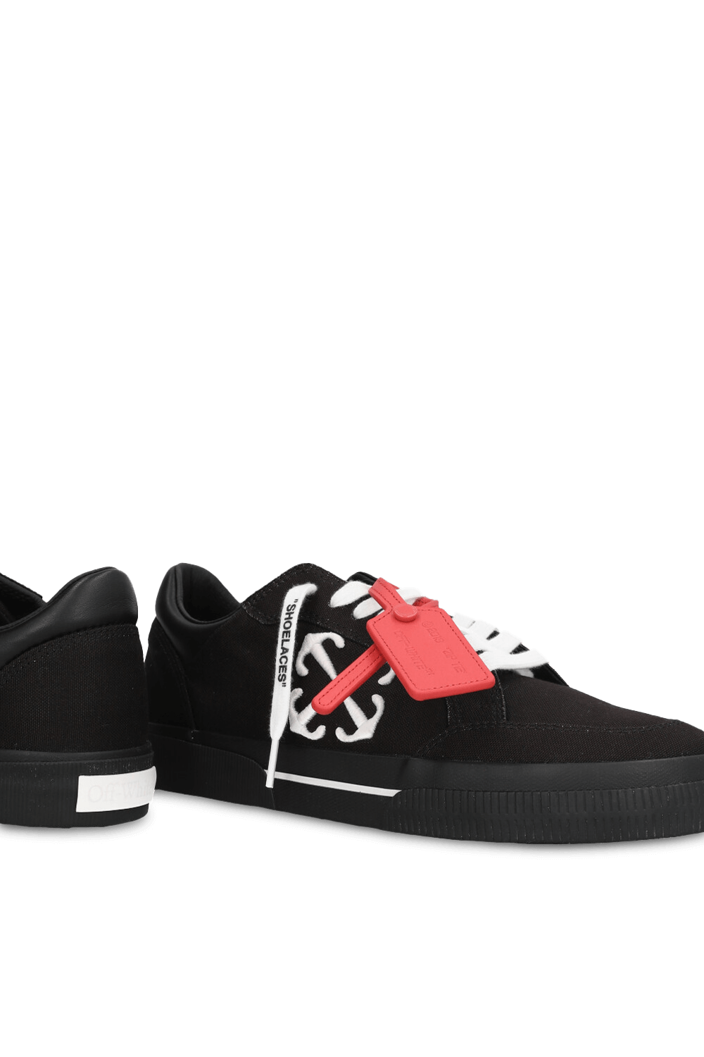 נעלי סניקרס מבית Off White, עשויות תערובת ליוסל, כותנת קנבס ועור בצבע שחור בשילוב עיצוב החצים האייקונים בצדדים עם תגית אדומה סביב השרוכים.