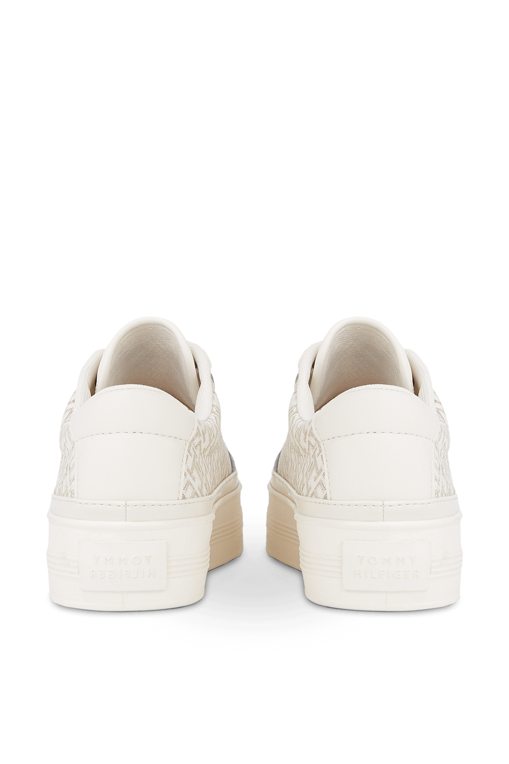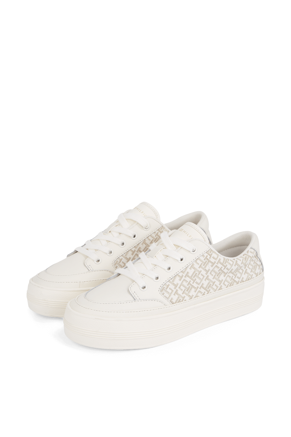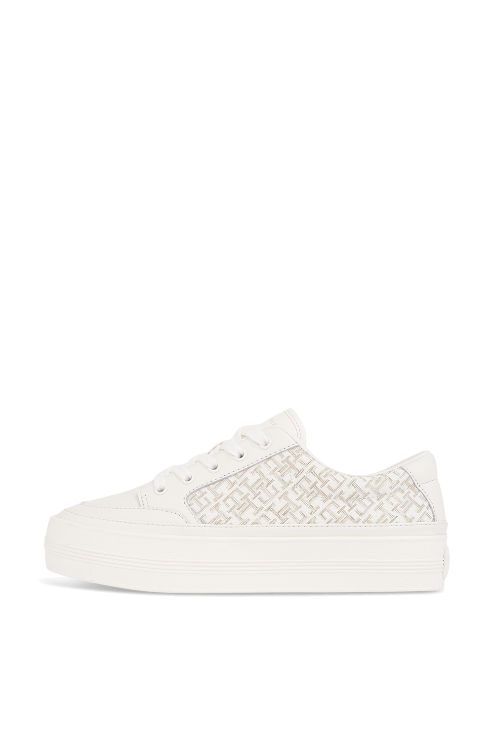 נעלי סניקרס מבית Tommy Hilfiger, עשויות עור בצבע לבן בשילוב רקמות לוגו חזרתיות בצדדים עם סוליית פלטפורמה.