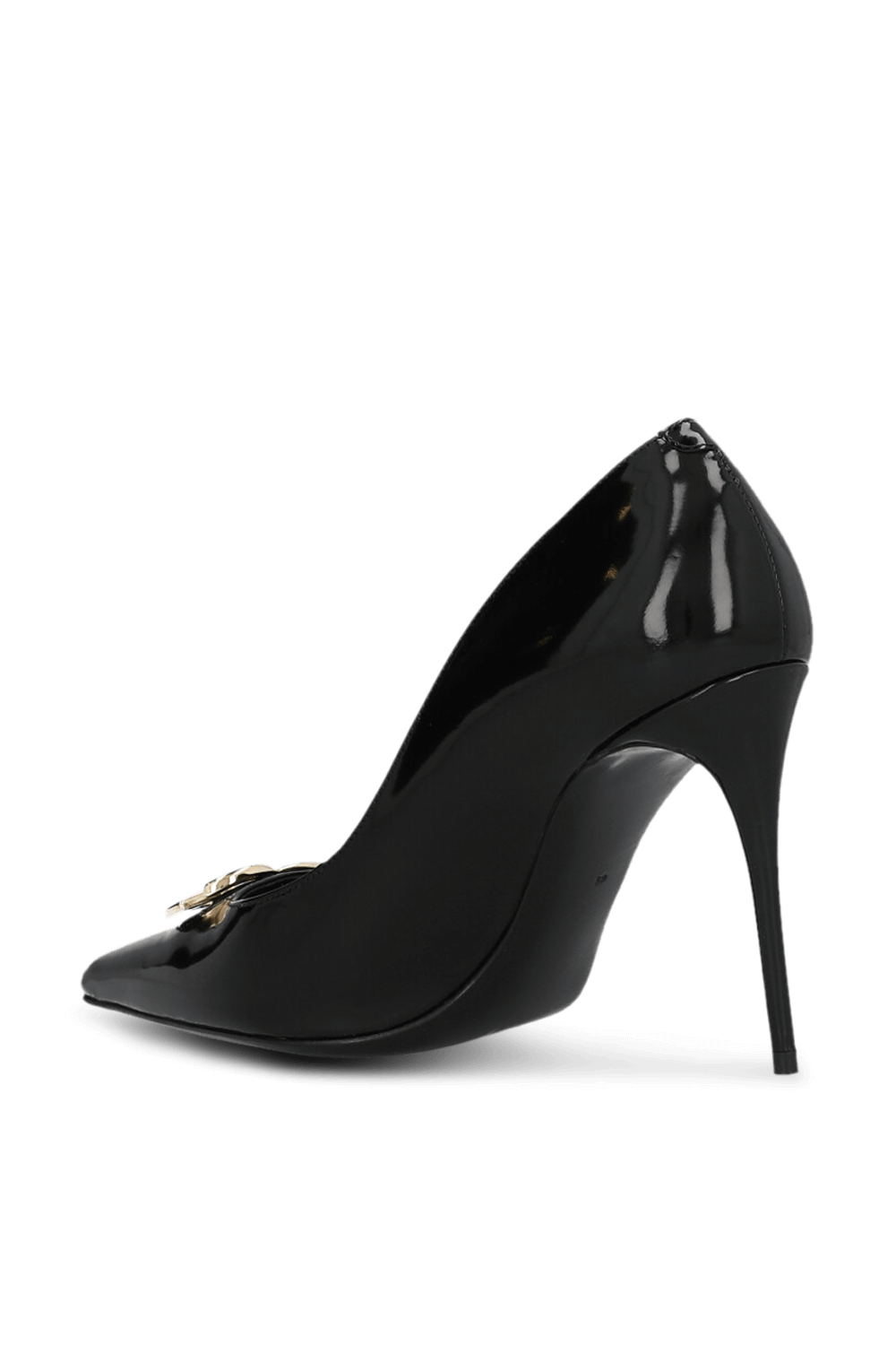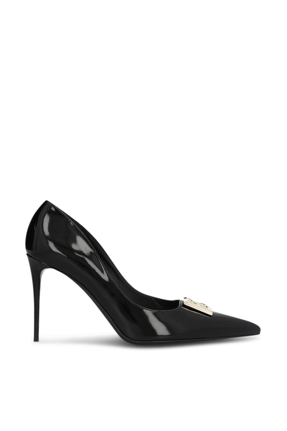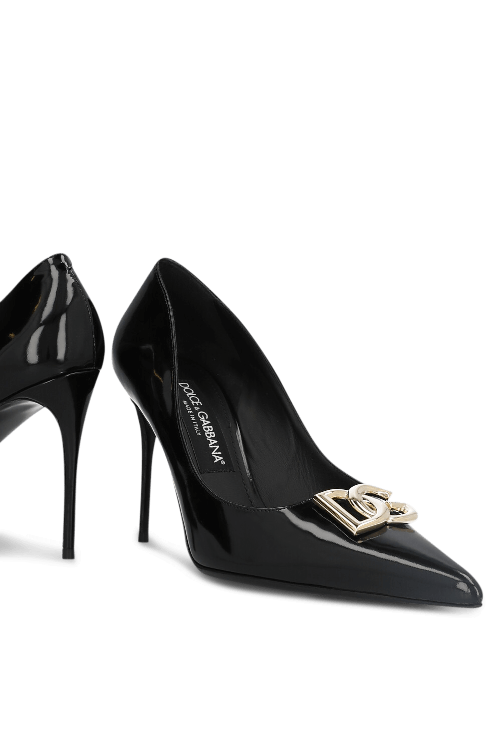 נעלי עקב מבית Dolce&Gabbana, עשויות עור בצבע שחור עם סיומת מחודדת בשילוב אלמנט לוגו מטאלי זהוב בחזית.