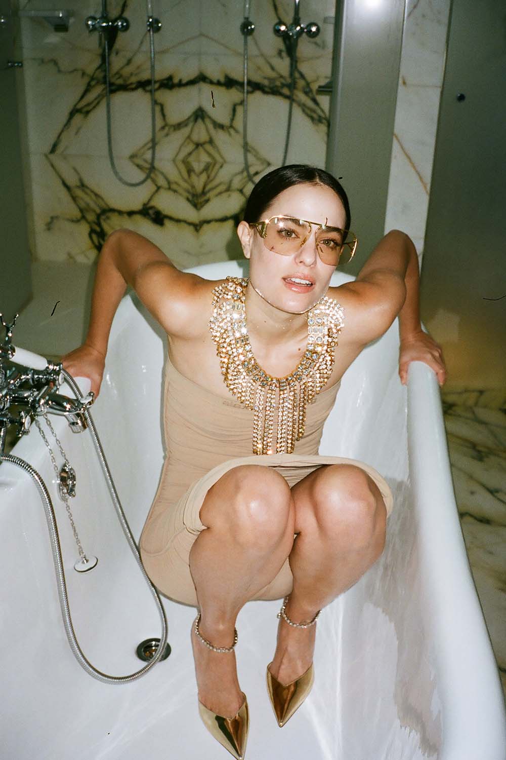 נעלי עקב עם רצועה משובצת קריסטלים בגוון זהוב