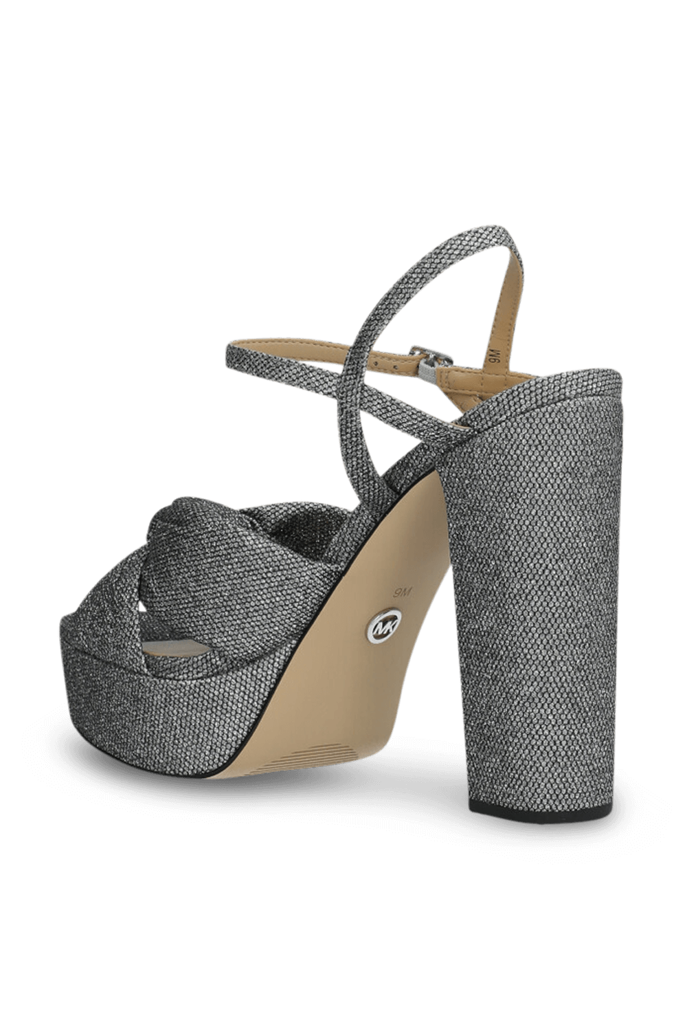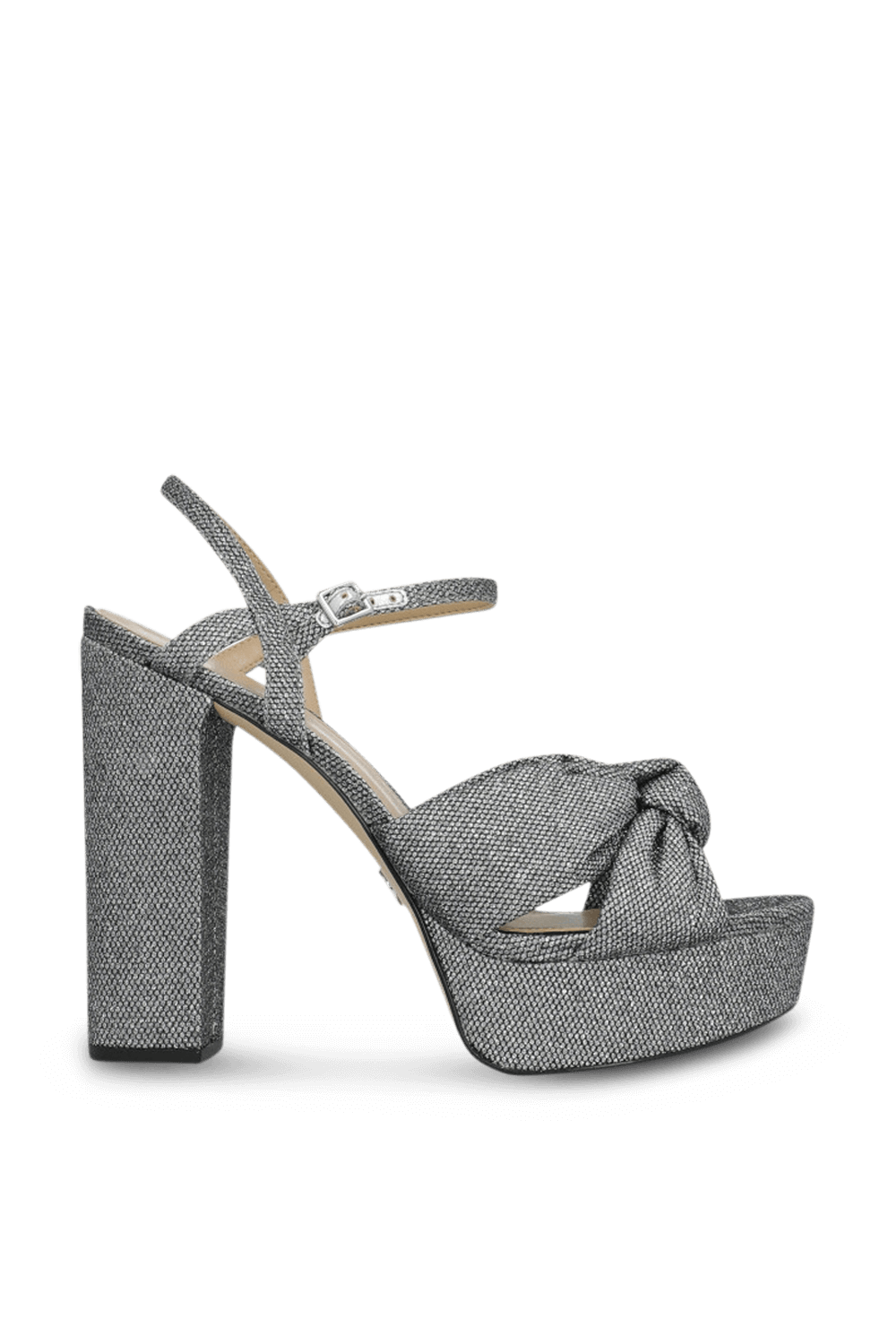 נעלי עקב פלטפורמה Josie מבית Michael Kors, עשויות טקסטיל בשיבוץ אבני כריסטל נוצצות בצבע כסוף. הנעליים בהשראת שנות ה70' עם פפיון בחזית, עקב פלטפורמה רחב ורצועת סנדל.