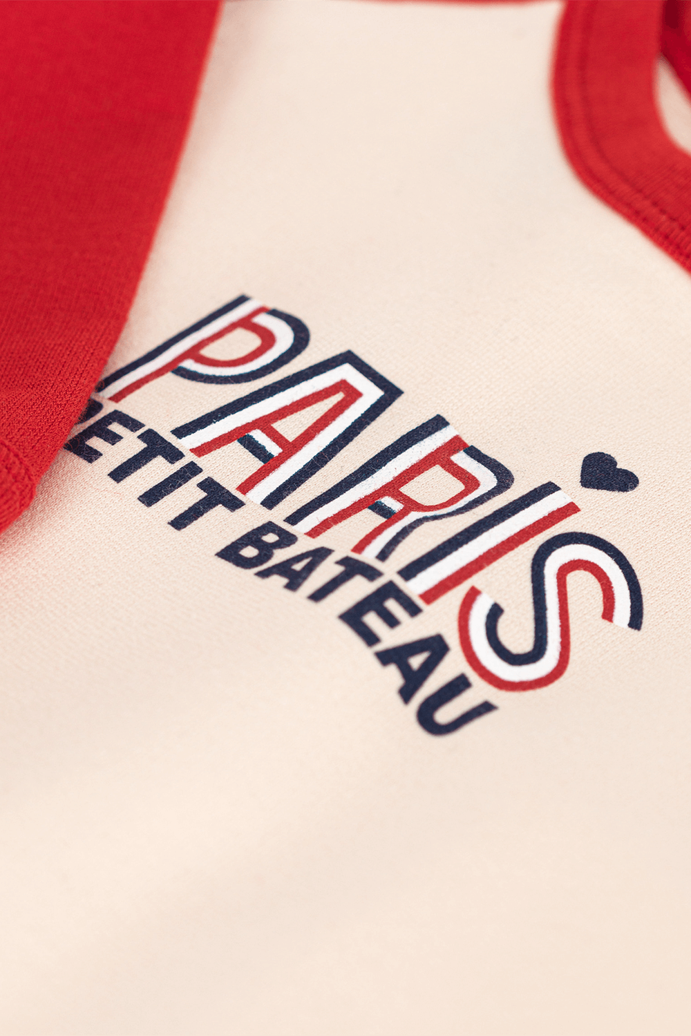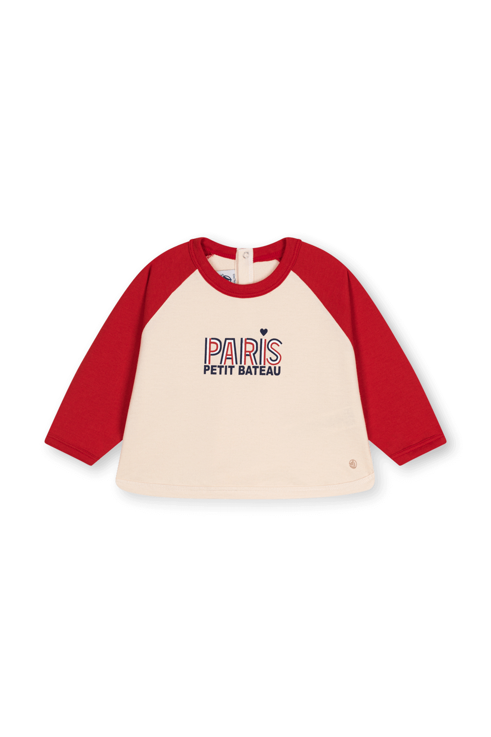 סווטישרט מקולקציית פריז מבית Petit Bateau, עשוי כותנת פרנץ' טרי אורגנית קלילה ואידיאלי לעונות המעבר, לערבי קיץ קרירים או לבילוי במזגן. הסווטשירט בצבע לבן, עם שרוולים אדומים ובכיתוב PARIS. יש לו שלושה כפתורי תיק תק בצד האחורי של הצווארון להלבשה קלה ונוחה.