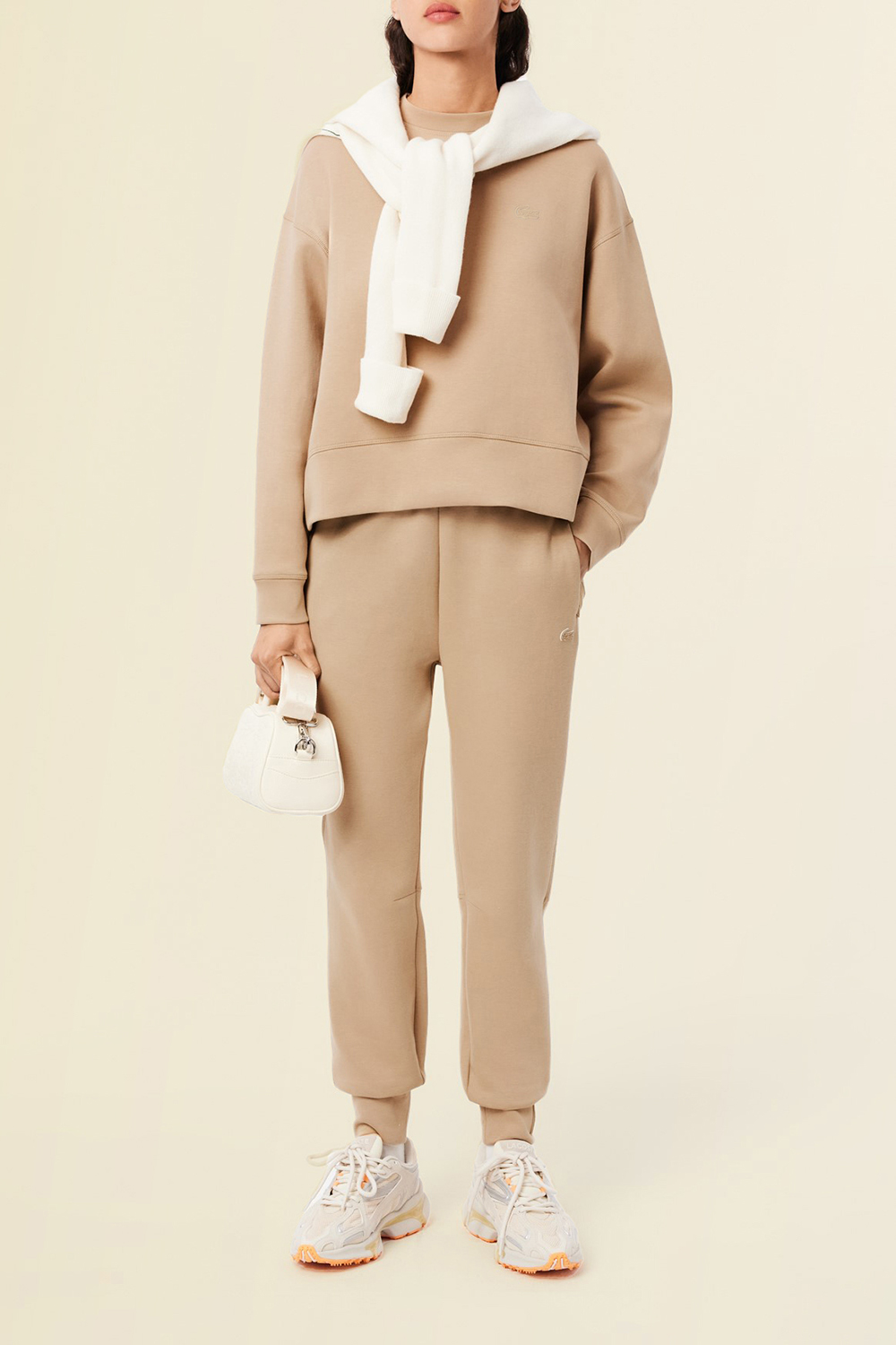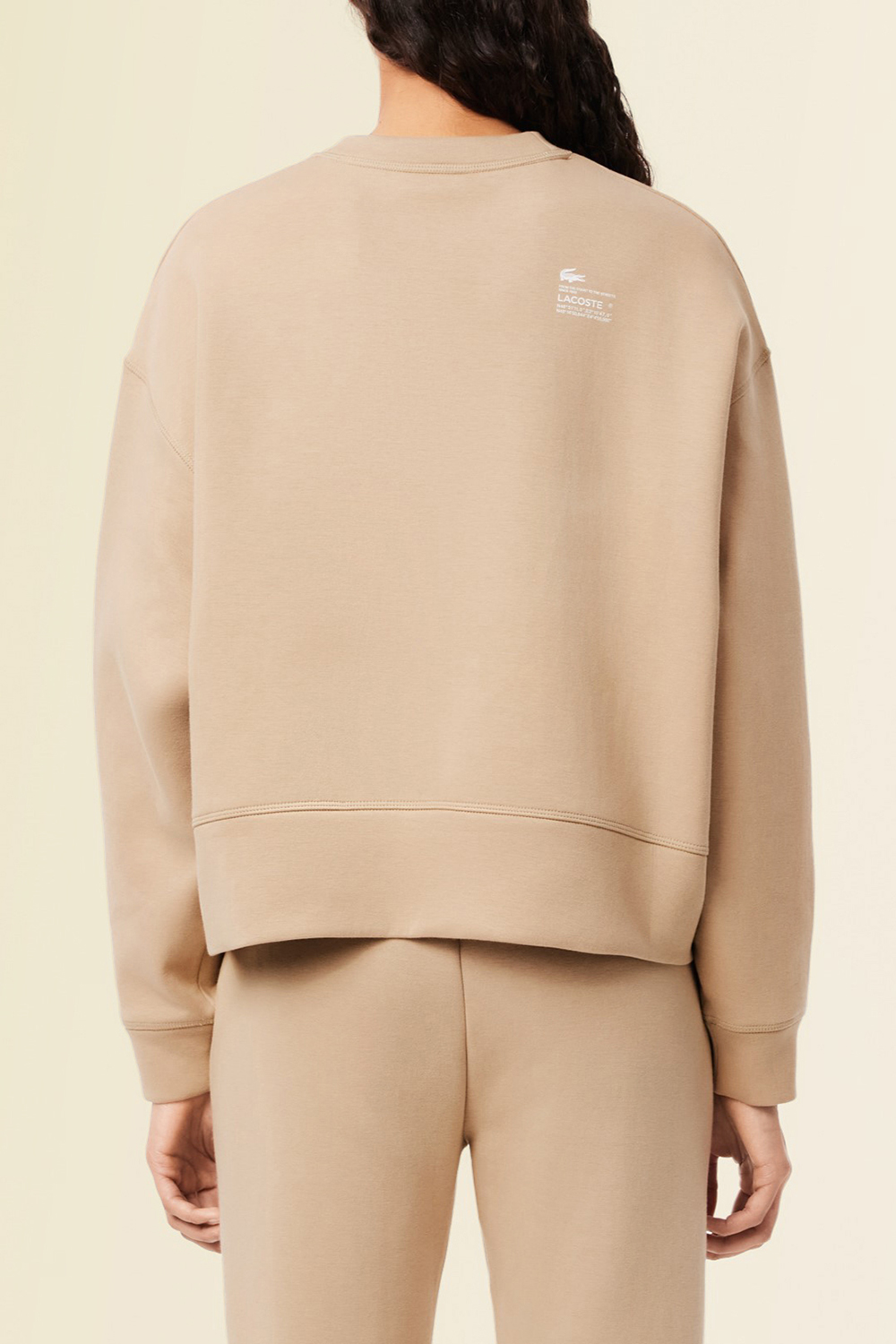 סווטשירט בגזרת אוברסייז מבית Lacoste, בעיצוב מינימליסטי ובהשראת שנות ה-90. הוא עשוי כותנה ופוליאסטר בצבע בז'. עם לוגו מקדימה ומאחור.