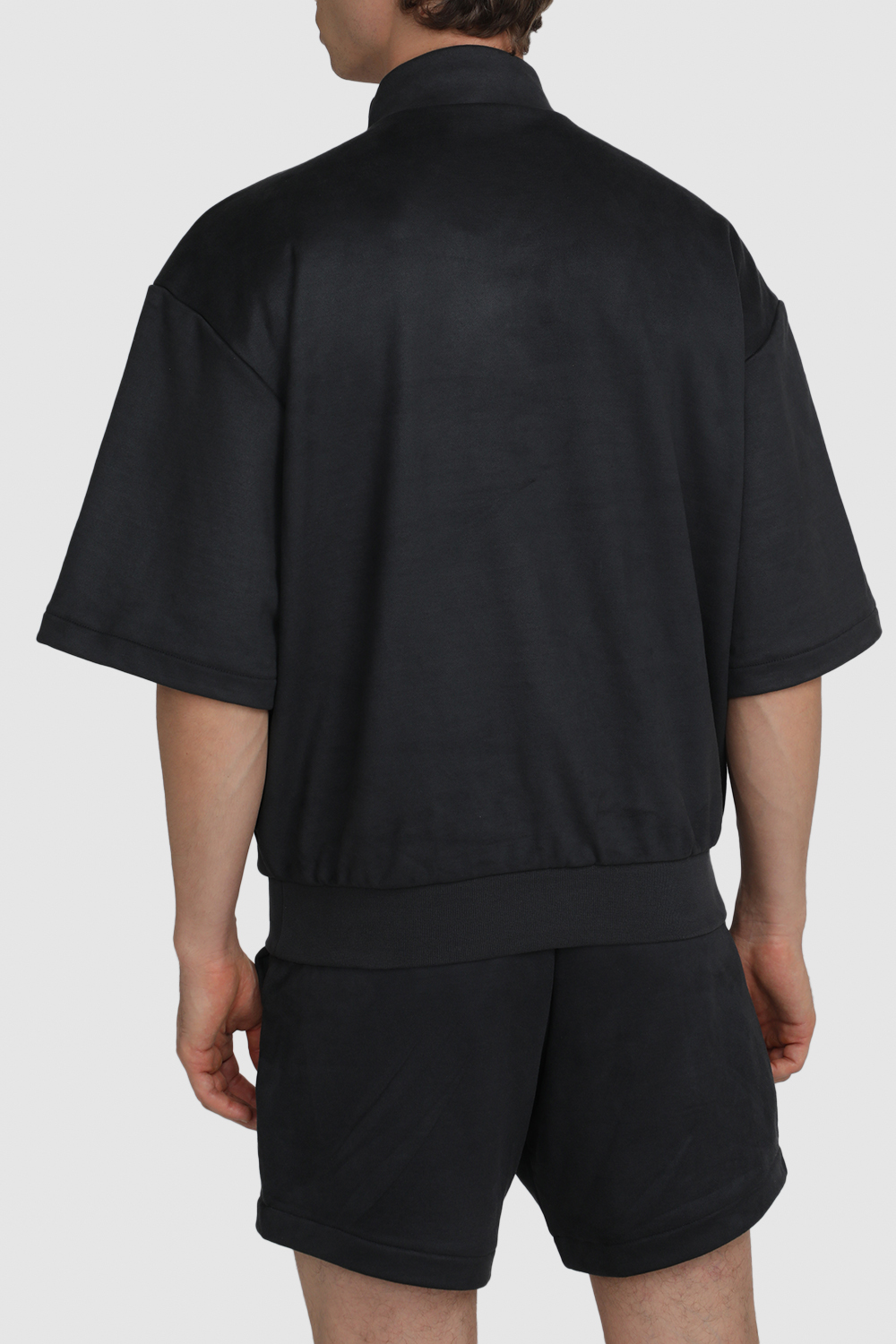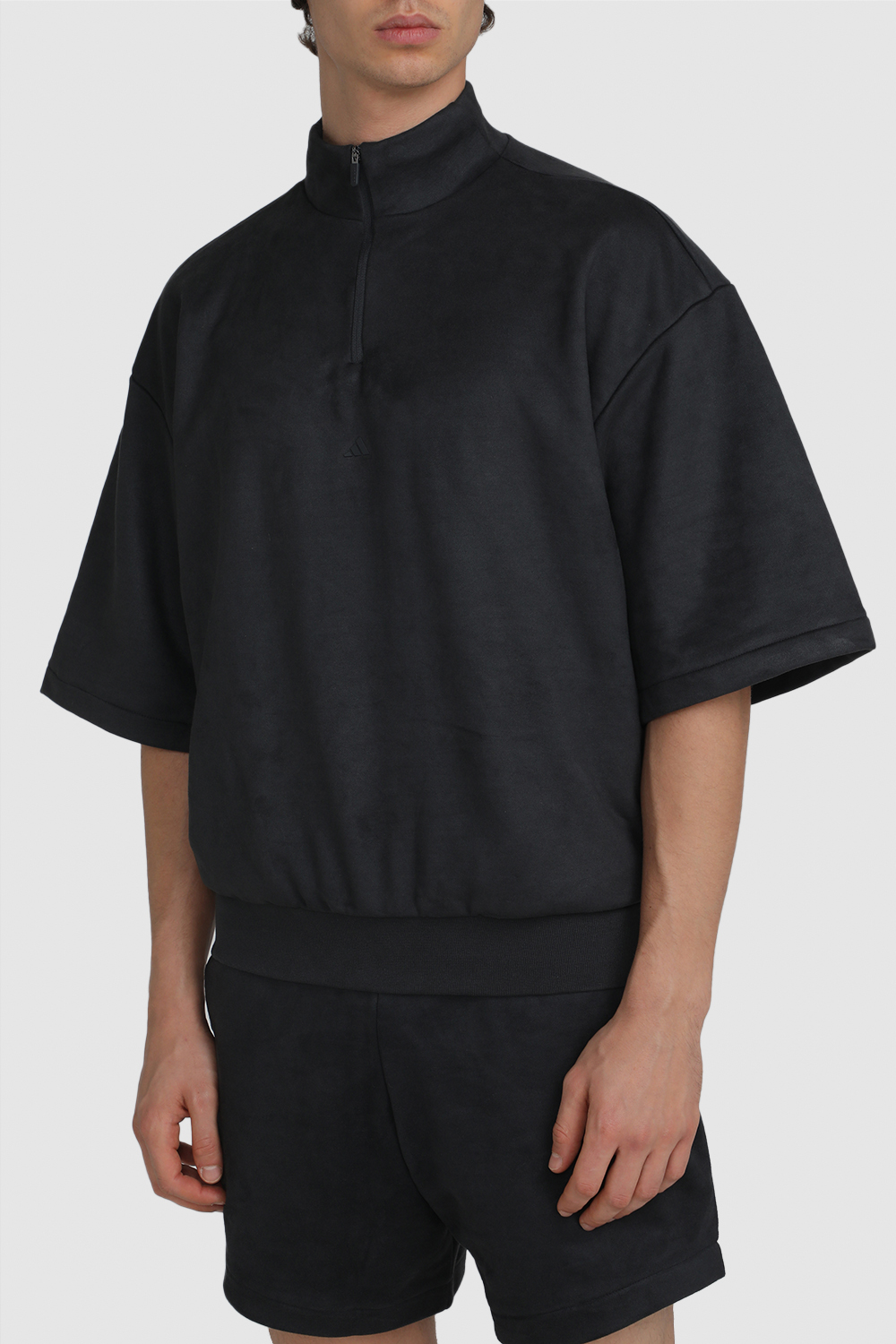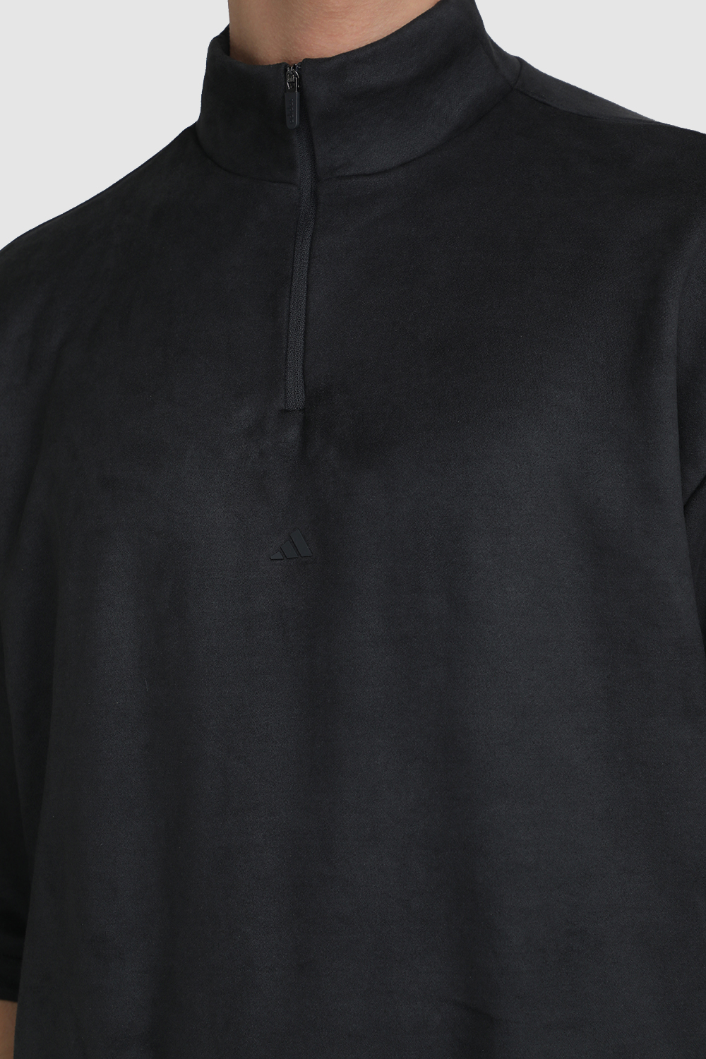 סווטשירט עם חצי רוכסן מבית Adidas, עשוי תערובת פוליאסטר ממוחזר וכותנה בצבע אפור כהה בשילוב שרוולים קצרים עם שני כיסי צד וחצי רוכסן בחזית.