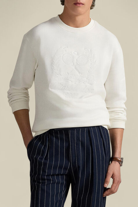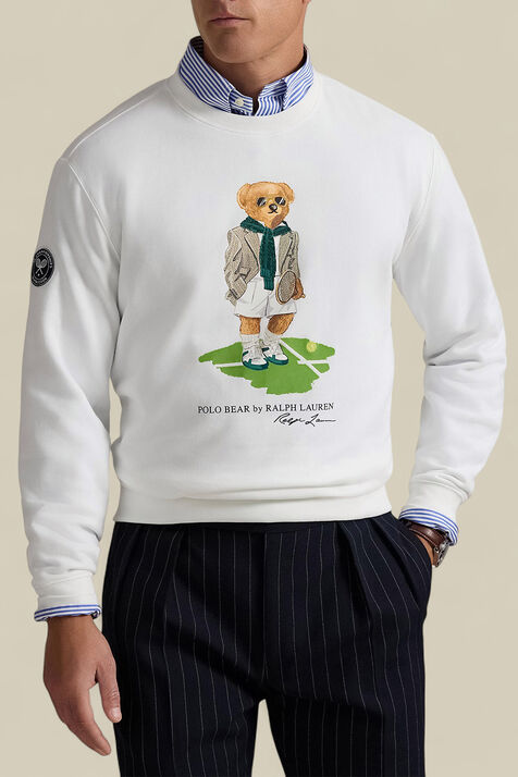 סווטשירט עם צווארון מעוגל מבית Polo Ralph Lauren, עשוי תערובת כותנה ופוליאסטר ממוחזר עם בטנת פליז מחממת בצבע אוף וייט עם הדובי האייקוני במרכז.