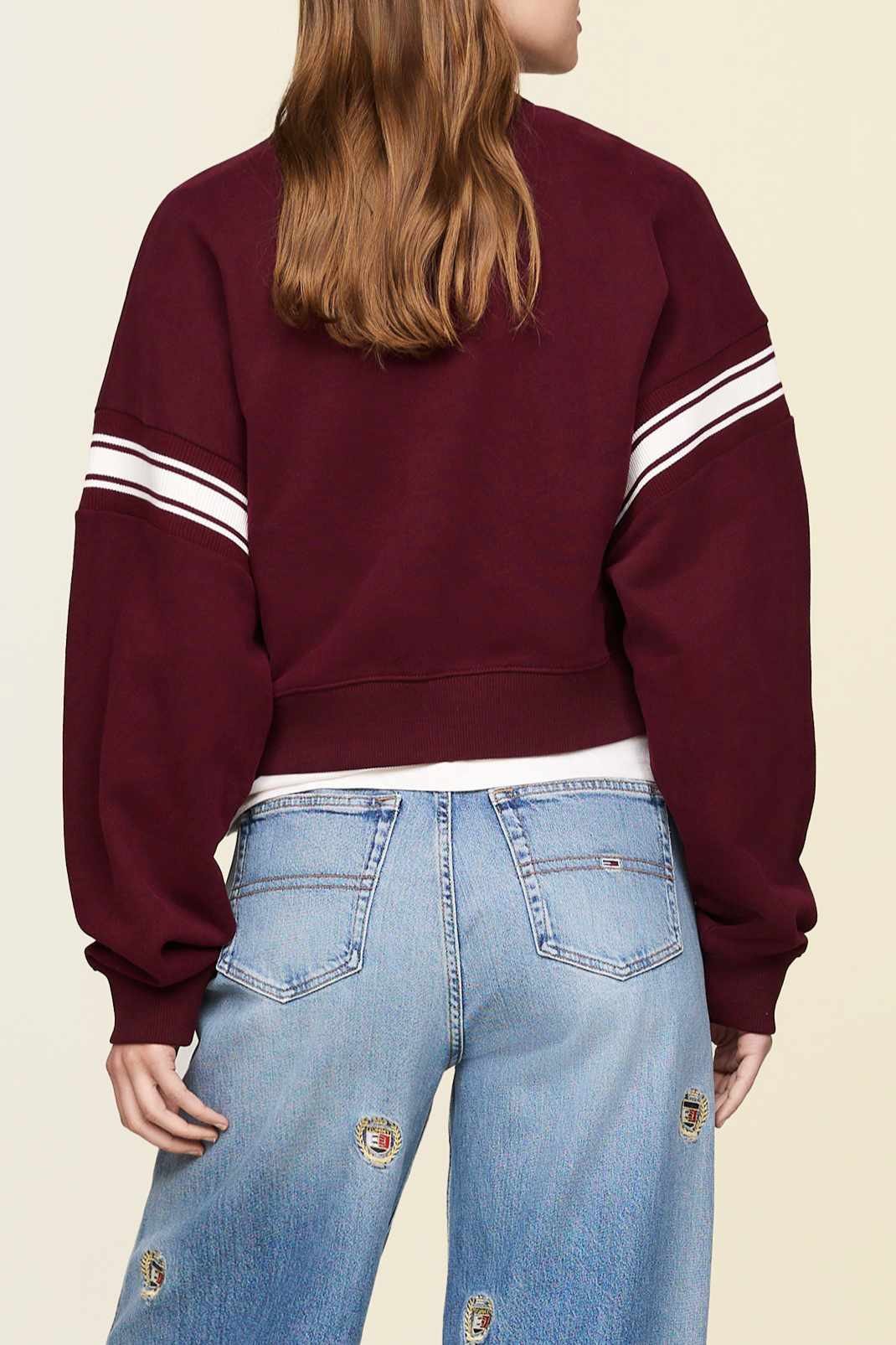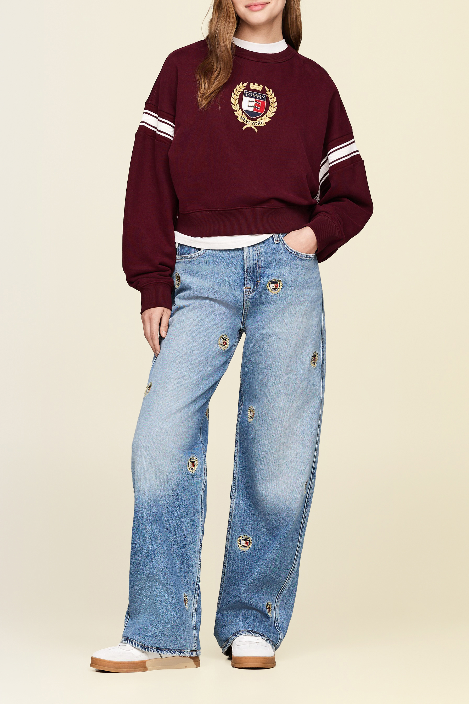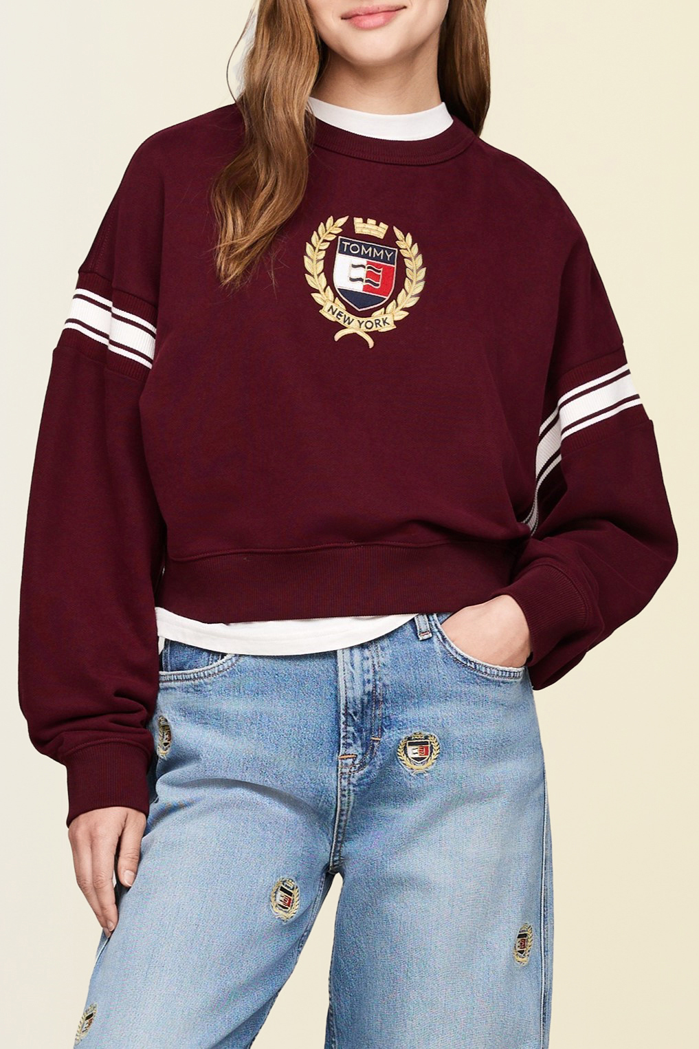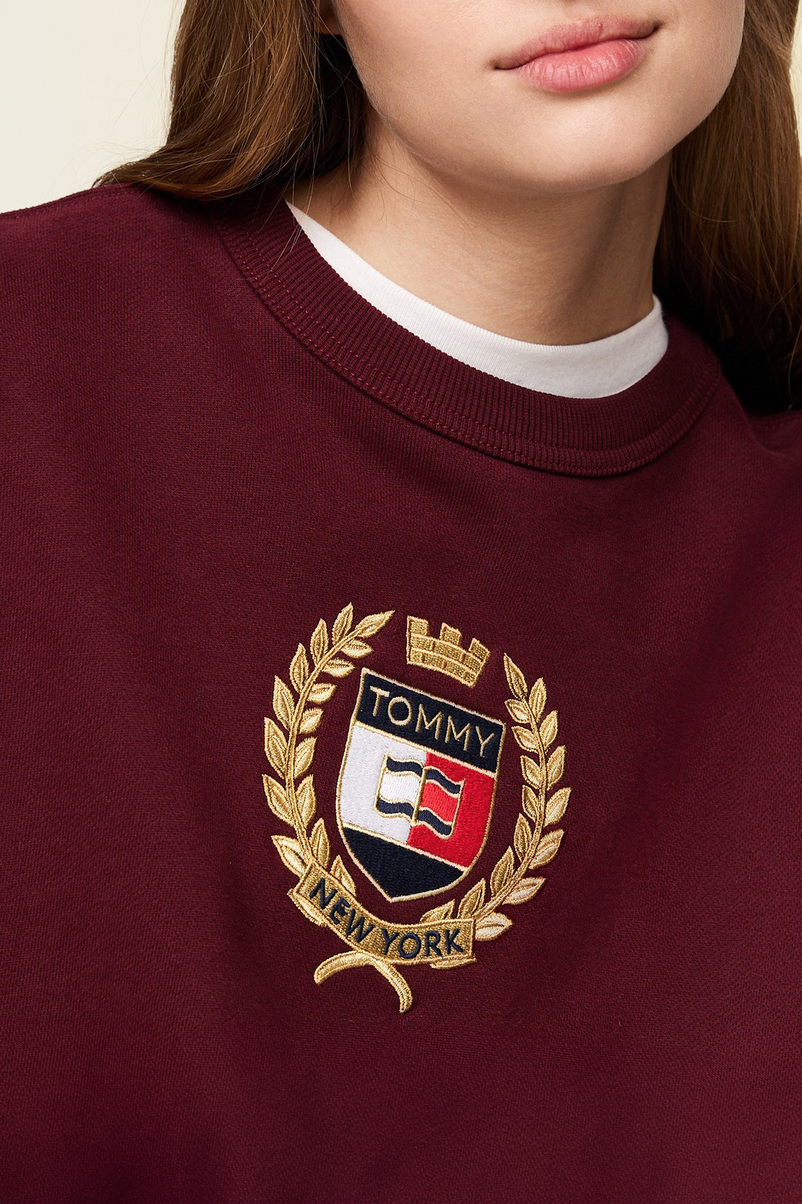 סווטשירט עם צווארון מעוגל מבית Tommy Hilfiger, עשוי כותנה מחודשת בצבע אדום בשילוב הדפס במרכז.