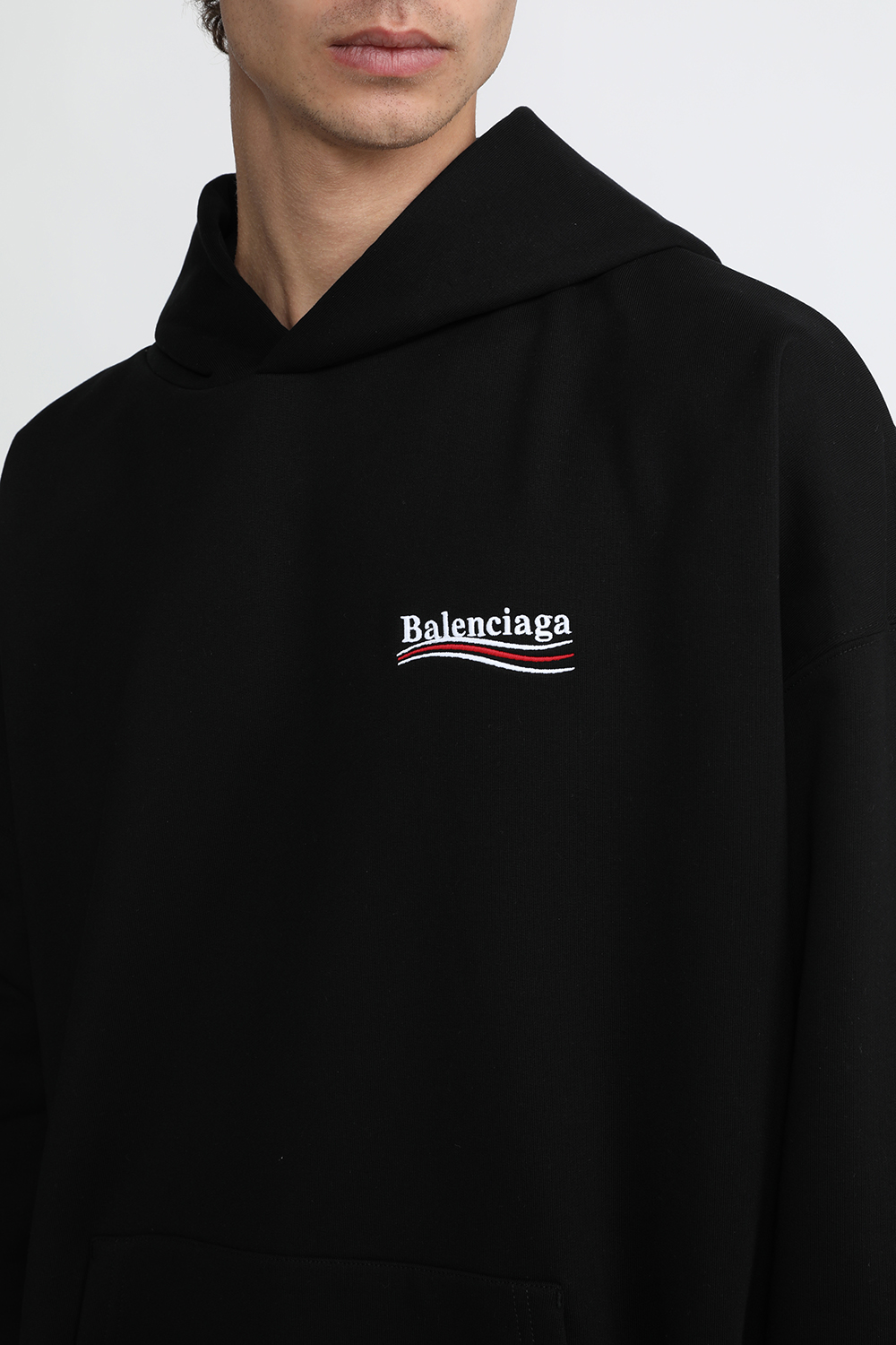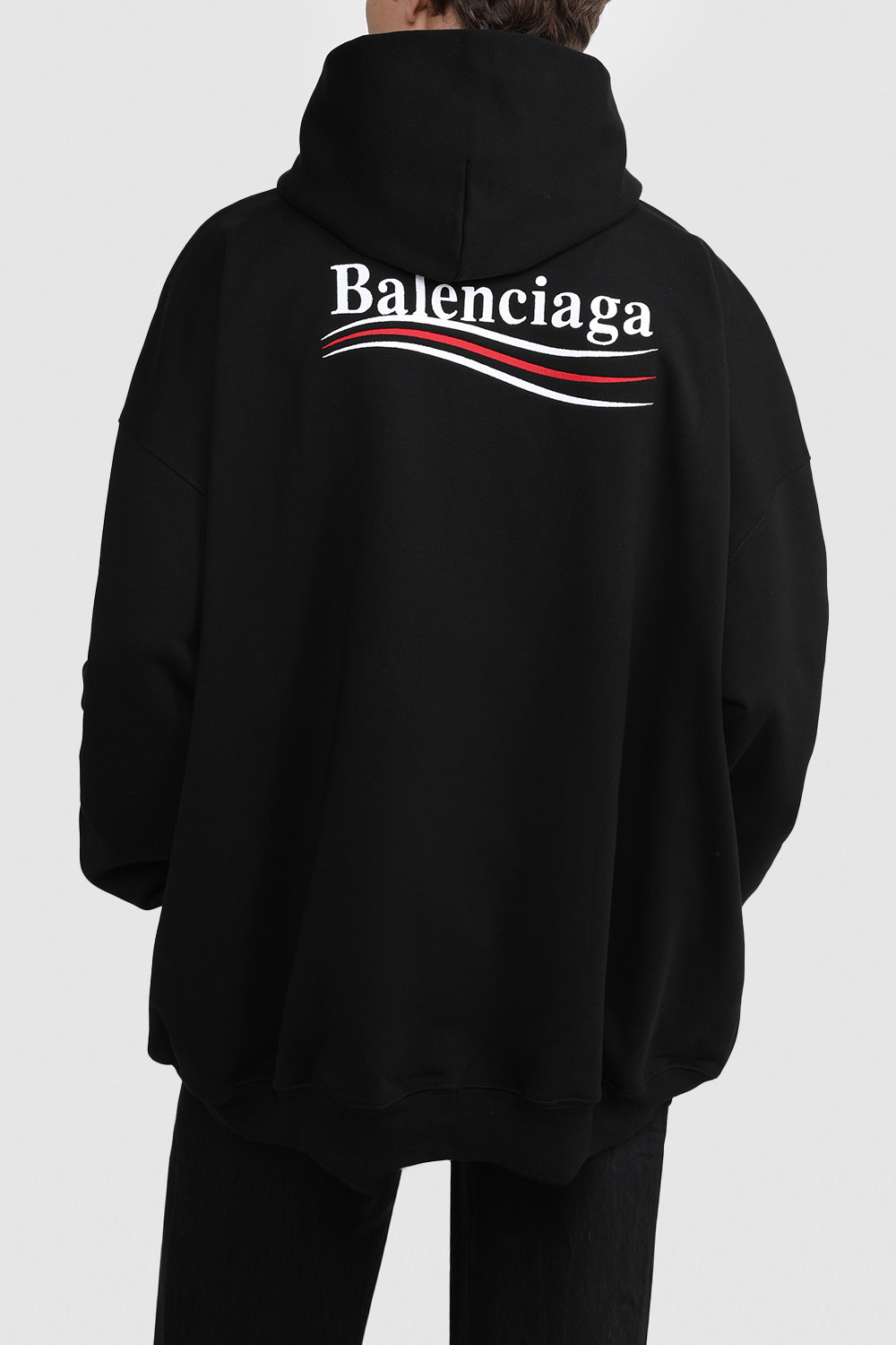 סווטשירט קפוצ'ון אוברסייז מבית Balenciaga, עשוי כותנה בצבע שחור עם הדפס לוגו בחזית.