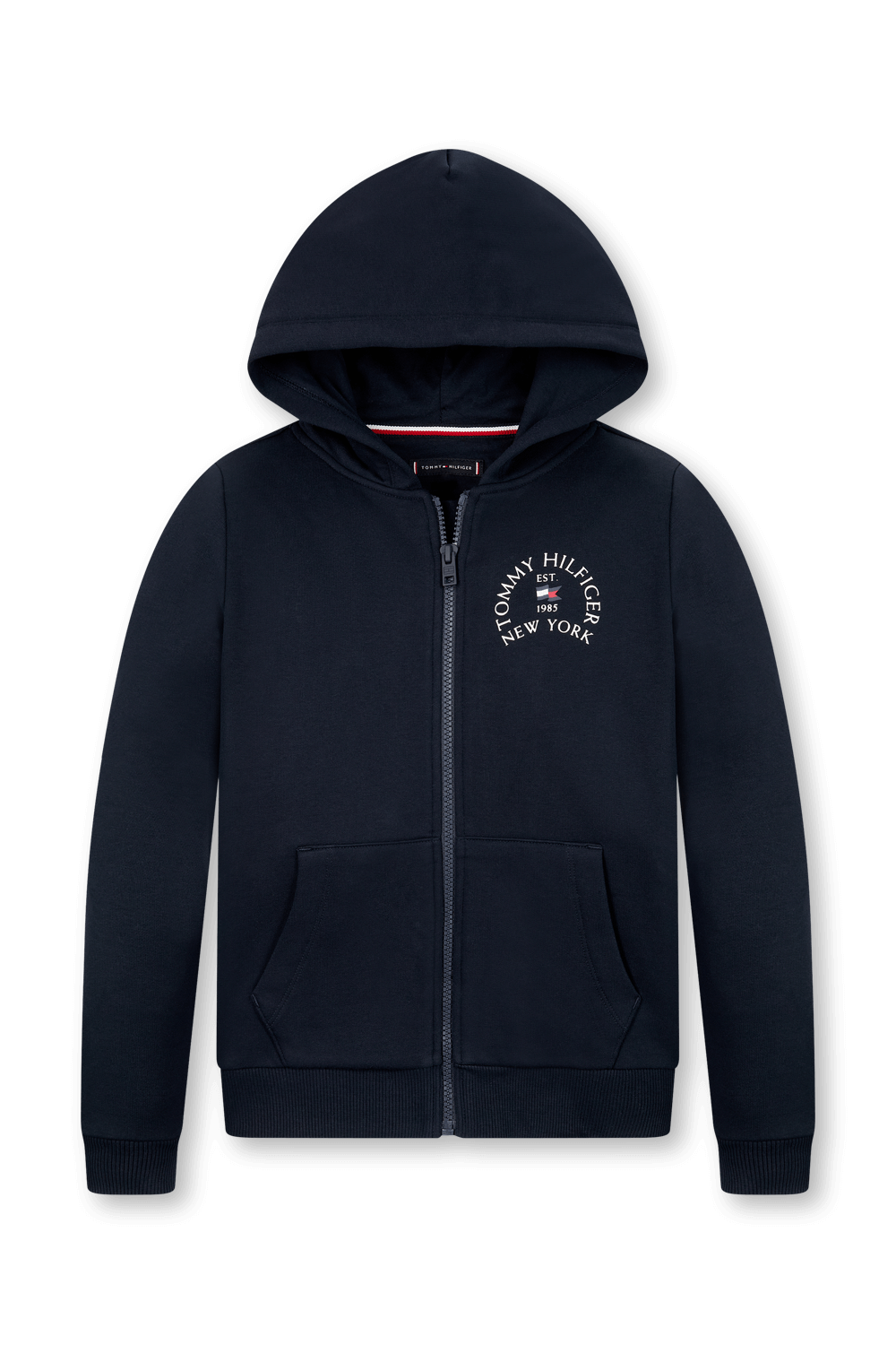 סווטשירט קפוצ'ון עם רוכסן מבית Tommy Hilfiger, עשוי תערובת כותנה מחודשת ופוליאסטר ממוחזר עם בטנת פליז מחממת בצבע כחול עם הדפס בצד החזה.