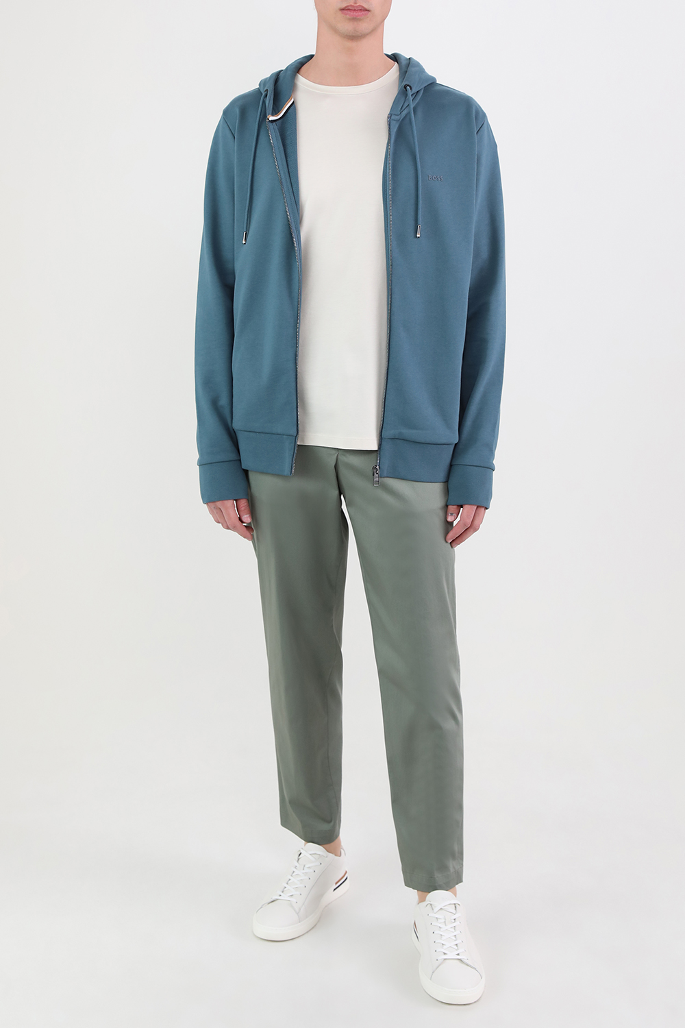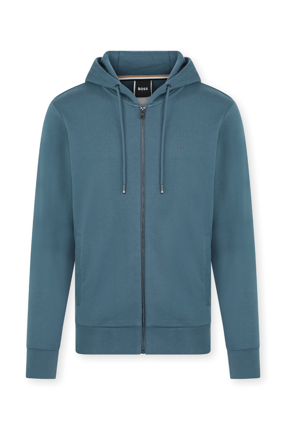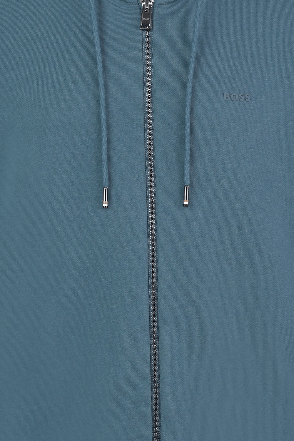 "סווטשירט קפוצ`ון בעיצוב בית האופנה Hugo Boss, העשוי מכותנה נעימה בצבע כחול בהיר עם לוגו סיליקון צדדי. לפריט כובע קפוצ`ון עם שרוכי קשירה ורוכסן. "