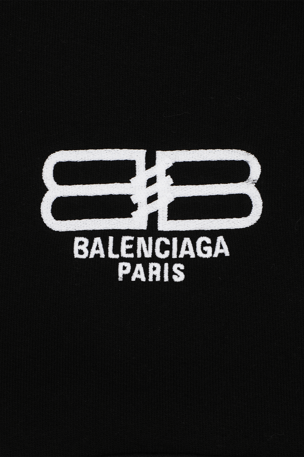 סווטשירט קפוצ'ון מבית Balenciaga, עשוי כותנה בצבע שחור עם הדפס לוגו המותג בחזית בשילוב כיס קדמי.