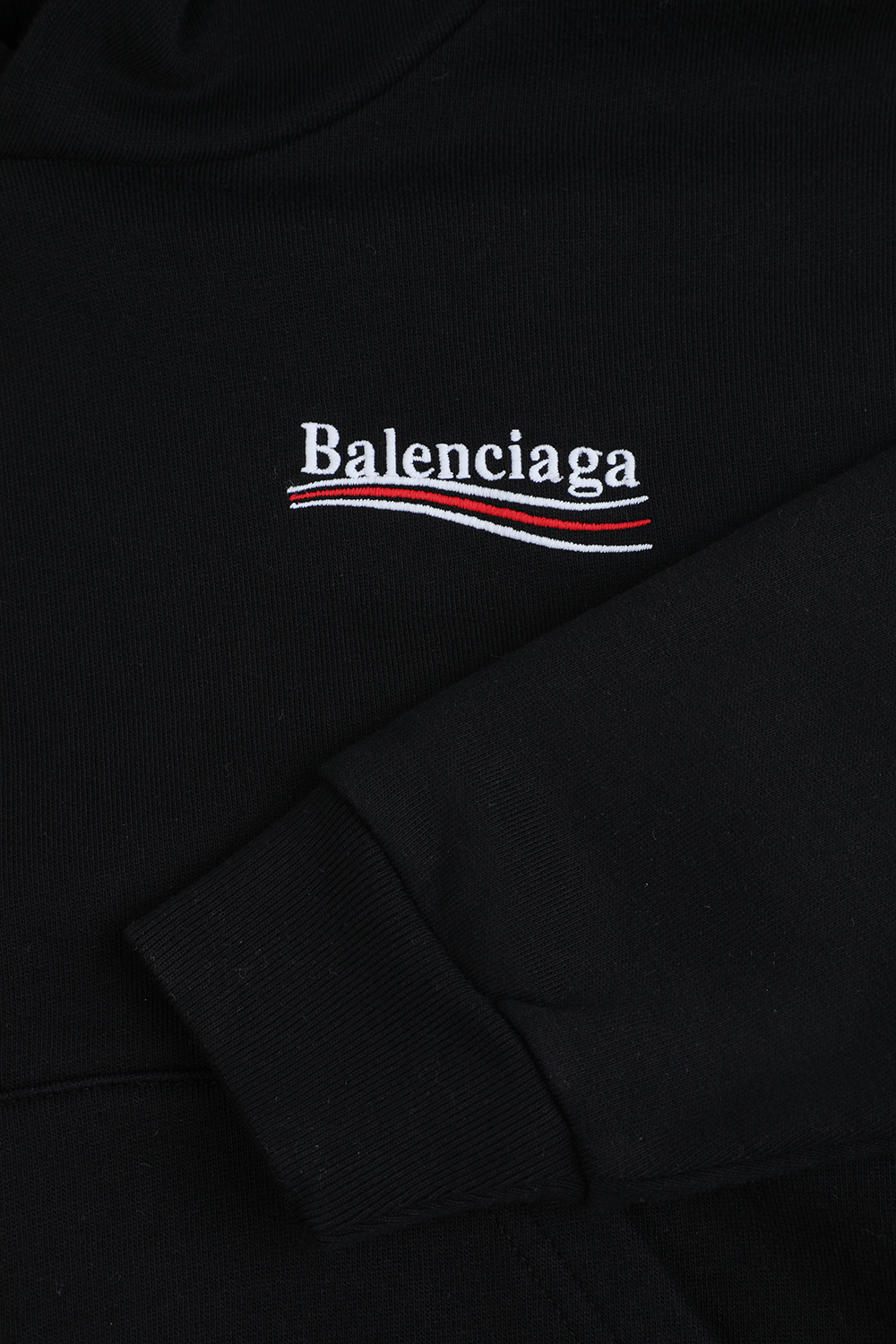 סווטשירט קפוצ'ון מבית Balenciaga, עשוי כותנה בצבע שחור עם הדפס לוגו המותג בצד החזה בשילוב כיס קדמי.