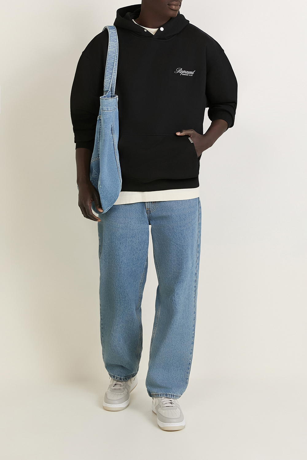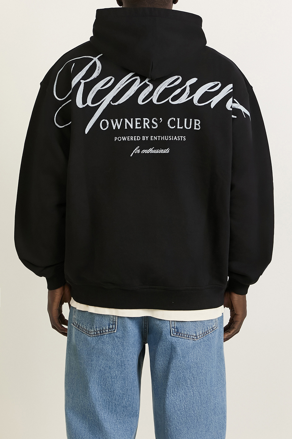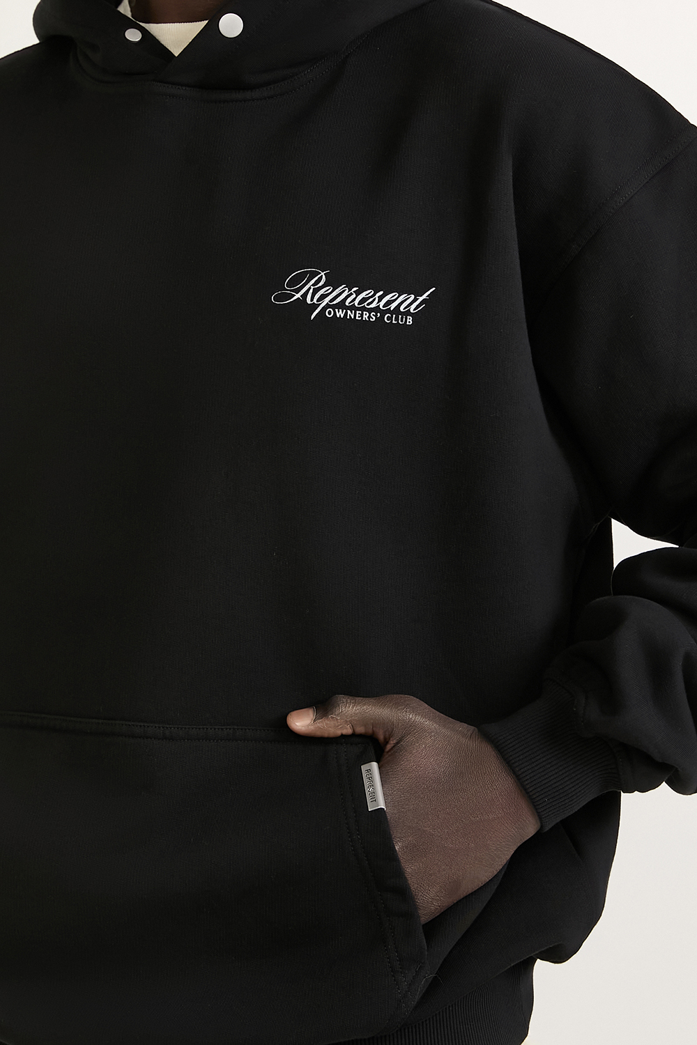 סווטשירט קפוצ'ון מבית Represent, עשוי כותנת פרנץ' טרי בצבע שחור עם כיס קדמי והדפס לוגו במרכז ובגב.