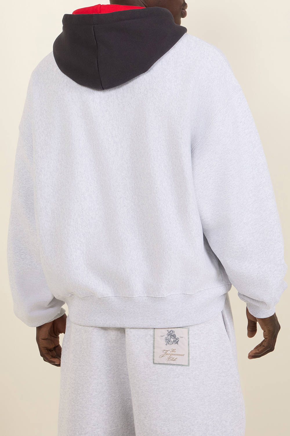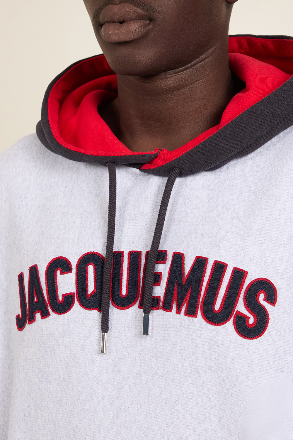 סווטשירט קפוצ'ון Le Hoodie Baseball מבית Jacquemus עם כיס קנגורו. הוא עשוי כותנת פליז נעימה ומחממת בצבע אפור עם קפוצ'ון ולוגו בצבעי אפור כהה ואדום. תוצרת פורטוגל.
