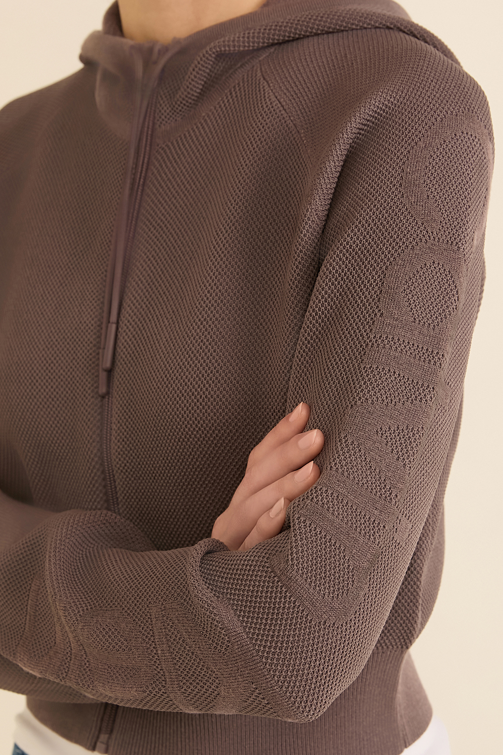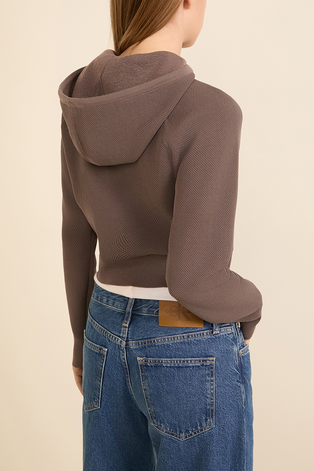סווטשירט קפוצ'ון בגזרת קרופ מבית Calvin Klein. הוא עשוי בד פיקה ממוחזר בצבע סגול, בשילוב שם המותג על השרוול. נסגר ברוכסן.