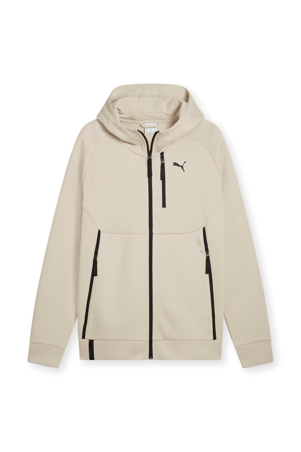 סווטשירט קפוצ'ון מבית Puma, עשוי תערובת כותנה ופוליאסטר בצבע בז' בשילוב רוכסן לאורך החזית ורוכסני צד בצבע שחור.