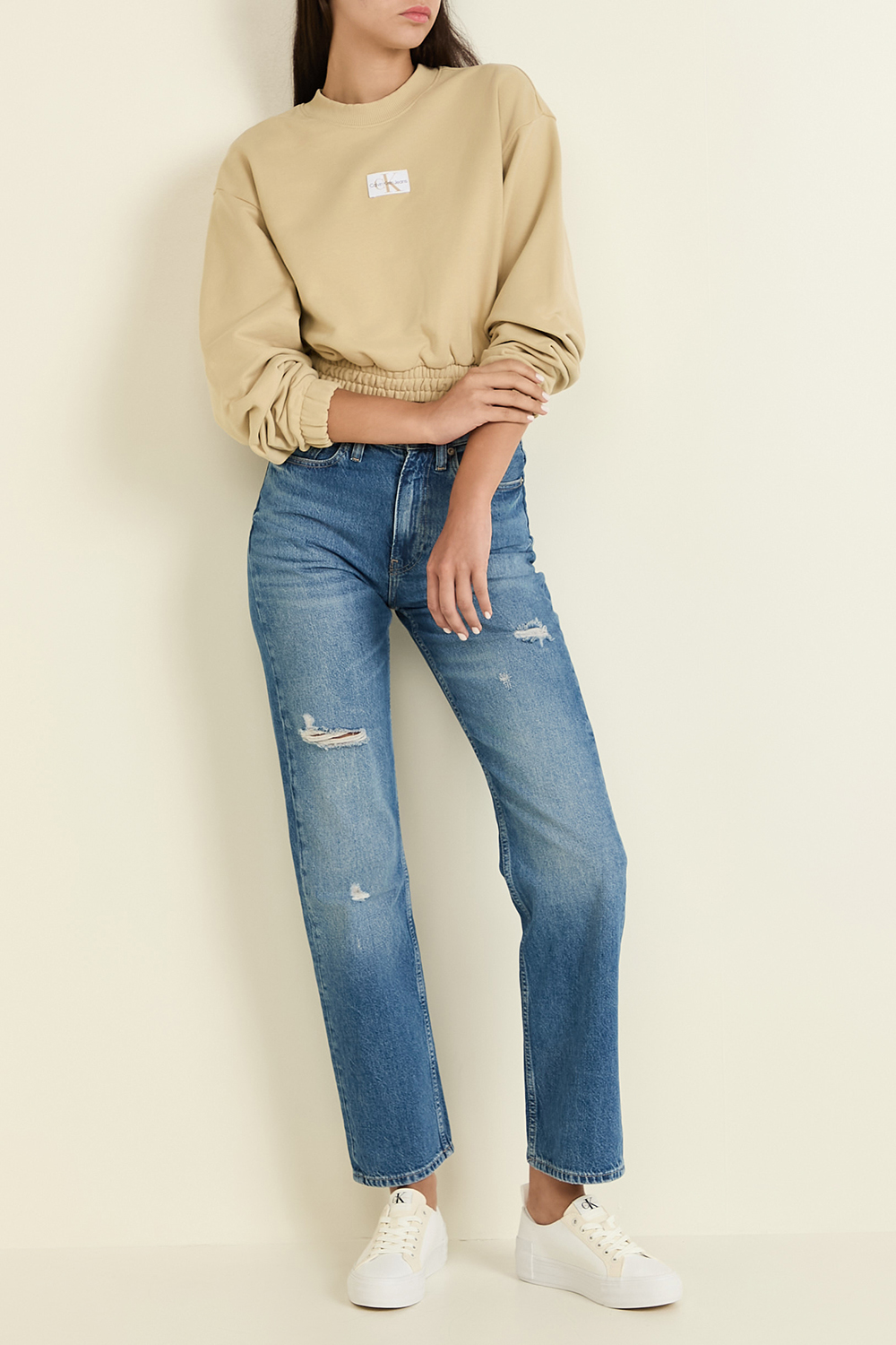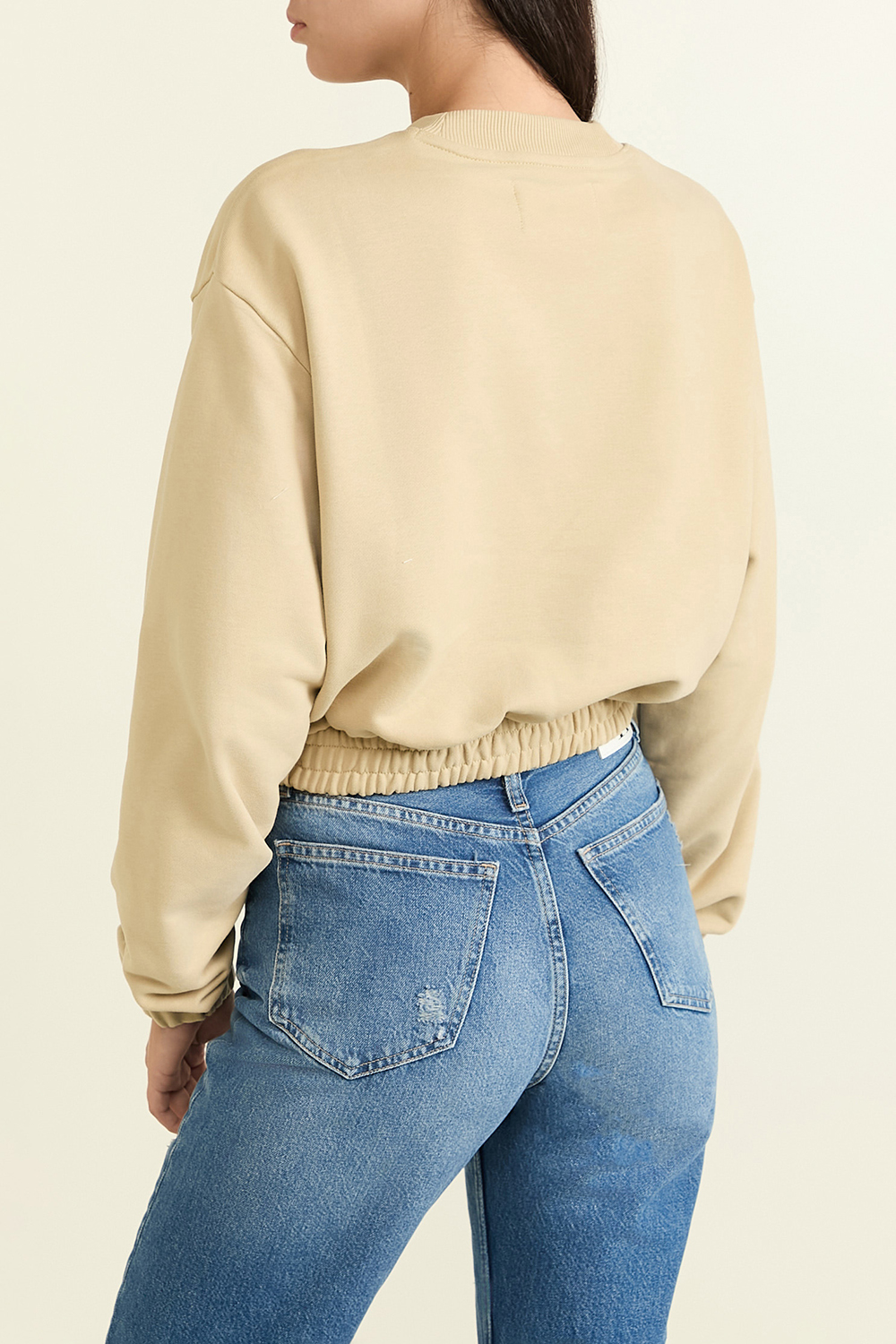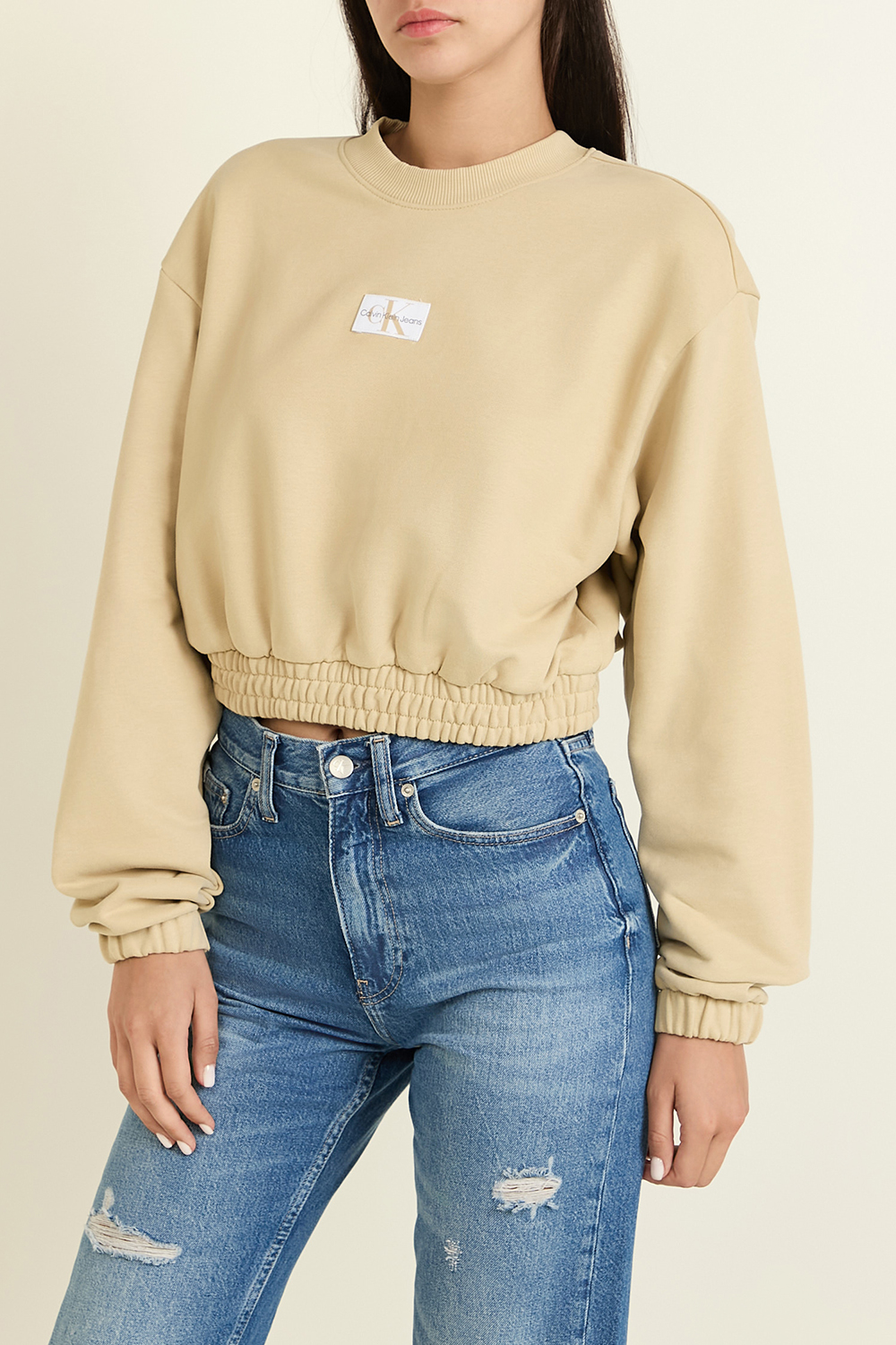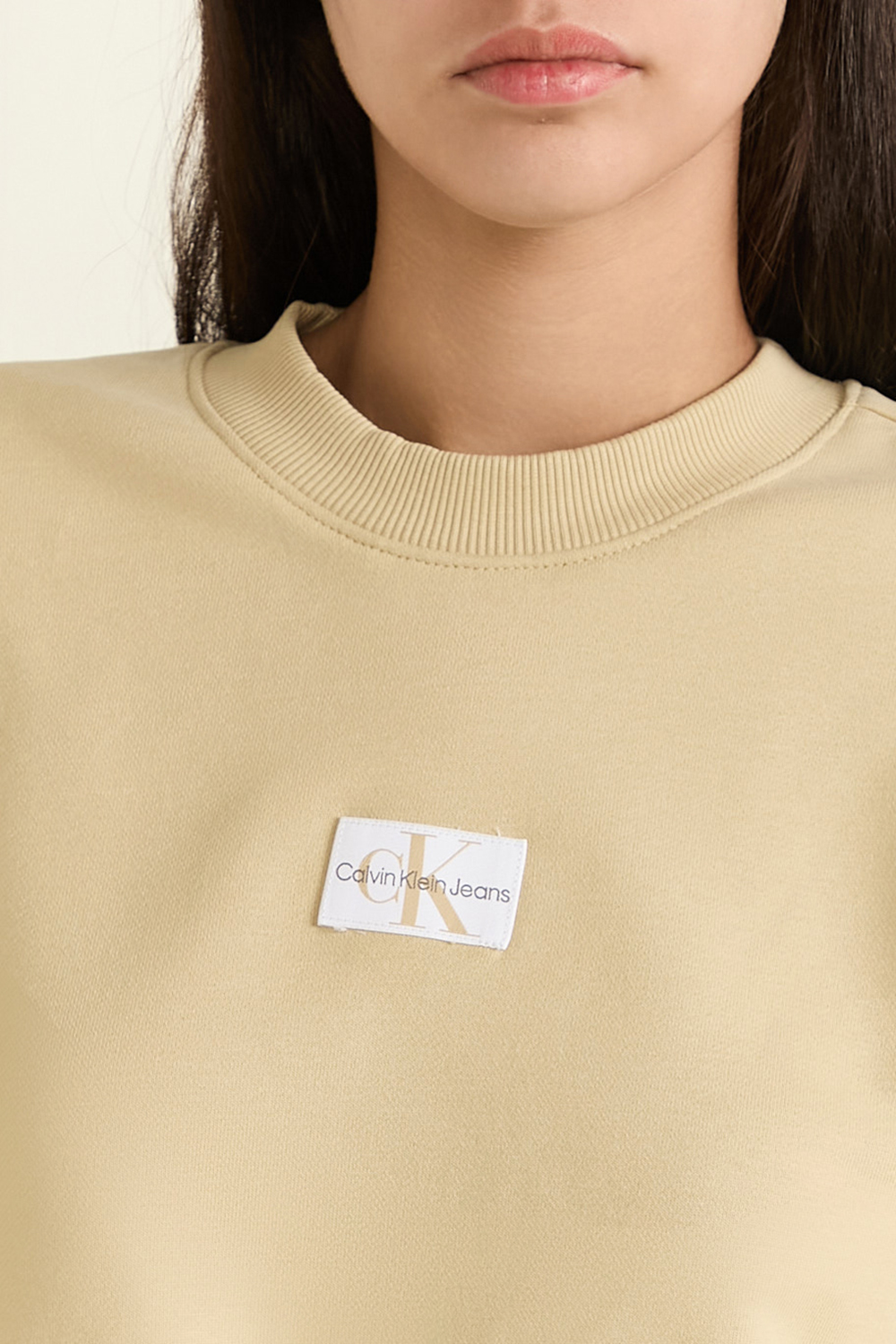 סווטשירט קרופ מבית Calvin Klein, בצבע בז' עשוי כותנת פרנץ' טרי מחודשת - הגדלה בשיטות חקלאות המבקשות לשפר את בריאות הקרקע והמים. לסווטשירט צווארון ריב בשילוב פאץ' לוגו המותג במרכז, ובסיומת גומי רחבה.