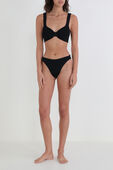 סט בגד ים ביקיני דגם Bonnie מבית Hunza G, עשוי פוליאמיד ואלסטן בצבע שחור עם קשירת פפיון במראה רטרו על חזיית הביקיני ותחתוני משולשים.