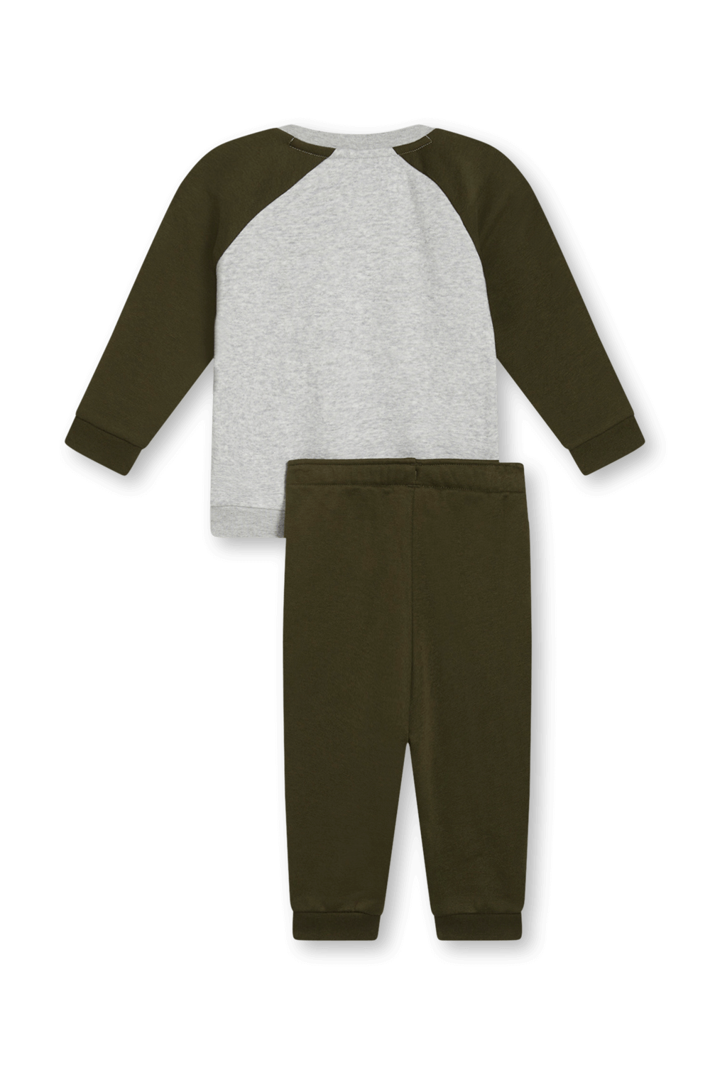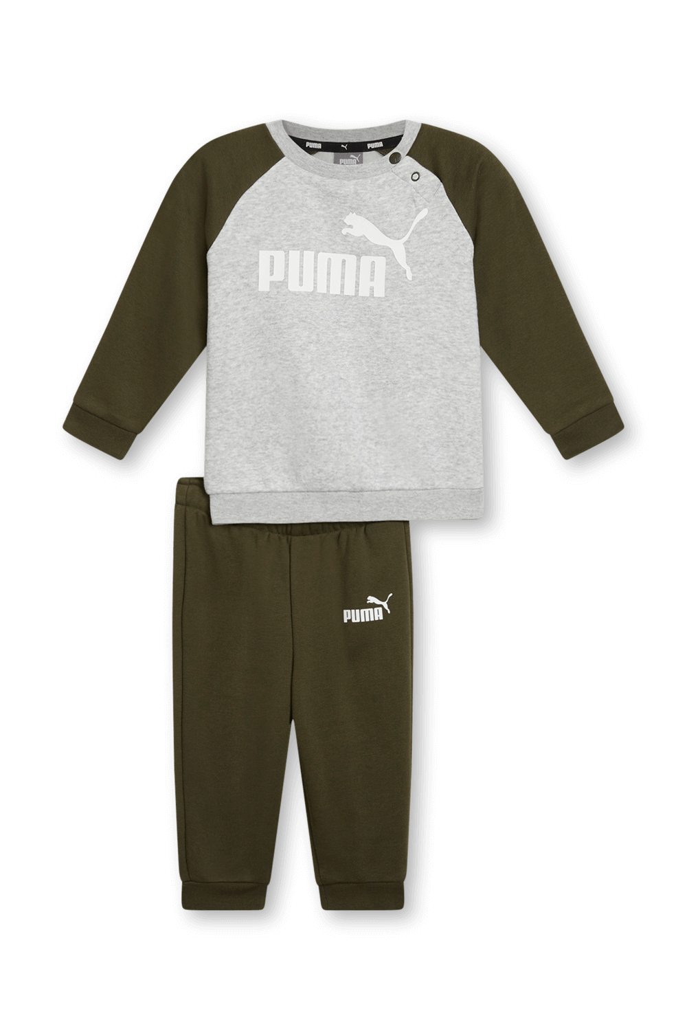 סט מכנסיים וסווטשירט מבית Puma, בעיצוב סטריט וור. החליפה עשויה בד פליז נעים, רך ומחמם מכותנה ופוליאסטר בצבעי ירוק ואפור.