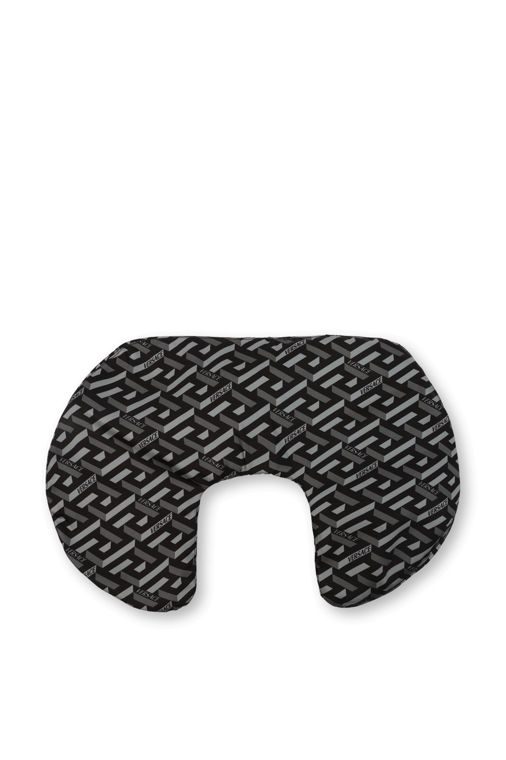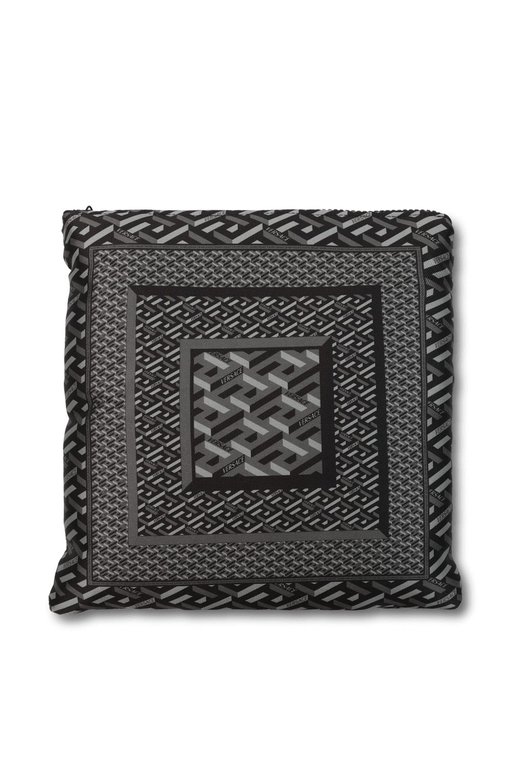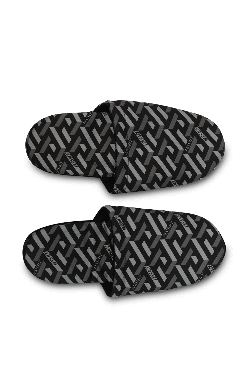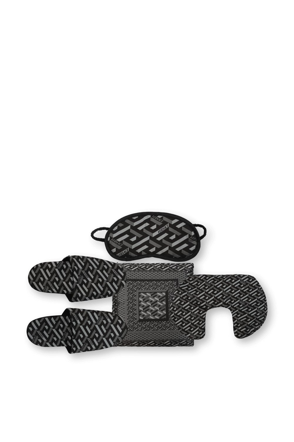 סט נסיעות בעיצוב בית האופנה היוקרתי Versace, העשוי פוליאסטר וגומי, וכולל כרית מתנפחת לצוואר, כיסוי עיניים, ונעלי בית, בצבעי שחור ואפור ובהדפס גרקה ממותג. הסט מגיע במארז מרופד בגימור עמיד למים ולכתמים.