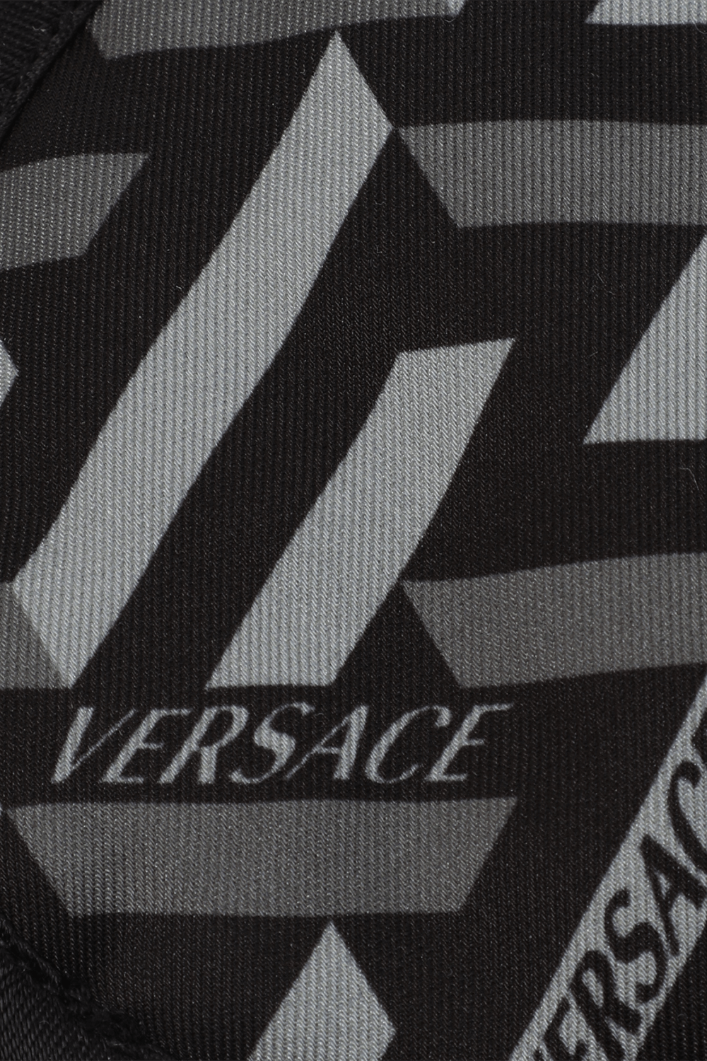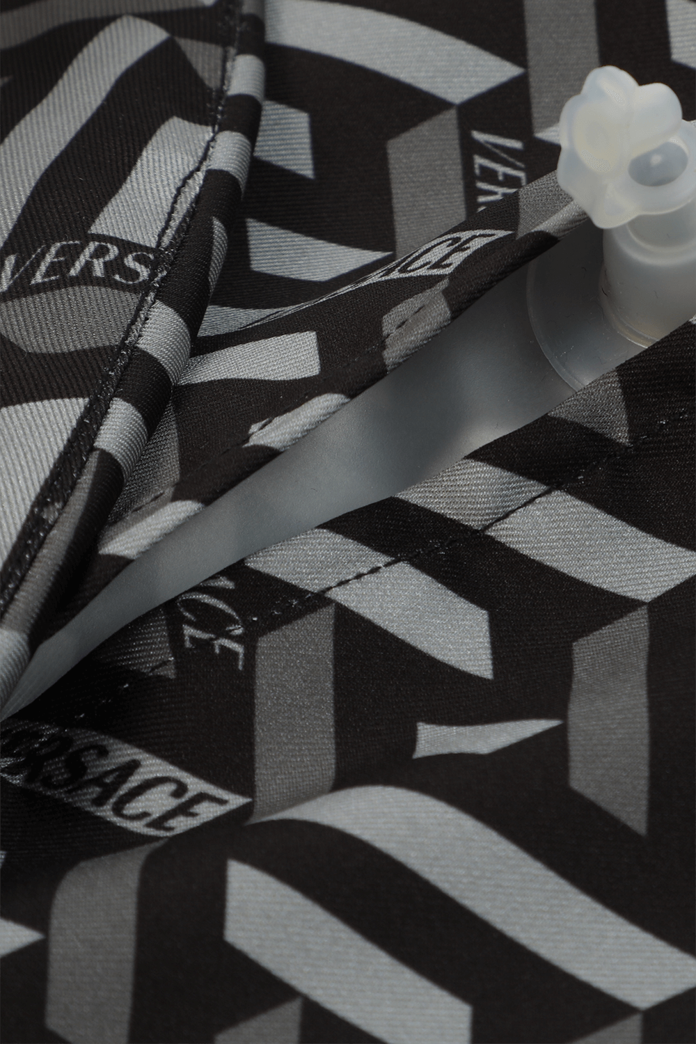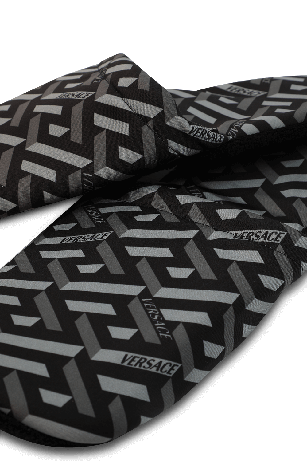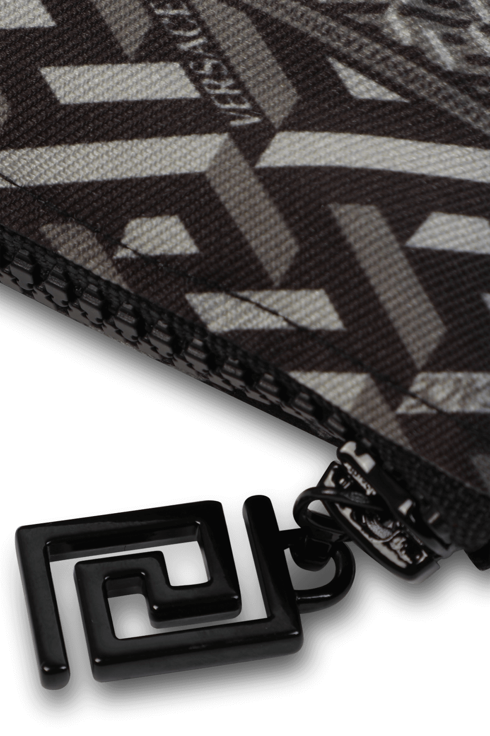 סט נסיעות בעיצוב בית האופנה היוקרתי Versace, העשוי פוליאסטר וגומי, וכולל כרית מתנפחת לצוואר, כיסוי עיניים, ונעלי בית, בצבעי שחור ואפור ובהדפס גרקה ממותג. הסט מגיע במארז מרופד בגימור עמיד למים ולכתמים.