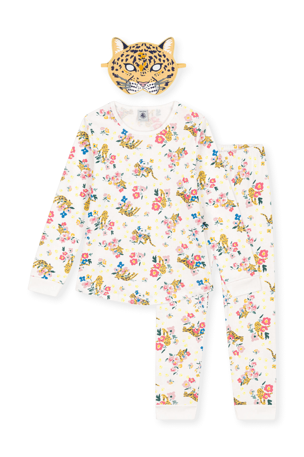 פיג'מה מבית Petit Bateau, עשויה כותנה בצבע לבן ובהדפס פרחים ונמרים. הסט כולל חולצת טי ארוכה עם צווארון מעוגל, בשילוב מכנסי ג'וג עם חגורת מותניים אלסטית ומסכת עיניים בדמות נמר הניתנת להתאמה על ידי אבזם. הסט הייחודי מאיר בחשיפה לחושך באורות זוהרים, כשניתן לקבל אפקט מקסימלי בחשיפה קודמת לאור.