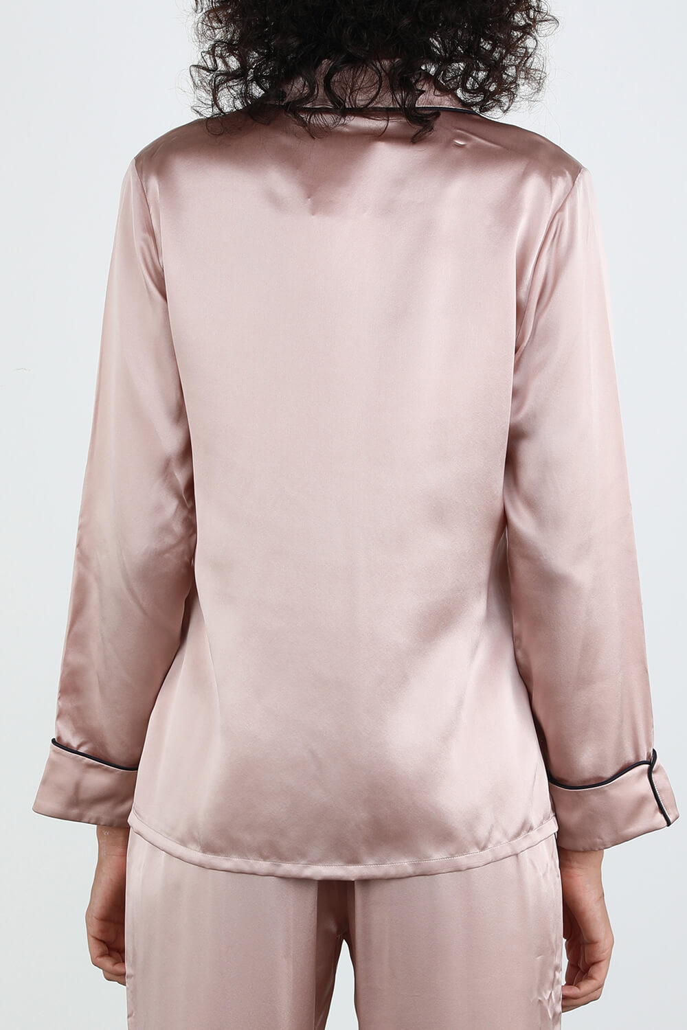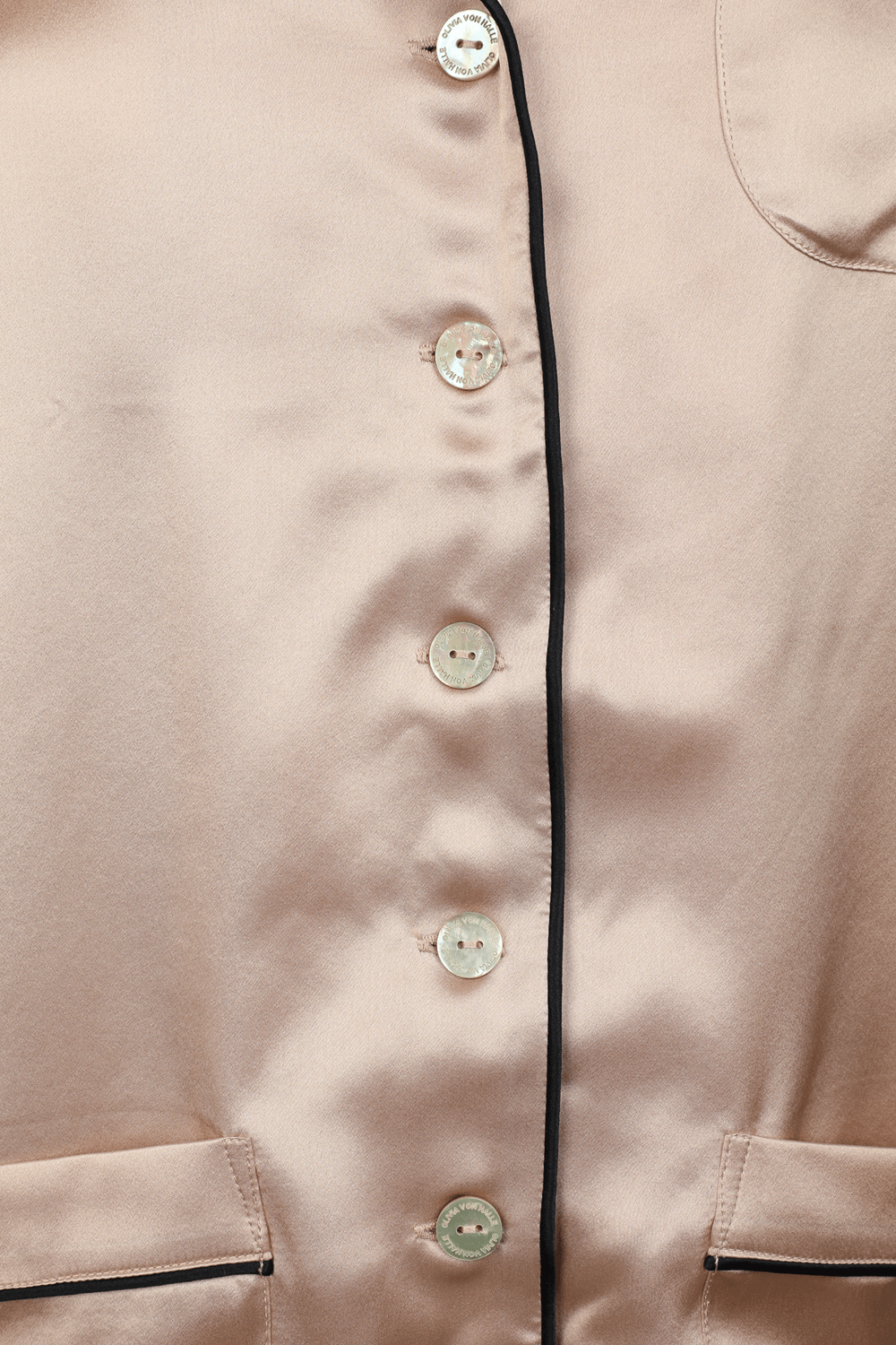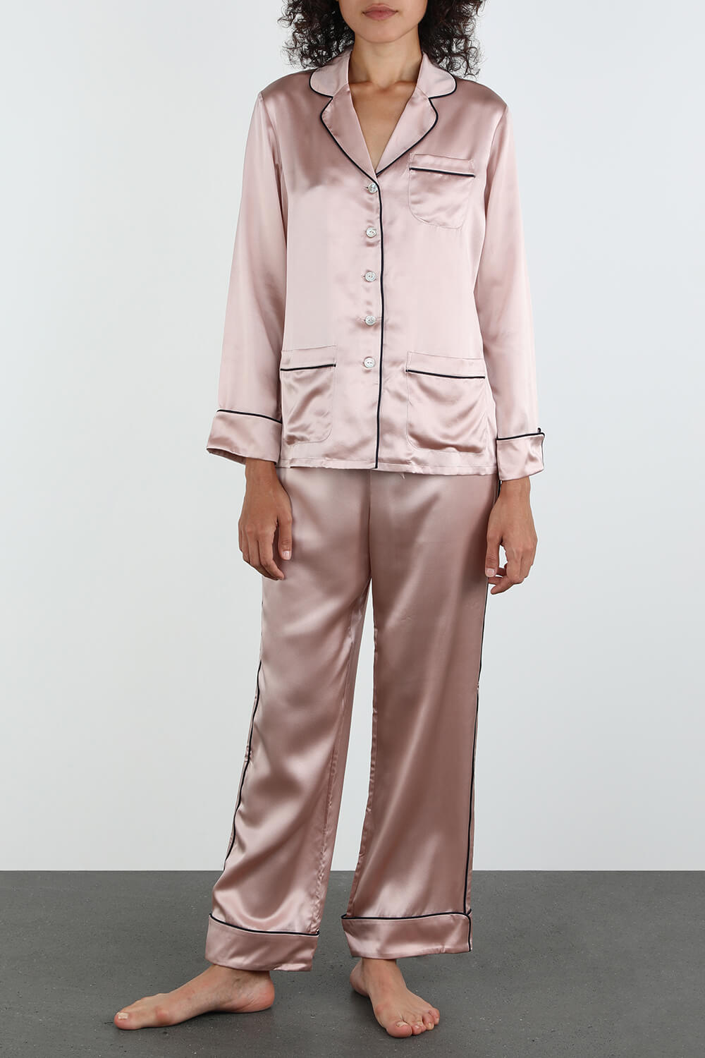 סט פיג`מה יוקרתי עשוי 100% משי מבית המותג הלונדוני OLIVIA VON HALLE מציג חולצה מכופתרת ארוכת שרוולים ומכנסיים בקשירת שרוך. סט נעים וכיפי העשוי ממשי רך ונעים בגוון רוזה עדין ומבריק עם דש בגוון כחול נייבי ושלושה כיסים המעטרים את החזית. המותג מתמקד בביגוד שינה איכותי במיוחד העושה שימוש בחומרים הטובים בעולם ובעיצובים מודרניים עם תשומת לב רבה ודייקנית לפרטים.