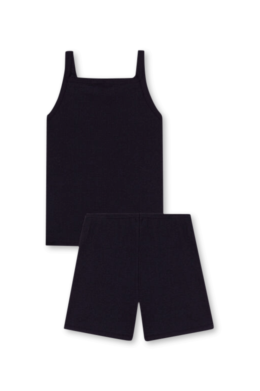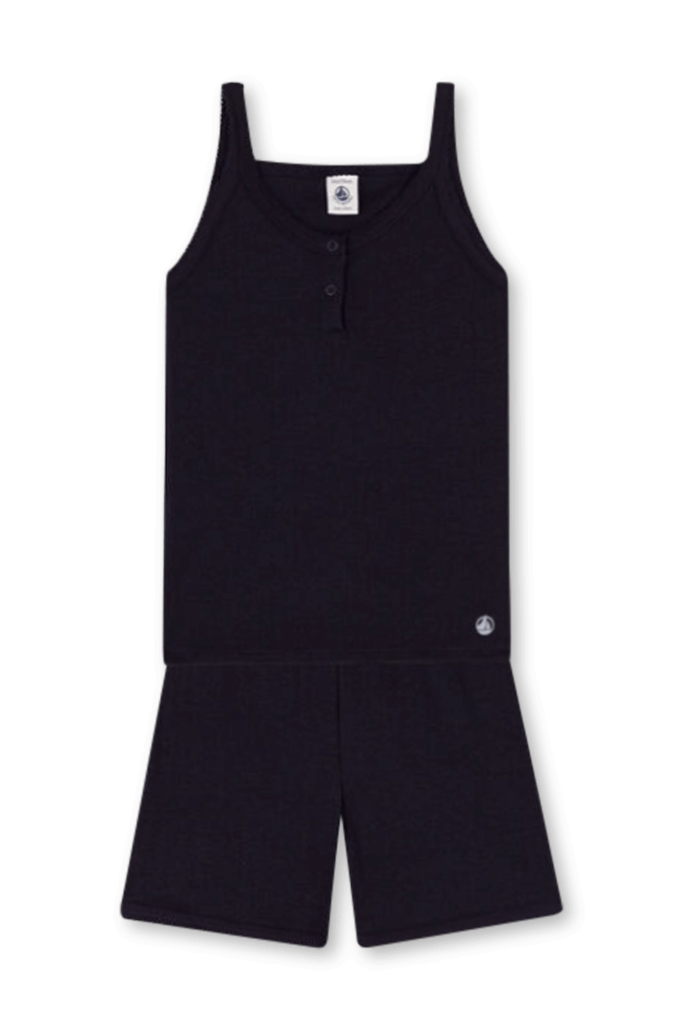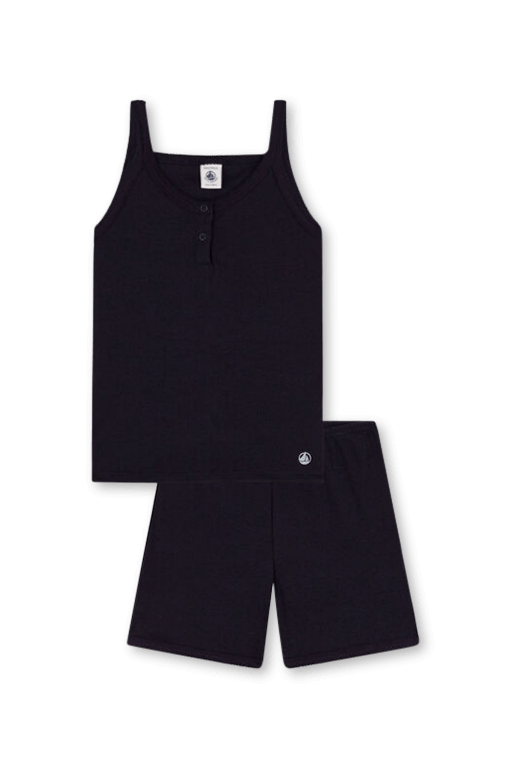 סט פיג'מה מבית Petit Bateau העשוי שילוב כותנה וליוסל מסיבים טבעיים, נושמים והיפואלרגניים, ומורכב ממכנסיים וגופייה בכחול נייבי בסריגת ריב.