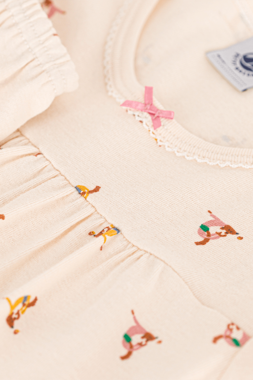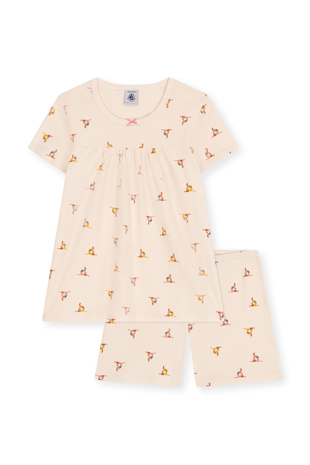 סט פיג'מה קצר מבית Petit Bateau, מכותנה עם הדפס צבעוני מתוק של סנאים משחקים עם בלוטים. לפיג'מה גימורים מקסימים של חתך אמפיר וכיווצים מתחת לצווארון בגימור מלמלה.