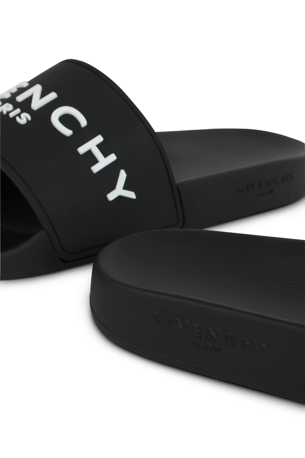 כפכפי סליידס שחורים ואולטרה שיקים מבית האופנה הצרפתי זיבנשי. זהו דגם העשוי 100% גומי רך ואיכותי עם רצועות רחבות בגוון שחור עם לוגו בגוון לבן מוטבע בחזית לצד מקום הייצור. סוליות גומי ממותגות ורכות משלימות את סגנונו המוביל.