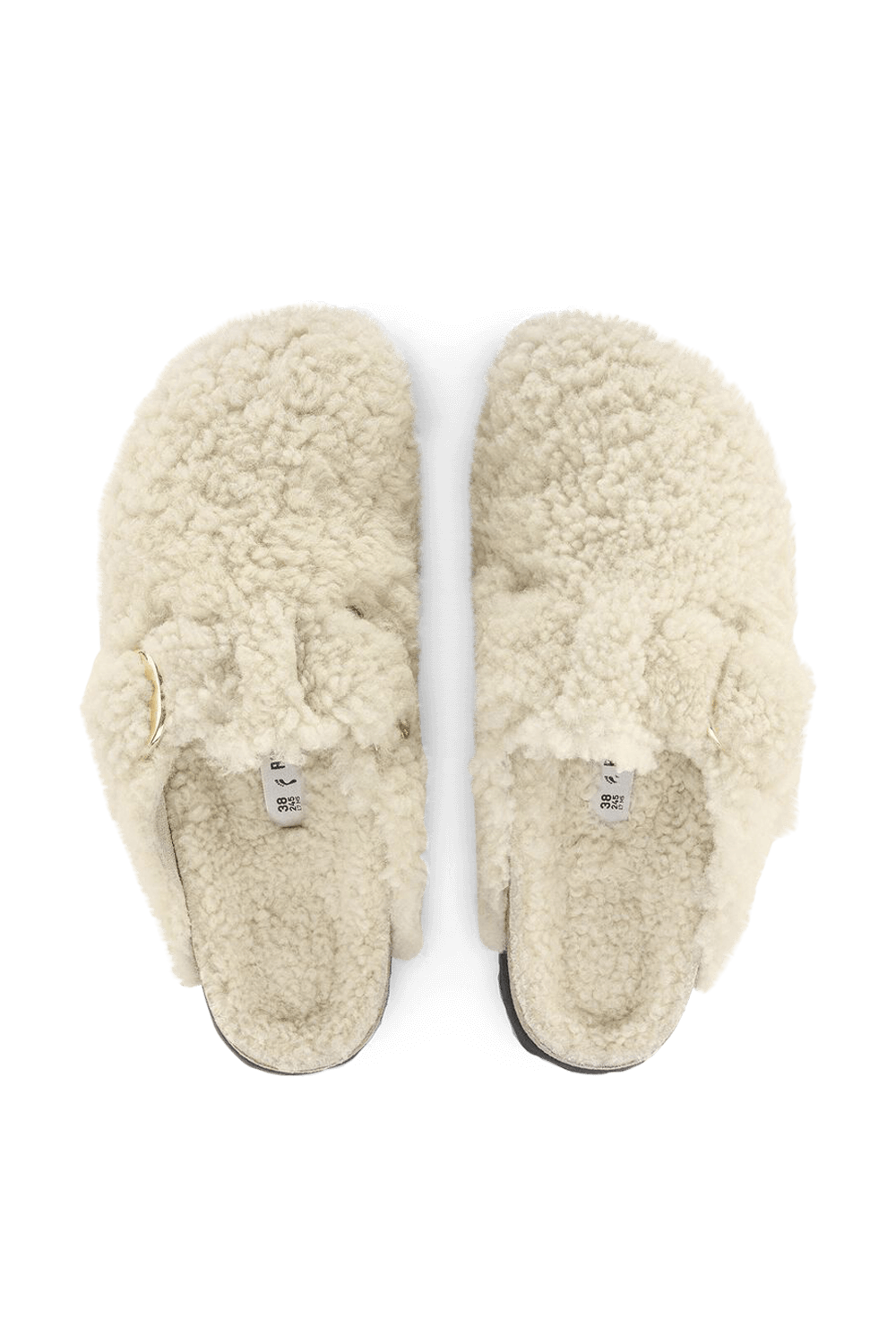 סנדלי Birkenstock האייקוניים מדגם Arizona Big Buckle, מוצעים בוורסיה חורפית ומפנקת במיוחד, הכוללת רצועות ורפידות מפרוות שרלינג נעימה ומחממת בצבע בז', ואבזמי אוברסייז זהובים. לסנדלים בסיס סולייה משעם אורטופדי, המותאם לכף הרגל, ומדרכי קצף גומי EVA קלים ומונעי החלקה בצבע שחור.