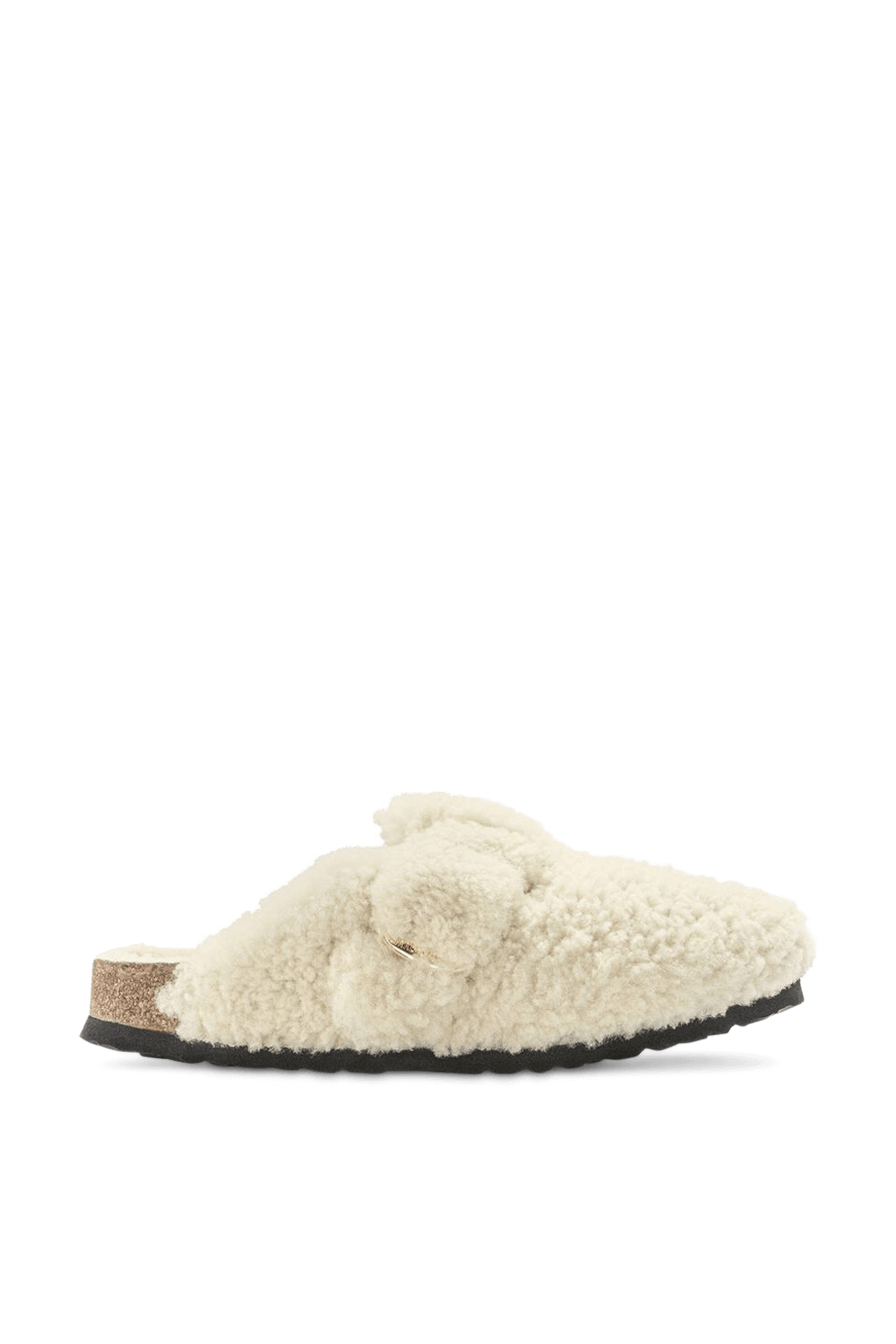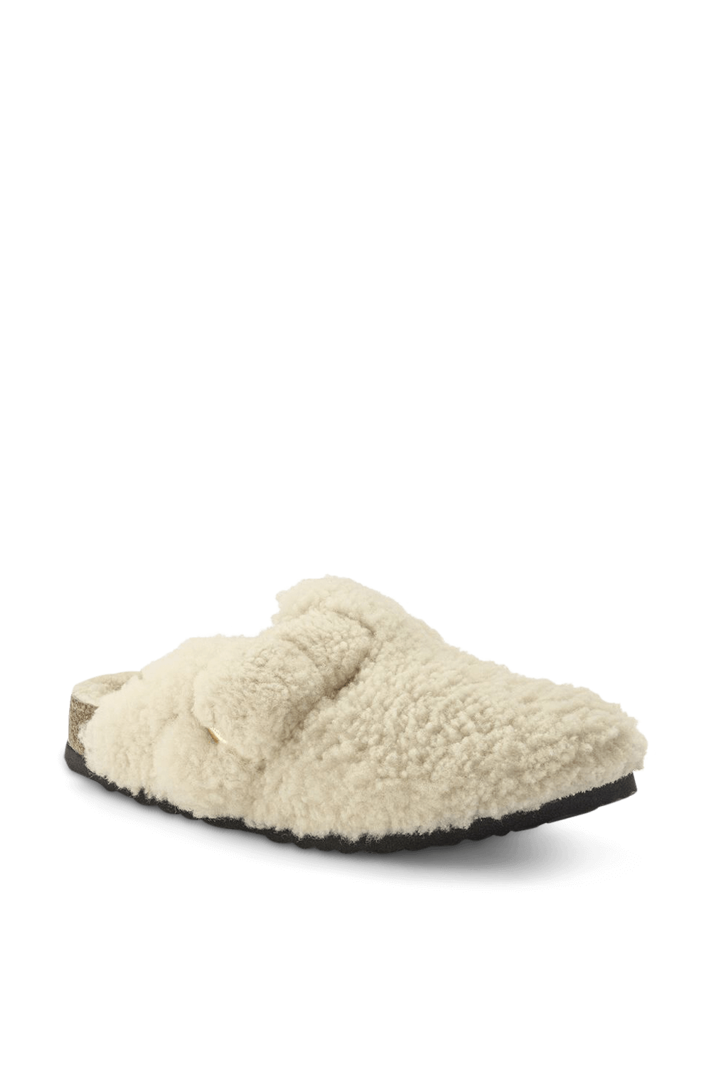 סנדלי Birkenstock האייקוניים מדגם Boston Big Buckle, מוצעים בוורסיה חורפית ומפנקת במיוחד, הכוללת רצועות ורפידות מפרוות שרלינג נעימה ומחממת בצבע בז', ואבזמי אוברסייז זהובים. לסנדלים בסיס סולייה משעם אורטופדי, המותאם לכף הרגל, ומדרכי קצף גומי EVA קלים ומונעי החלקה בצבע שחור.