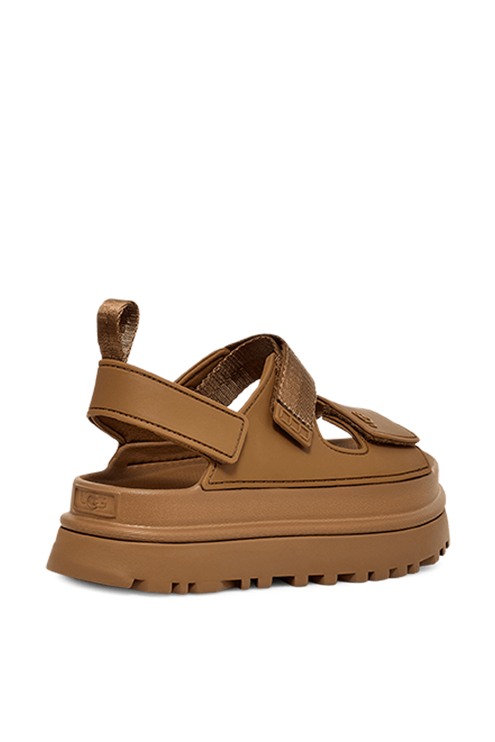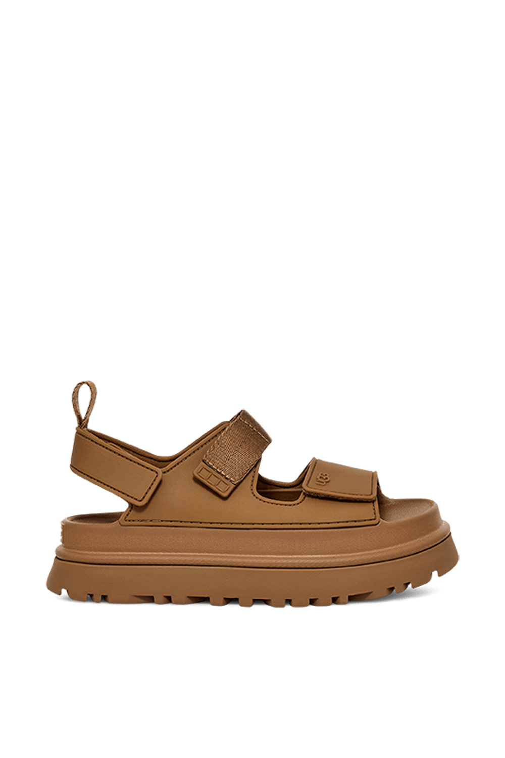 סנדלים מדגם Golden Glow מבית UGG, עשויים פוליאסטר ממוחזר עמיד בפני מים בשילוב סולית EVA קלת משקל ובצבע חום. לסנדלים שתי רצועות בחזית ורצועת קרסול הניתנות להתאמה אישית, בשילוב הטבעת לוגו המותג ובמראה צ'אנקי.