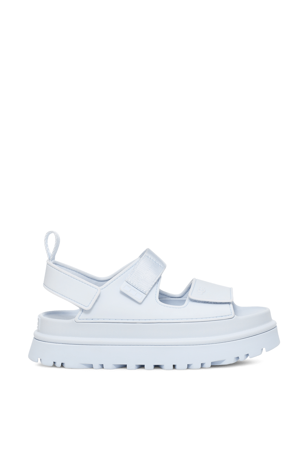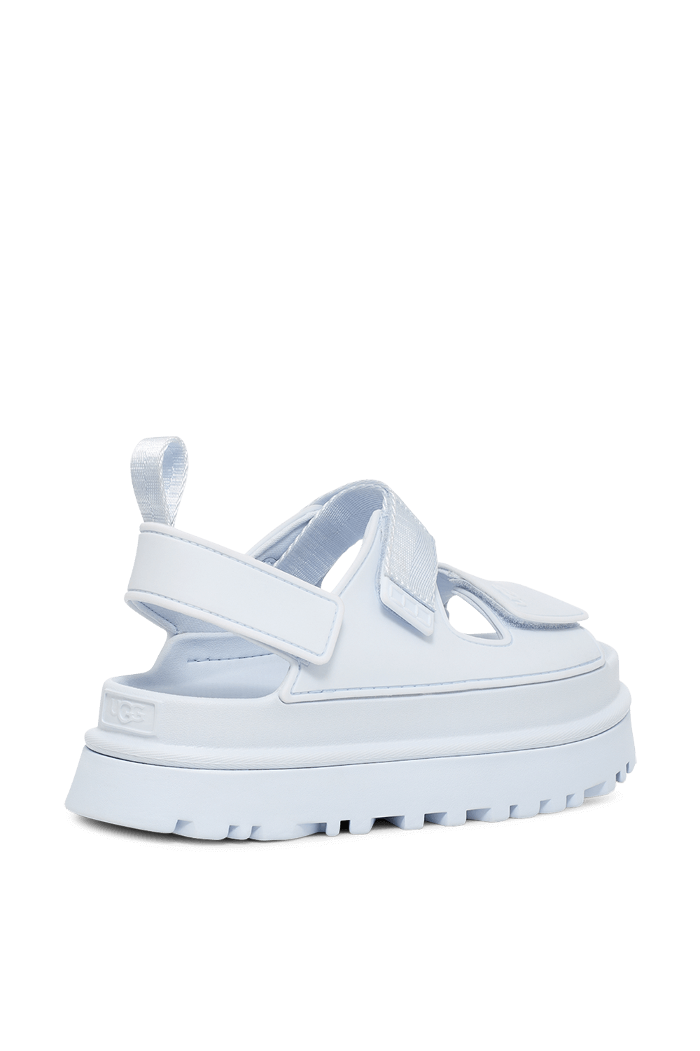 סנדלים מדגם Golden Glow מבית UGG, עשויים פוליאסטר ממוחזר עמיד בפני מים בשילוב סולית EVA קלת משקל ובצבע כחול. לסנדלים שתי רצועות בחזית ורצועת קרסול הניתנות להתאמה אישית, בשילוב הטבעת לוגו המותג ובמראה צ'אנקי.