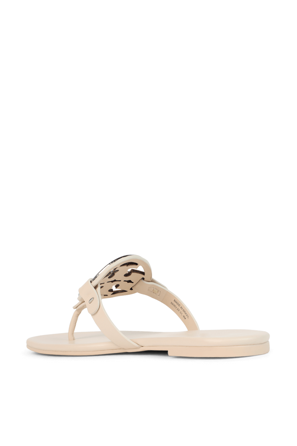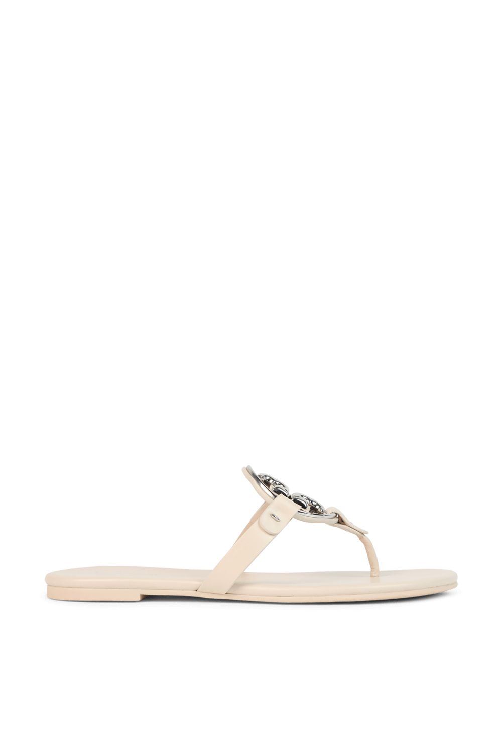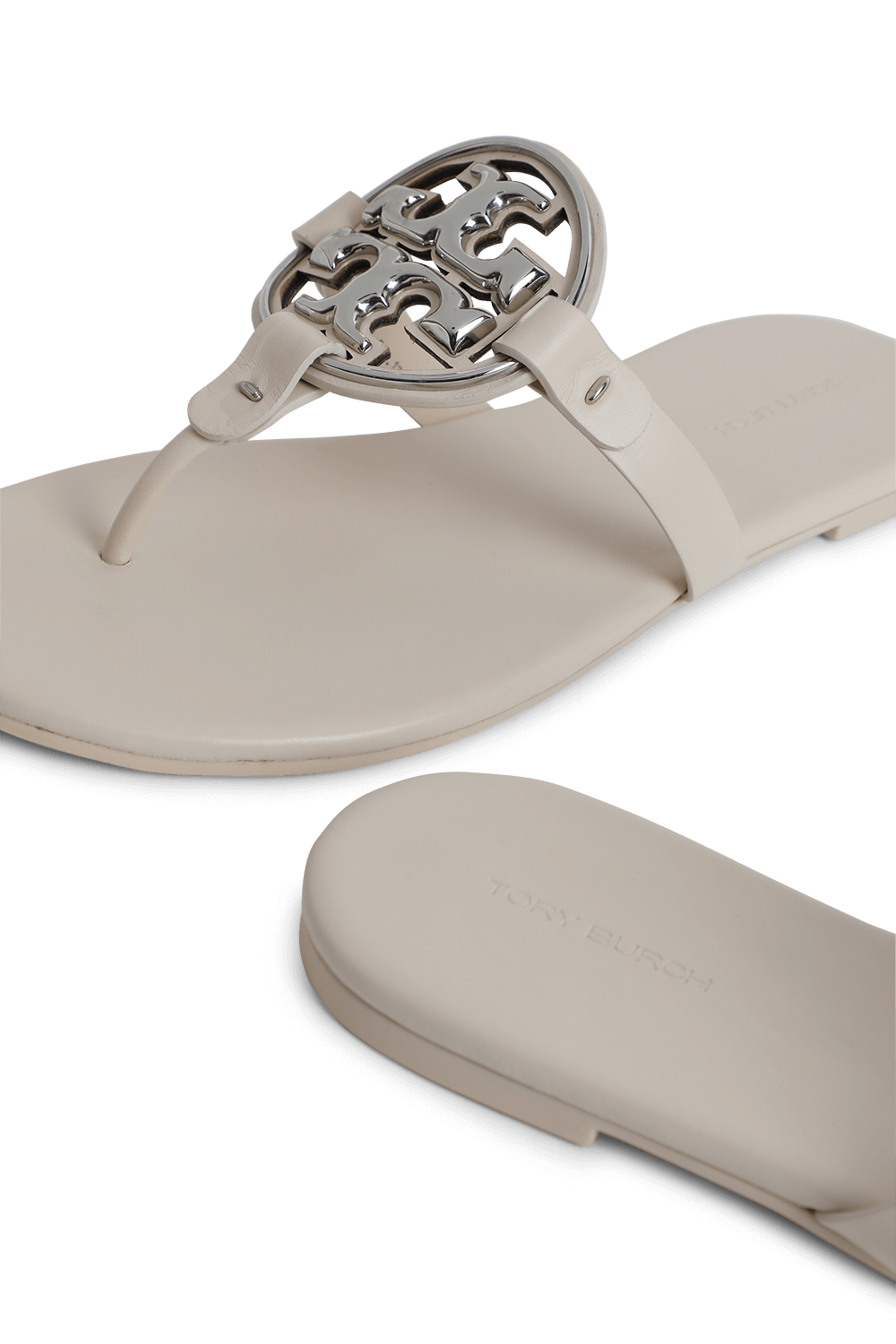 "סנדלים מדגם Miller בעיצוב Tory Burch, מעור בצבע שמנת ובגימור חלק. לסנדלים רצועה מרכזית עם לוגו מטאלי כסוף בחיתוך ה-T הכפולה של המותג, וסוליית גומי שטוחה."
