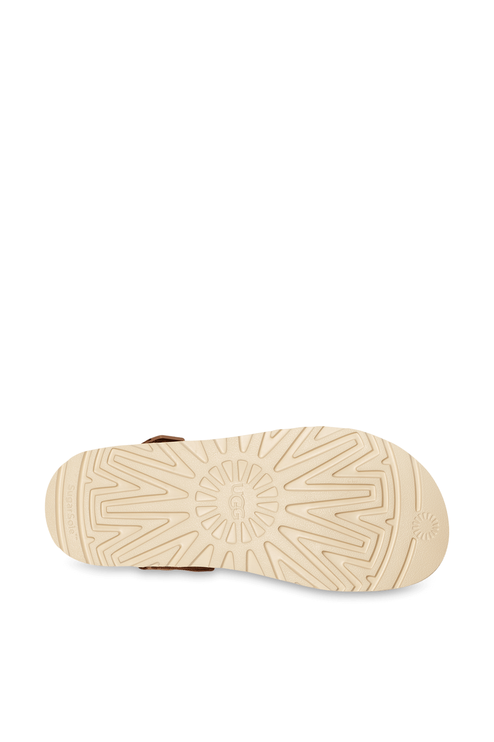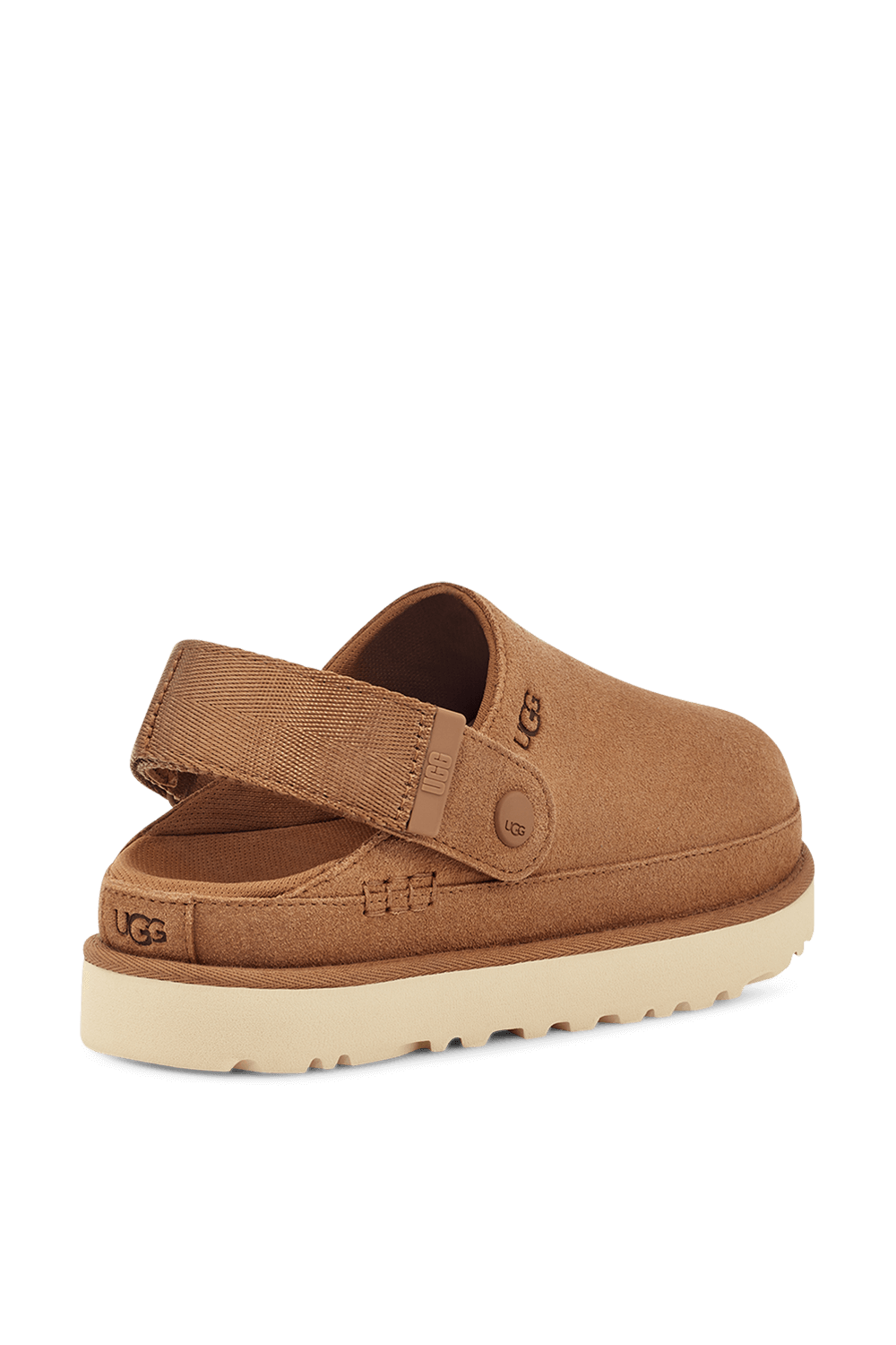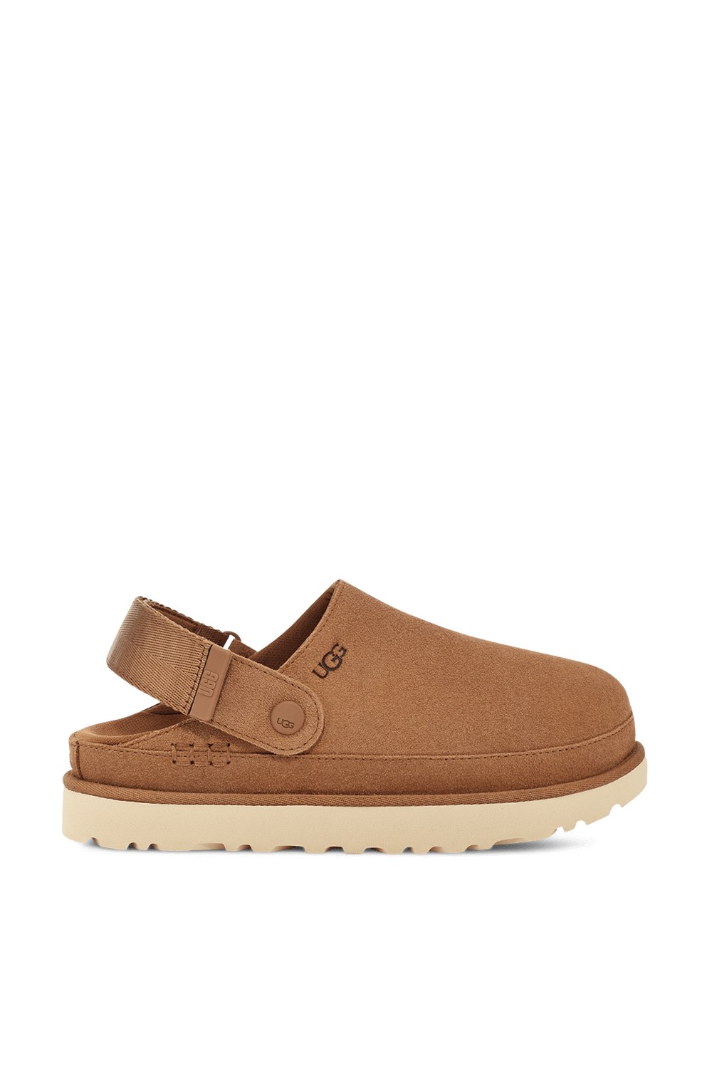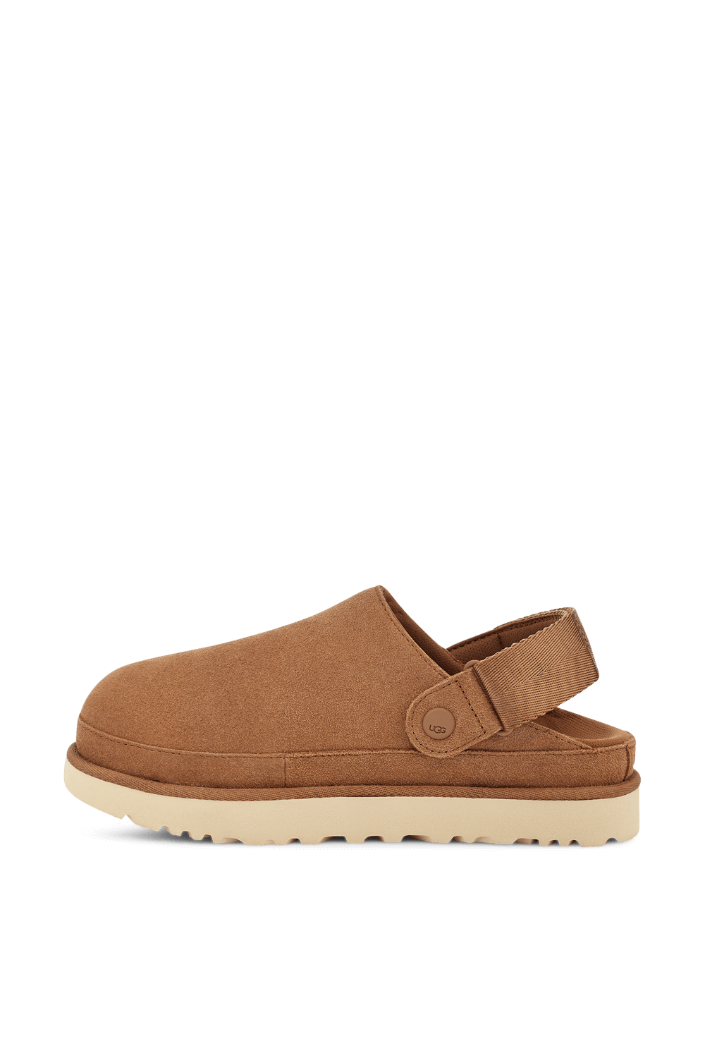 סנדלי סליידס Goldenstar Clog מבית Ugg, עשויים זמש קטיפתי בצבע חום עם בטנה רכה ונעימה בשילוב רצועת קרסול המאפשרת ללבוש את הנעליים ב-2 אפשרויות: כסנדלים קלאסיות עם רצועת עקב, או בהרמת הרצועה לחזית כסליידס נוחות. לנעליים סוליית SugarSole™ העשויה תערובת קנה סוכר ומאפשרת להפחית את התלות בדלק מאובנים.