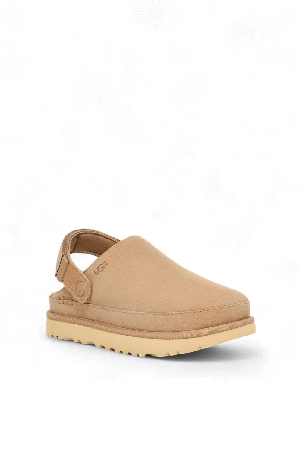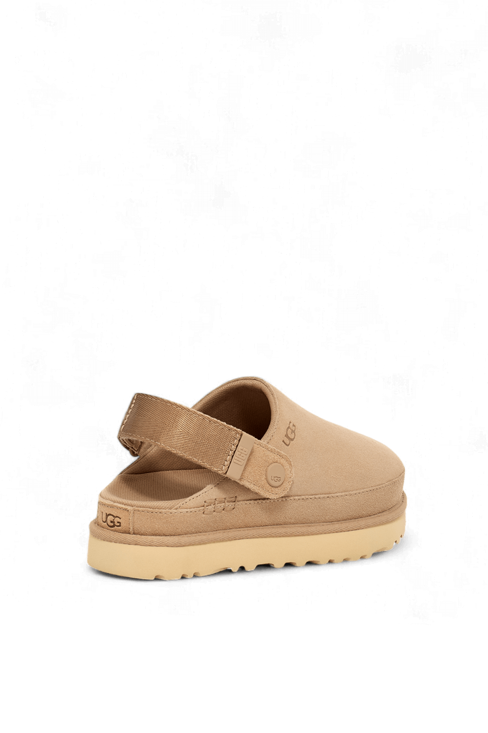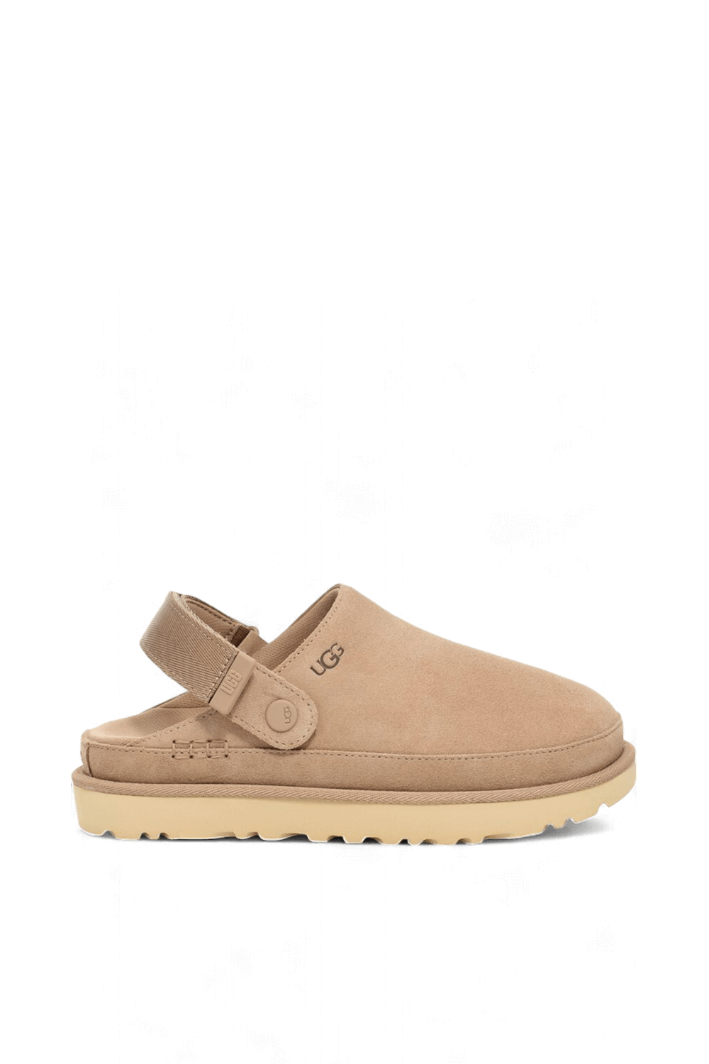 סנדלי סליידס Goldenstar Clog מבית Ugg, עשויים זמש קטיפתי בצבע בז' עם בטנה רכה ונעימה בשילוב רצועת קרסול המאפשרת ללבוש את הנעליים ב-2 אפשרויות: כסנדלים קלאסיות עם רצועת עקב, או בהרמת הרצועה לחזית כסליידס נוחות. לנעליים סוליית SugarSole™ העשויה תערובת קנה סוכר ומאפשרת להפחית את התלות בדלק מאובנים.