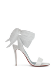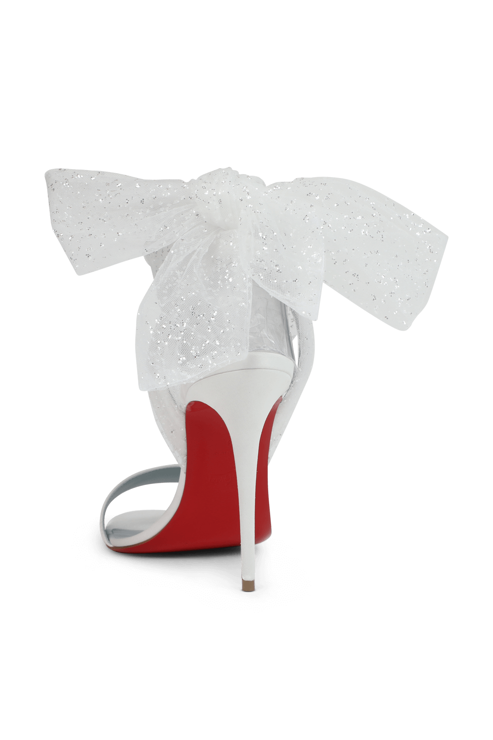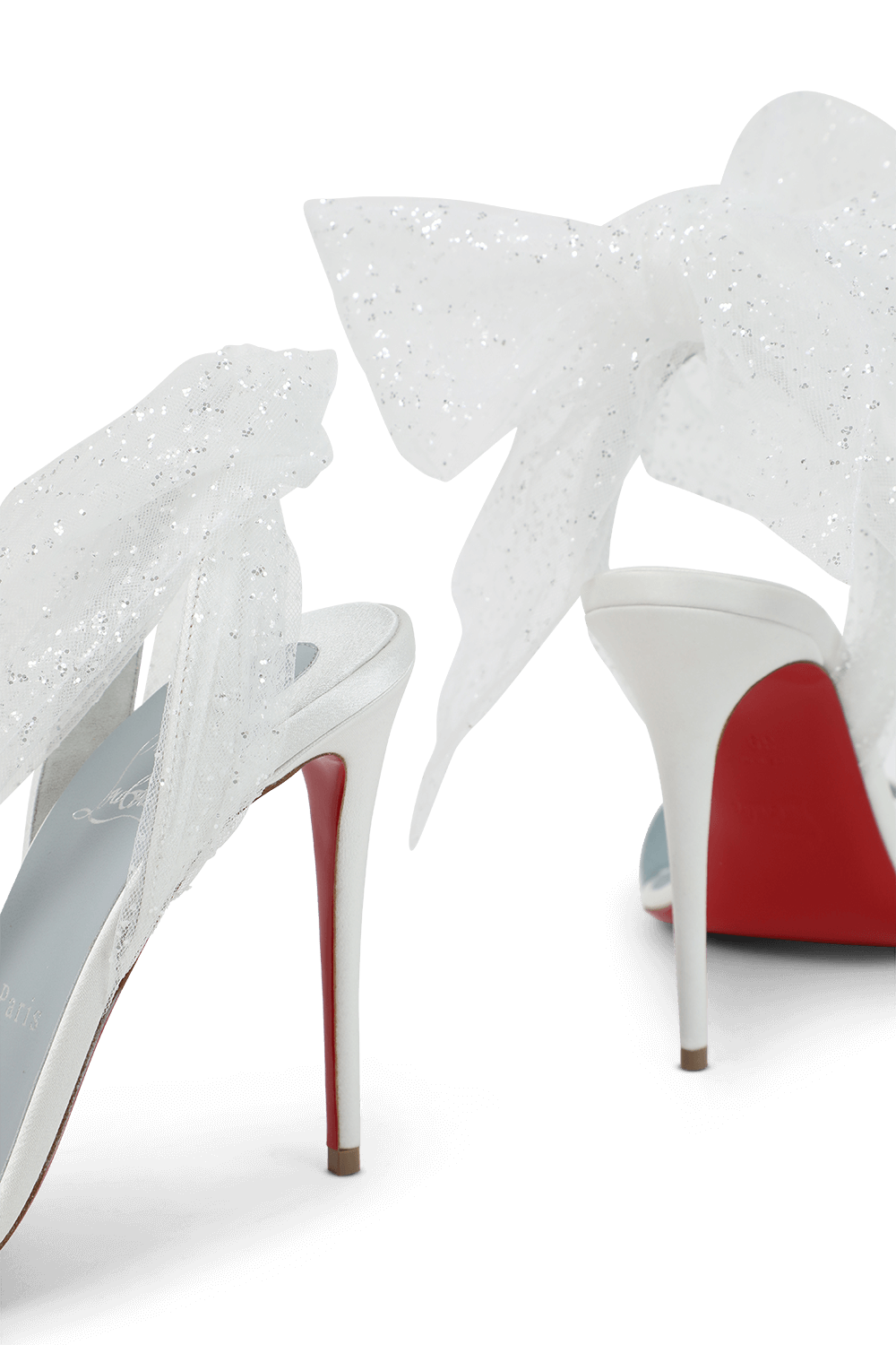 סנדלי עקב נוטפי שיק בעיצוב בית האופנה האייקוני כריסטיאן לבוטן. דגם העשוי תערובת משי משובחת בגוון לבן ומבריק. בד טול שקוף ומנצנץ נכרך מסביב לרגל לכדי פפיון אוברסייז ויוצר מראה ייחודי ומהפנט. זוג זה בעל עקב סטילטו דקיק ומחמיא בעוד סוליה תחתונה בגוון אדום - סימן ההיכר של הבית - חותמת את סגנונו היוקרתי והטיימלס. מדובר בזוג חושני ונשי אשר יקפיץ באולטרה שיק ממש כל לוק שתבחרי ללבוש.