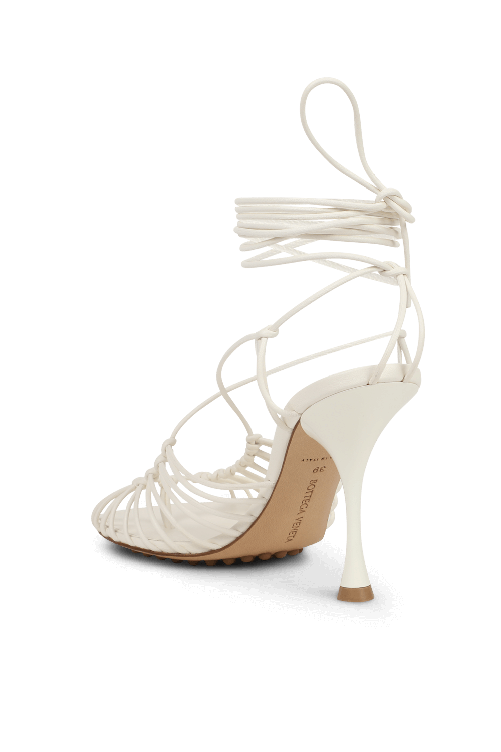 סנדלי עקב בעיצוב מתוחכם ונוטף סטייל מבית Bottega Veneta. זהו דגם לבן המציג צללית עגולה הכוללת רצועות דקות בשייפ ייחודי לאורך החזית, כמו גם רצועה הנכרכת סביב הקרסול המעניקה לרגל מראה חושני ונחשק. סוליות העור הכוללות בתחתיתן קוביות גומי- מבטיחות נוחות ומונעות החלקה אבל גם מקנות לנעליים טוויסט מודרני ובועט שמקפיץ את עיצובן המוביל והסקסי. מדובר בפריט על שישדרג לך בקלות מגוון לוקים לשעות היום או הלילה.