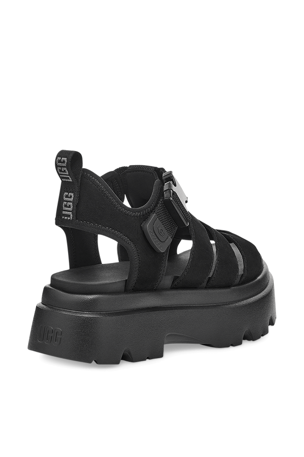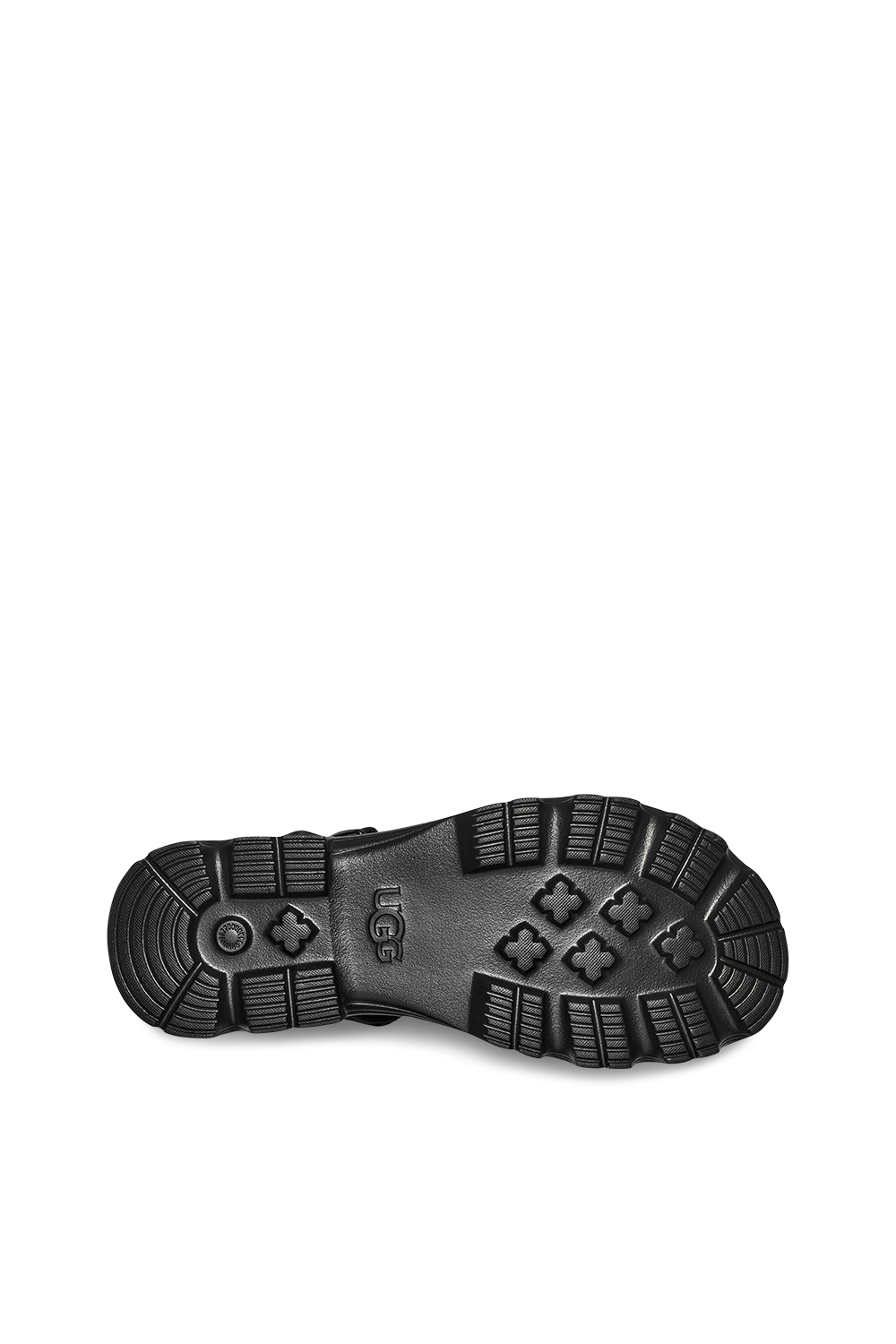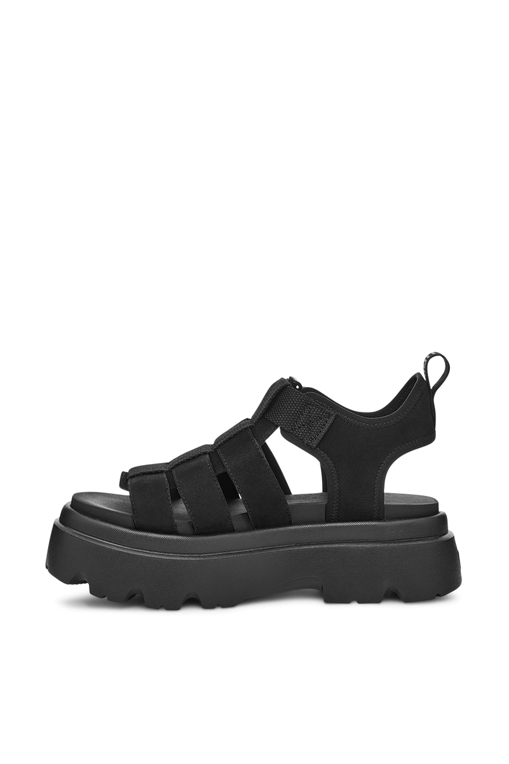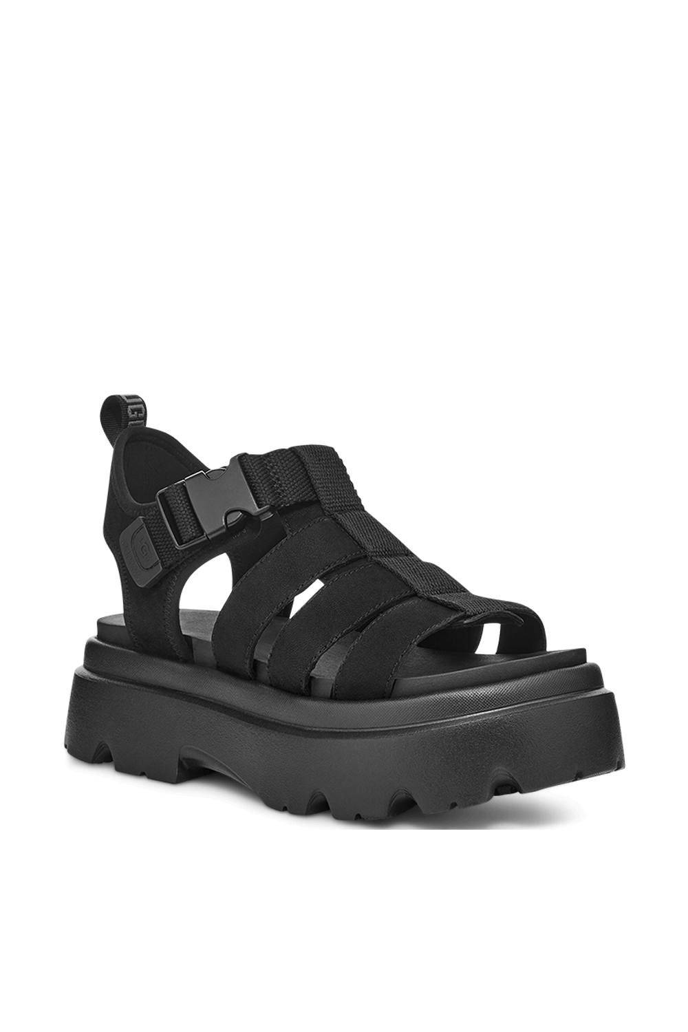 סנדלים דגם Cora מבית UGG, עם רצועות עור נובוק ופוליאסטר ממוחזר בצבע שחור, הנסגרות בסוגר קליק. יש להם סוליית פלטפורמה ארגונומית עשויה קצף EVA המעניק תמיכה לכף הרגל בעת ההליכה, ו-SugarSole™ העשוי תערובת קנה סוכר ומאפשר להפחית את התלות בדלק מאובנים.