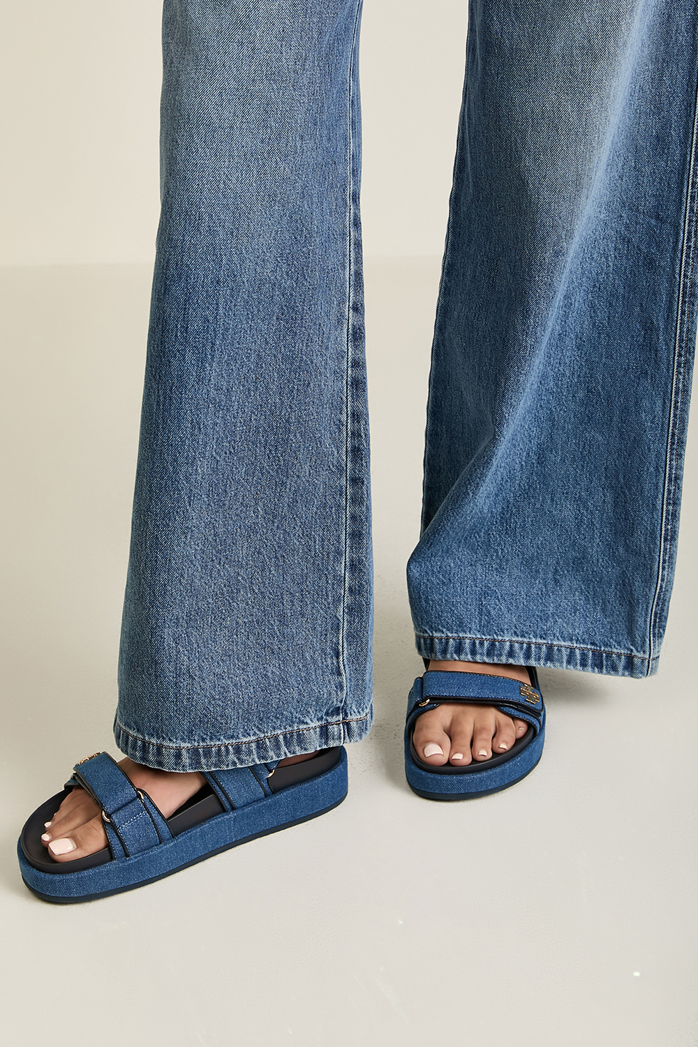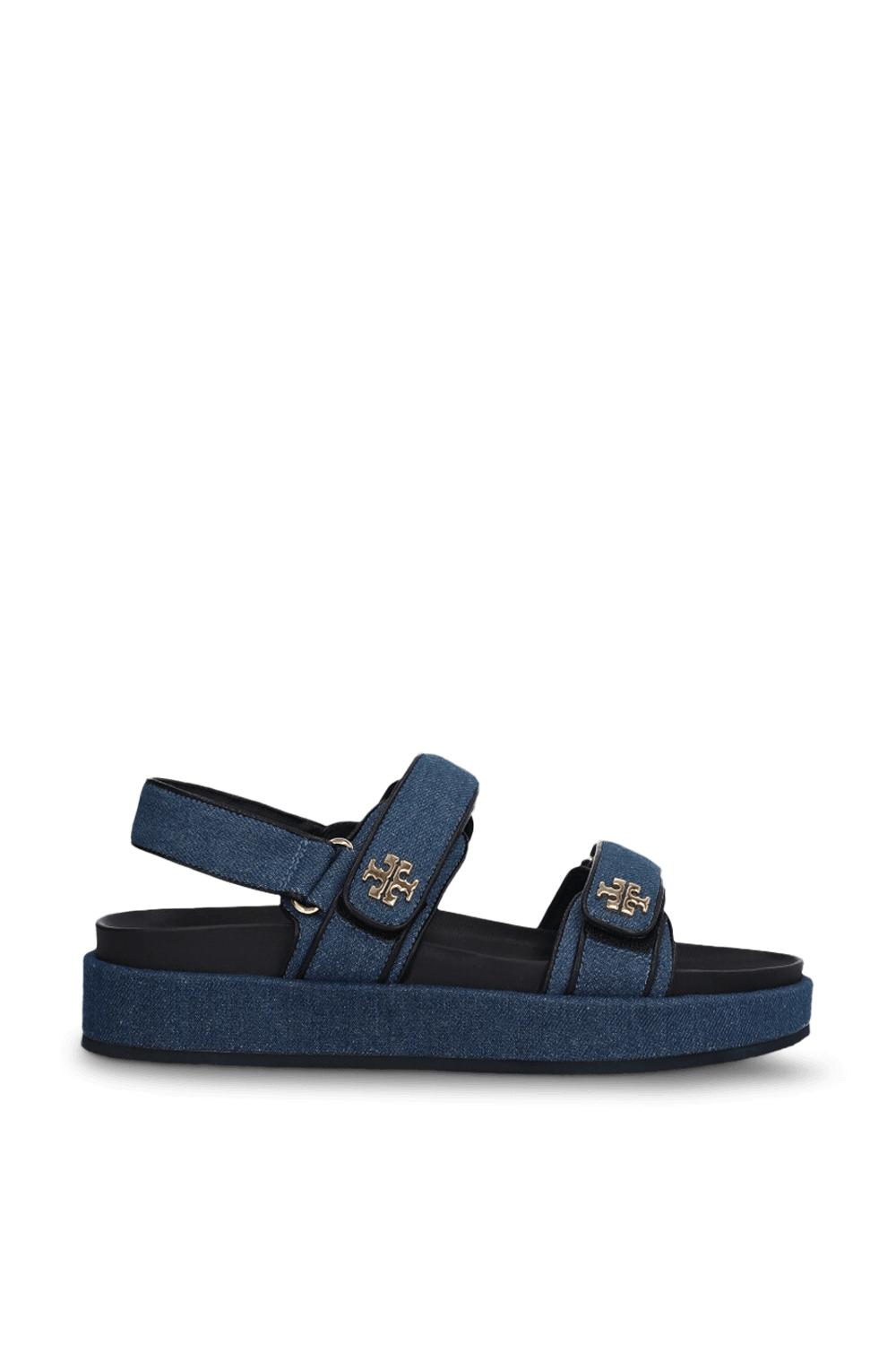 סנדלים Kira Sport מבית Tory Baruch, עשויים כותנת דנים בגימורי עור, עם רצועות סקוץ` מתכוננות.
