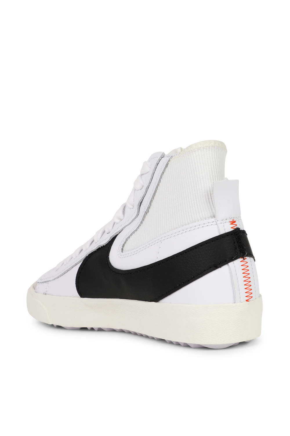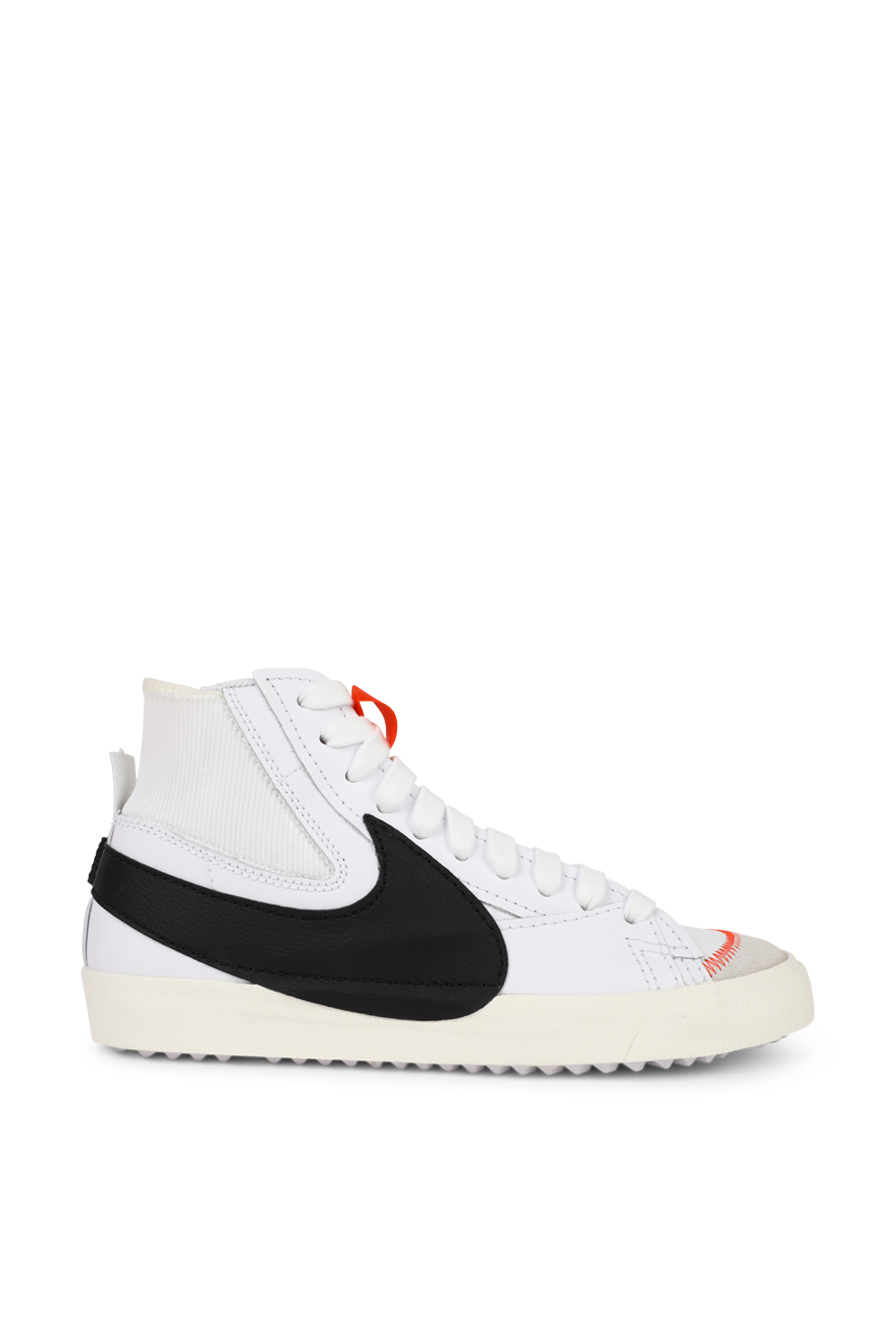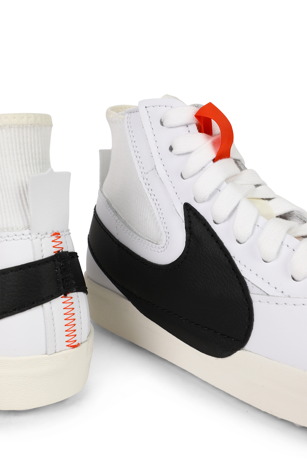 נעלי סניקרס בעיצוב ענקית הספורט האופנתית Nike מדגם Blazer Mid 77 Jumbo, העשויות עור משובח ולבן בסגנון וינטג` . לפריט רכיסה גבוהה וצללית קלאסית, כאשר לוגו המותג מעטר את צידי הגפות בנגטיב שחור בסגנון סטריט. סריגת גרב אחורית לצד פאץ` עור עם תיפורי זיגזג אדומים מעניקים טוויסט גרפי.