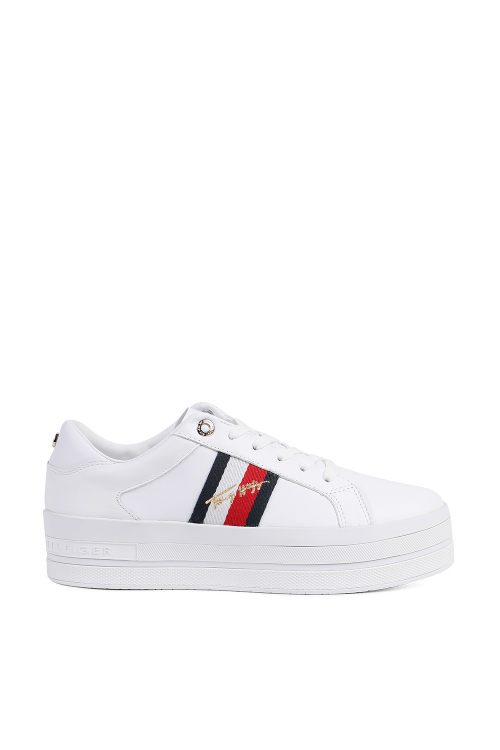 סניקרס לבנות מבית האופנה האמריקאי טומי הילפיגר. אלו נעליים העשויות מ-100% עור איכותי עם סולייה צ׳אנקית המעניקה לרגל מראה מחמיא. בצדדי הגפות מתנוססת רקמת פסים בצבעי הדגל של בית האופנה - כחול, לבן ואדום וחתימת המעצב הרקומה בגוון זהוב. מדובר בנעל שתקפיץ לך כל לוק.