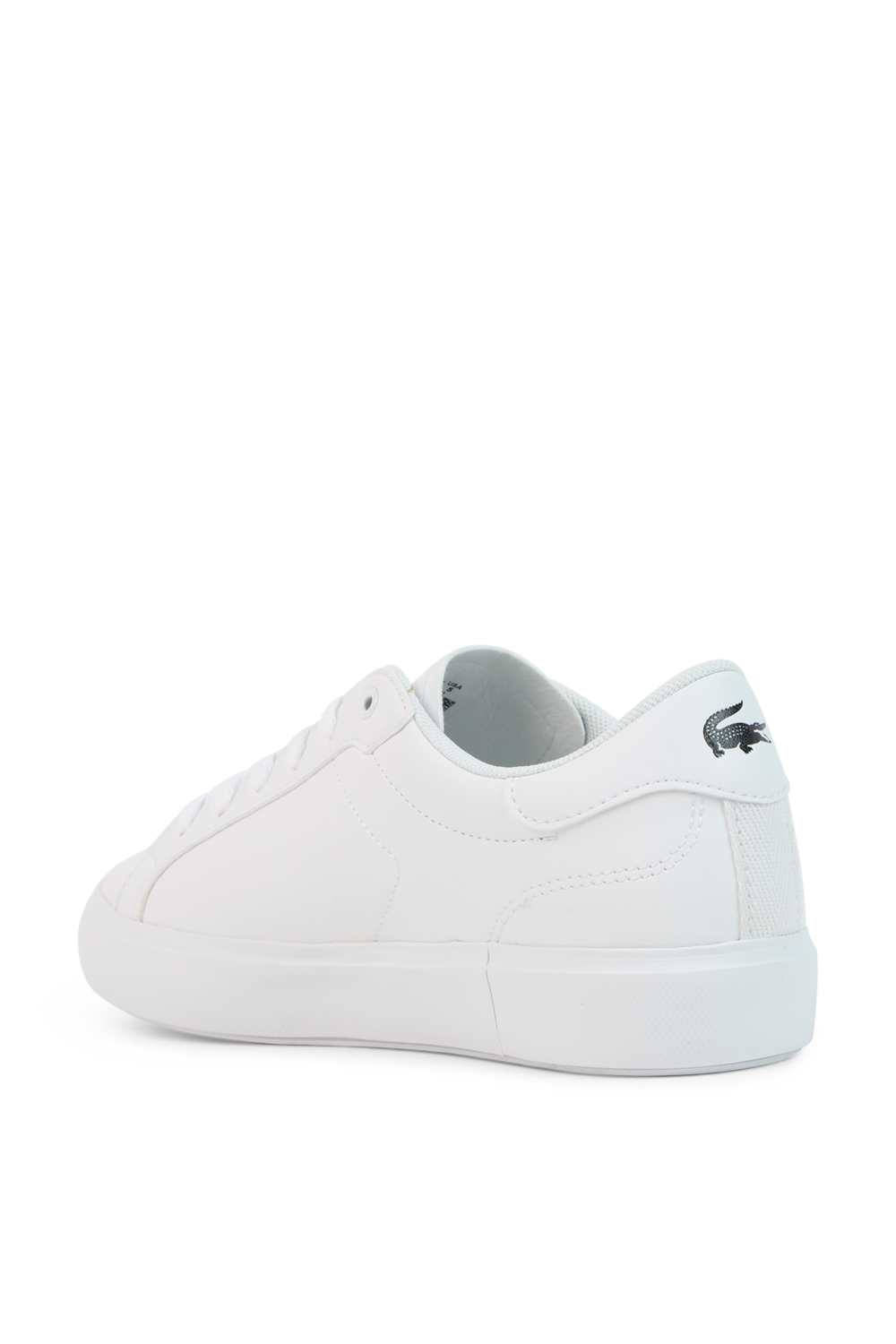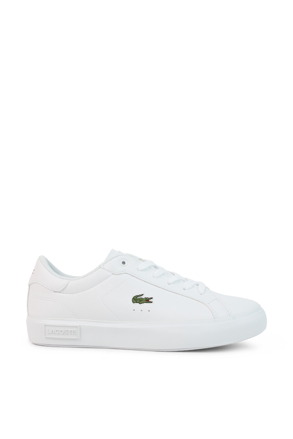 סניקרס מדגם Power Court בעיצוב בית האופנה Lacoste העשויות טקסטיל בצבע לבן עם סוליות גומי ושרוכים. לוגו התנין רקום בצדי הגפות.