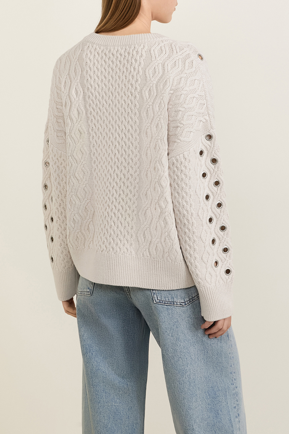 סריג בגזרת אוברסייז מבית Rag&Bone, עשוי כותנה בצבע בז' בשילוב צווארון מעוגל ובמראה חורי עיגול עם בסיס כסוף.