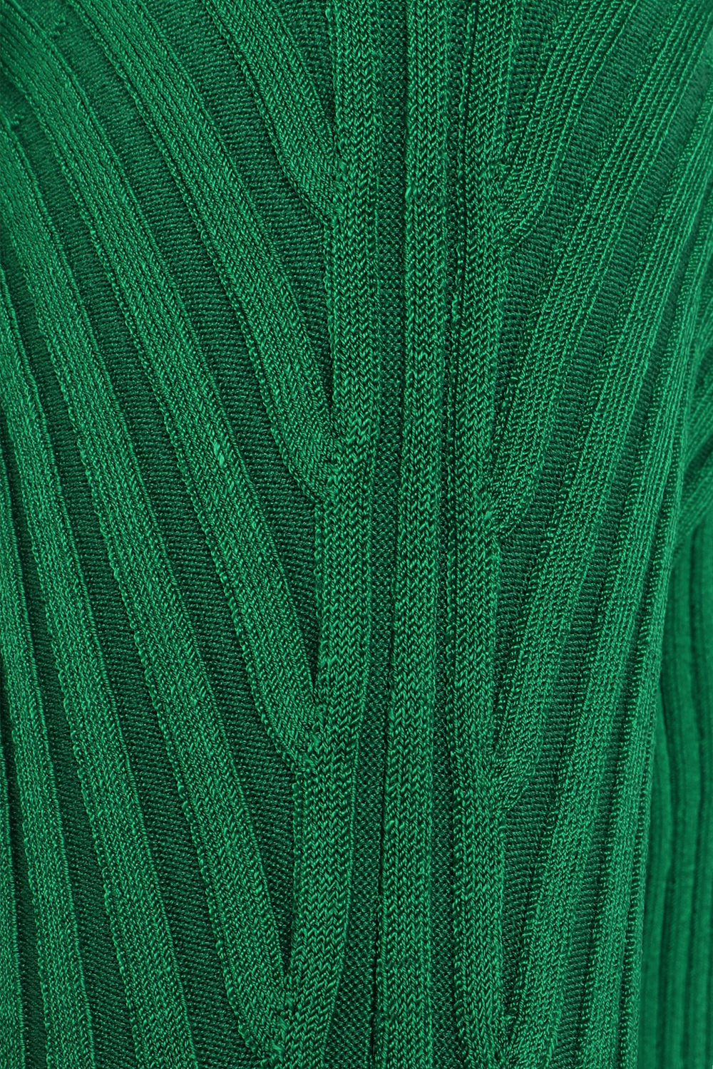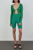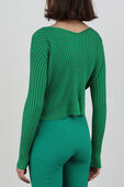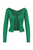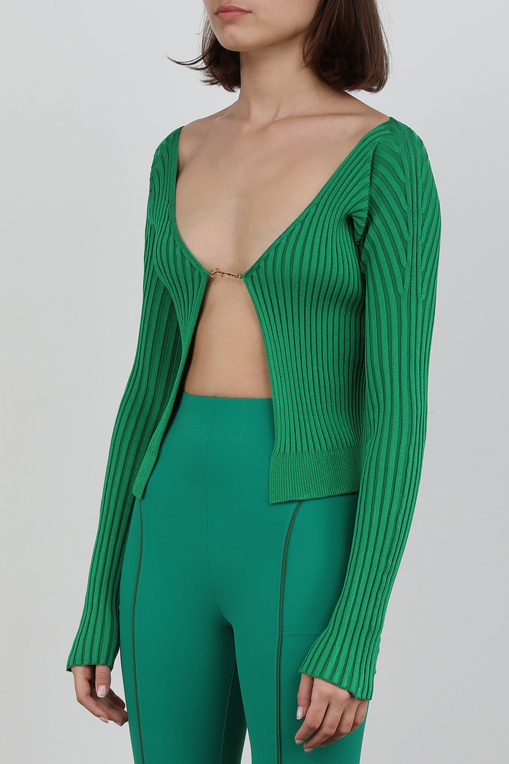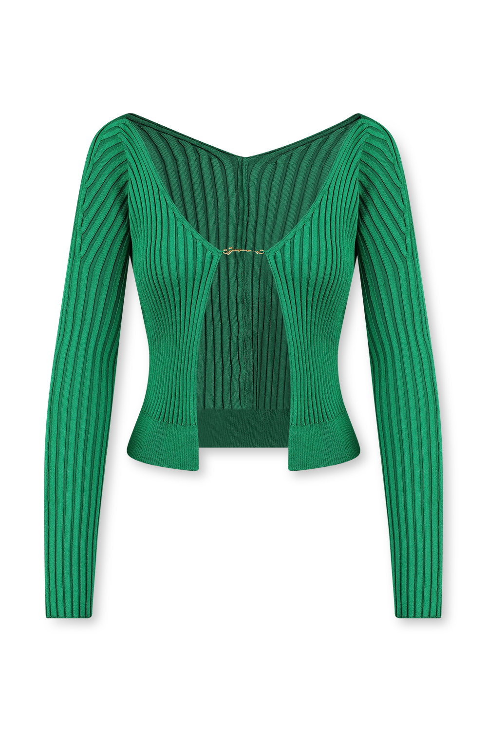סריג מבית האופנה הרותח JACQUEMUS. זהו דגם העשוי תערובת ויסקוזה משובחת בסריגת ריב בגוון ירוק עם שרוולים ארוכים. לפריט גזרת קרופ מחמיאה ופתוחה כשאר שני צדדיו מחוברים באמצעות אלמנט מטאלי מוזהב וממותג המעניק טאץ` נשי לסריג.