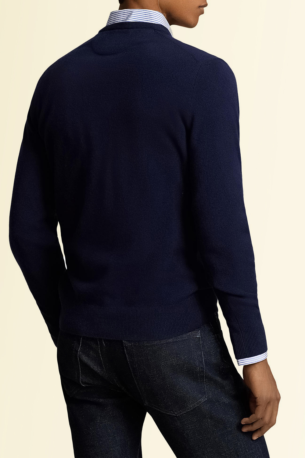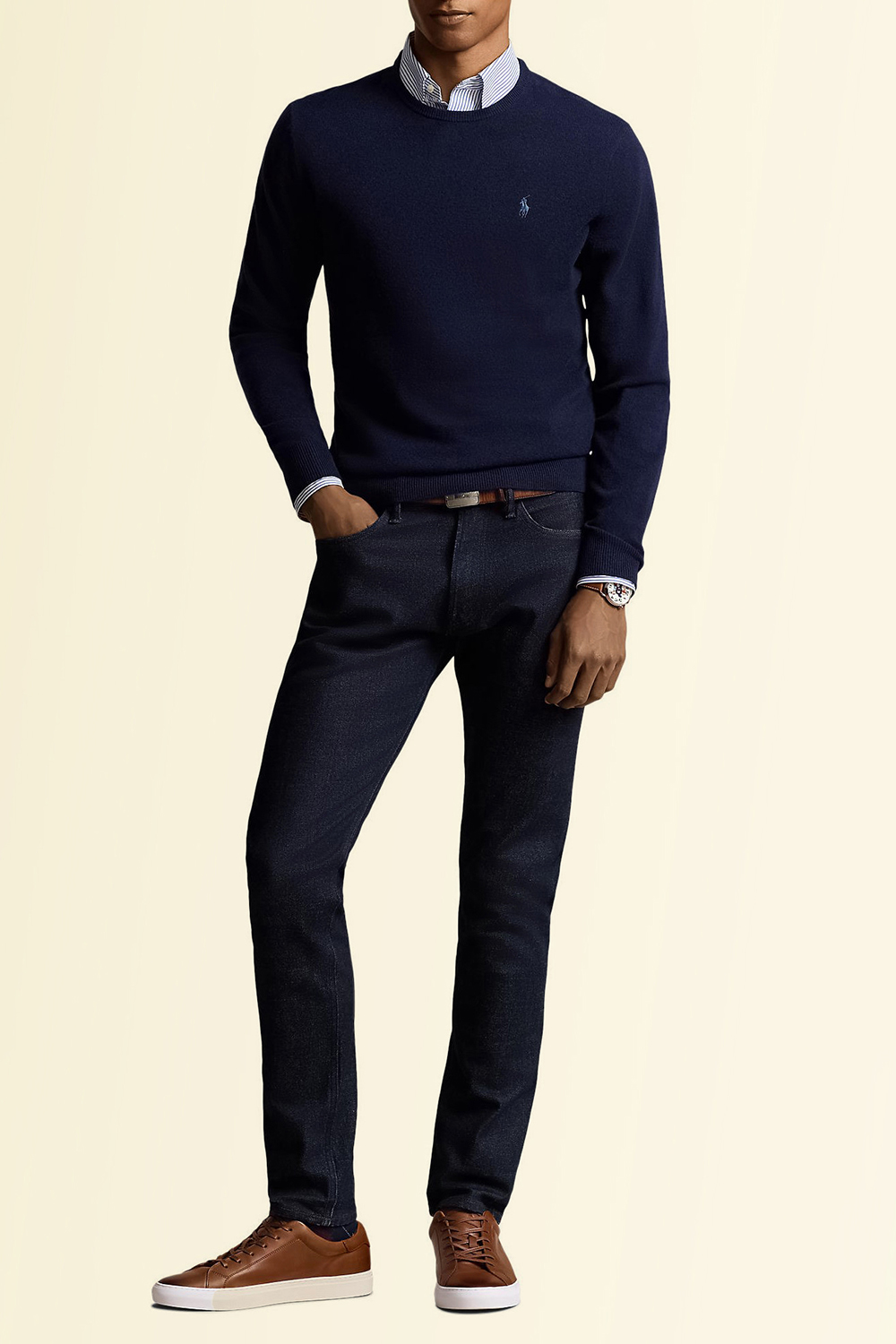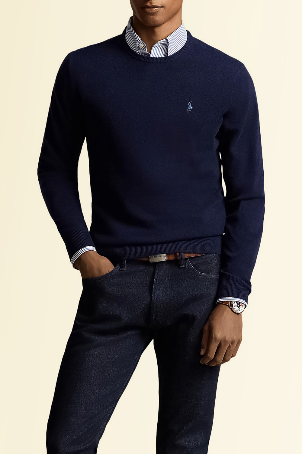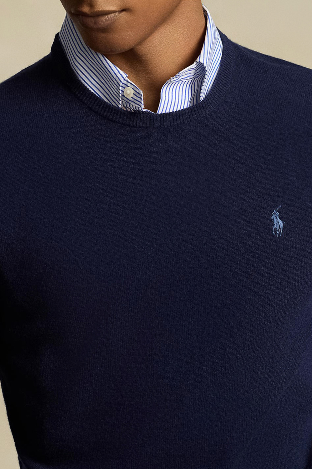 סריג מבית Polo Ralph Lauren, עשוי צמר בצבע כחול בשילוב צווארון מעוגל עם רקמת לוגו המותג בצד החזה.