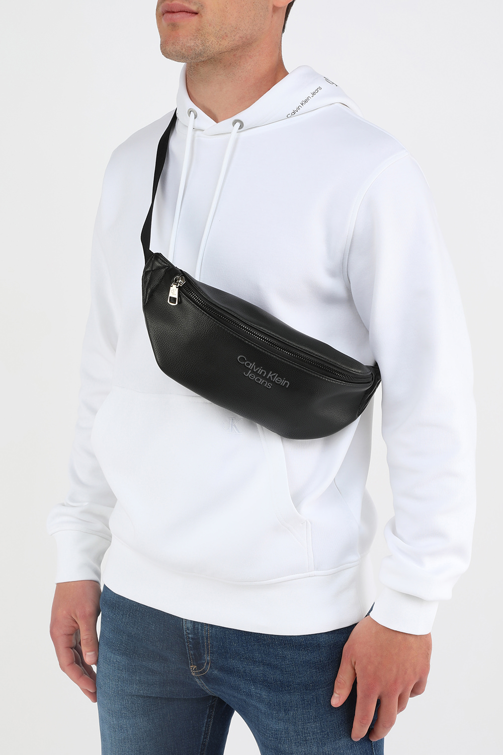 תיק פאוץ` מבית קלווין קליין האמריקאי. זהו דגם במראה עור חלק בגוון שחור. לפריט צללית קלאסית עם רצועה מתכווננת להתאמה מקסימלית וחלוקת תאים פרקטית ונוחה. אלמנט מטאלי בחיתוך לוגו המותג מוטבע בחזית לוגו וחותם את עיצובו השיקי והספורטיבי של אקססורי זה.